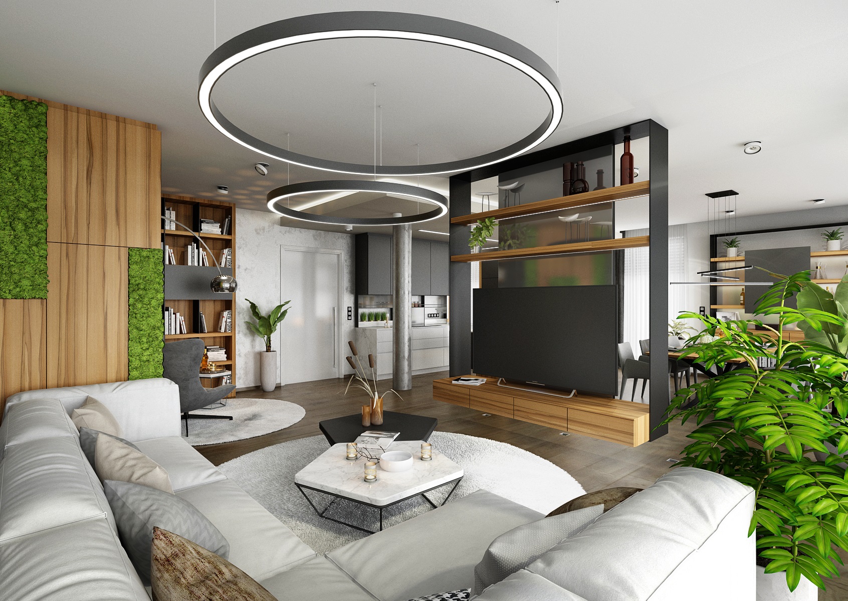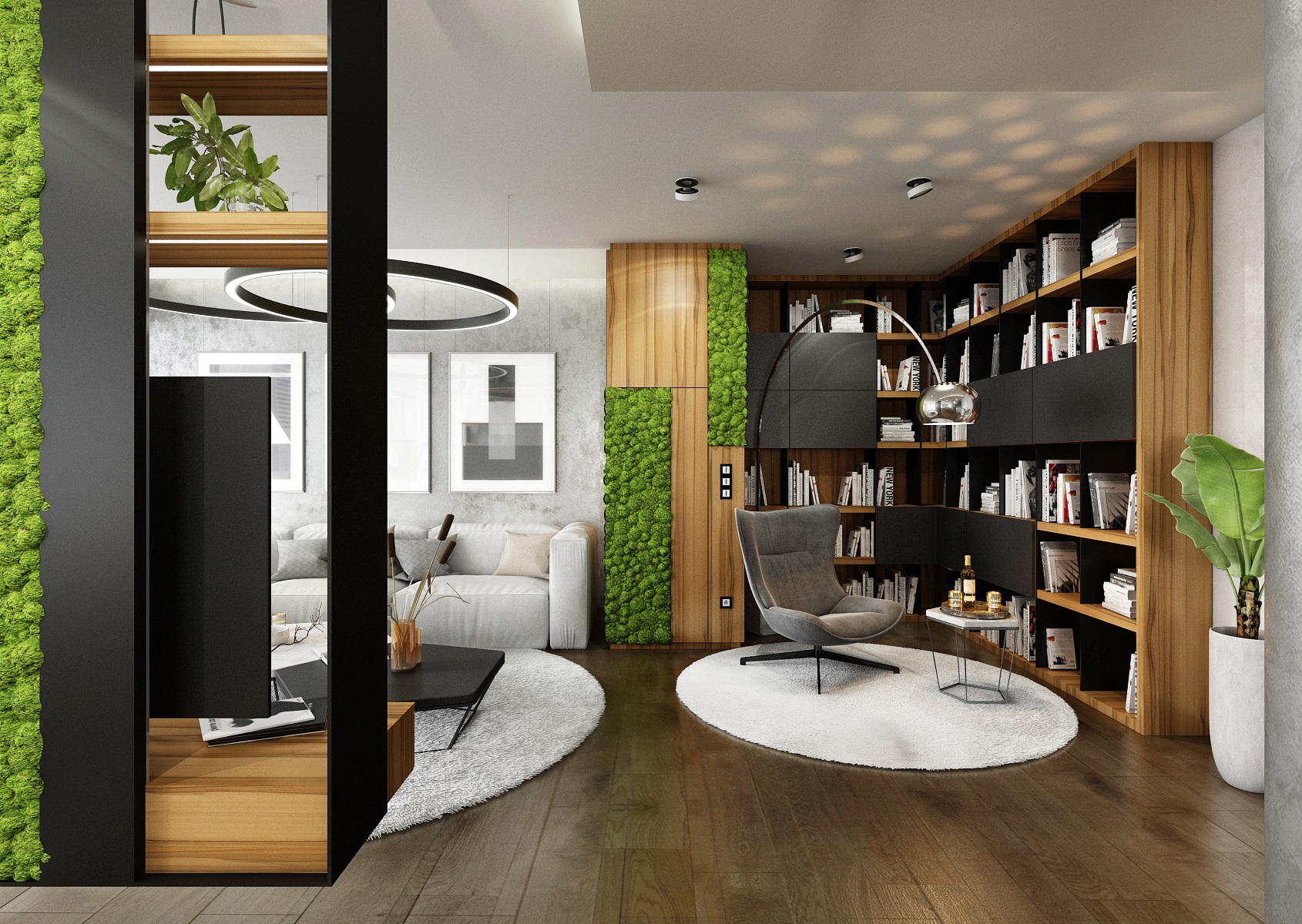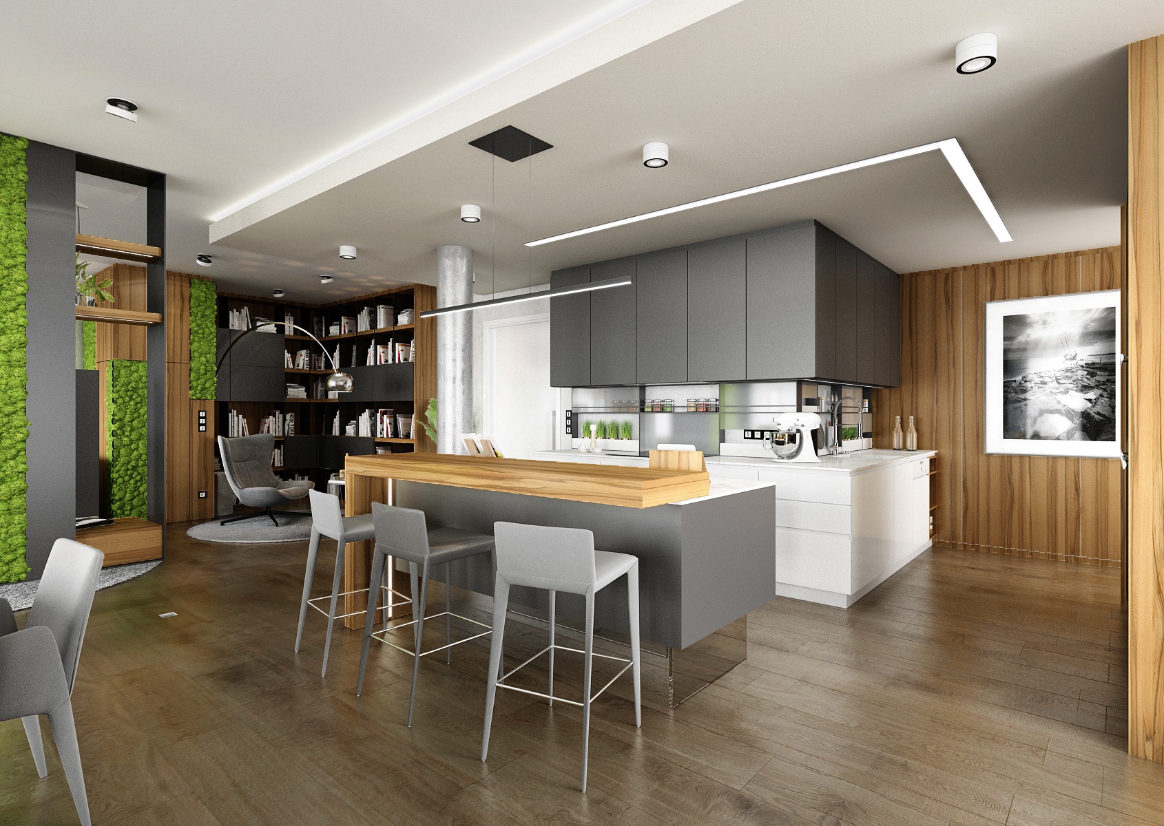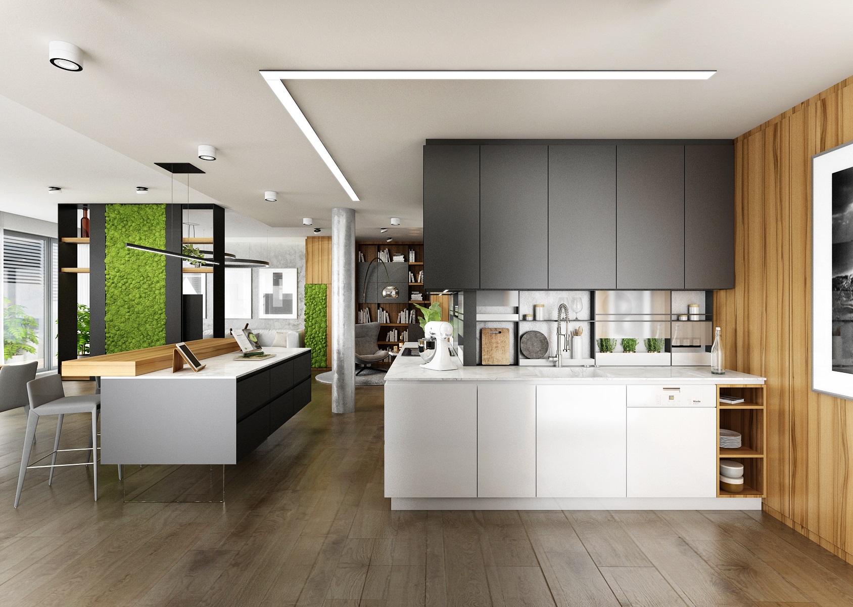 Návrh interiéru rezidenčního bytu jsme navrhli v ultramatové antracitovo-bílé kombinaci, ze které v kontrastu vystupují dílce v ořechové dýze a zelené panely s mumifikovaným mechem.