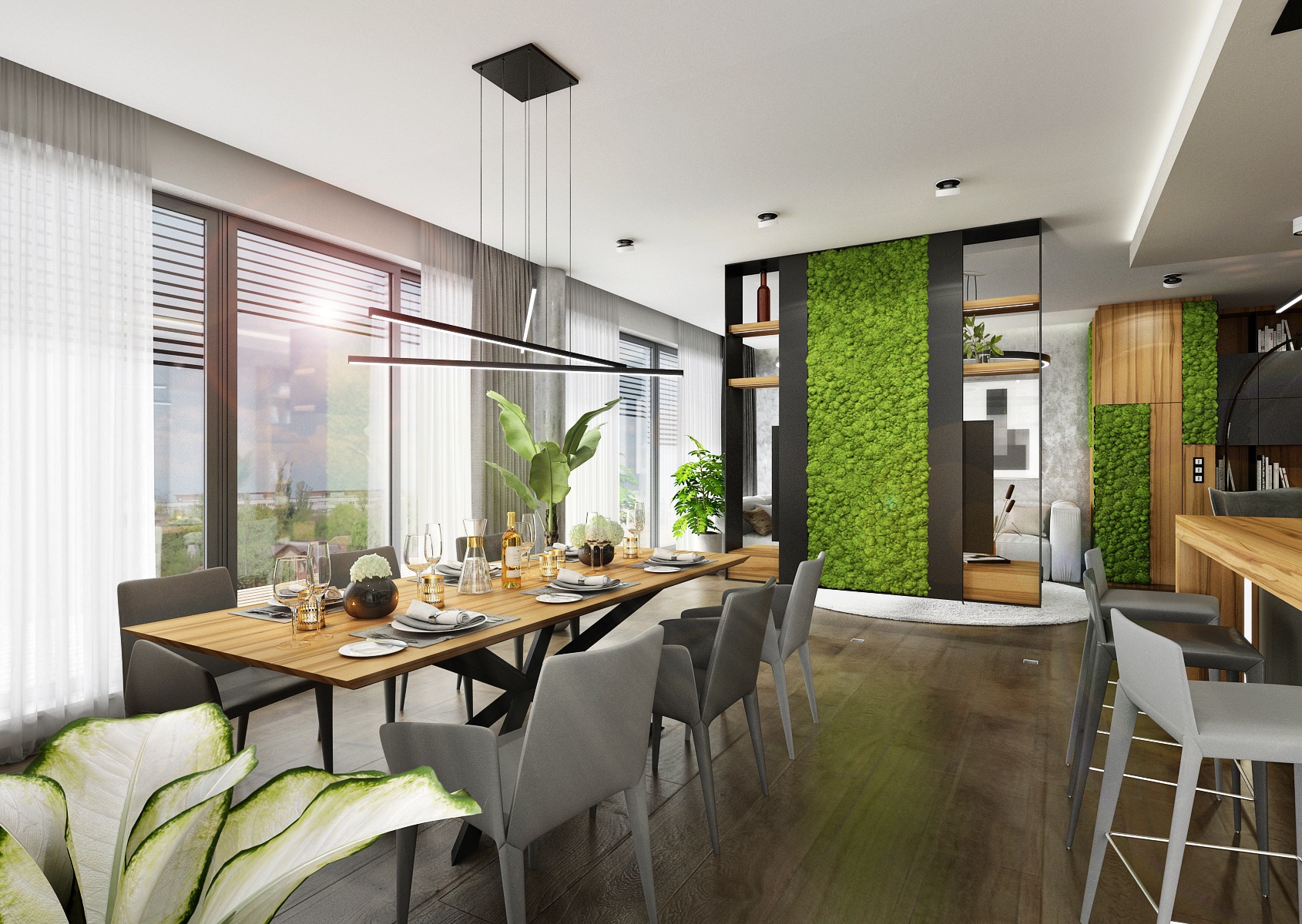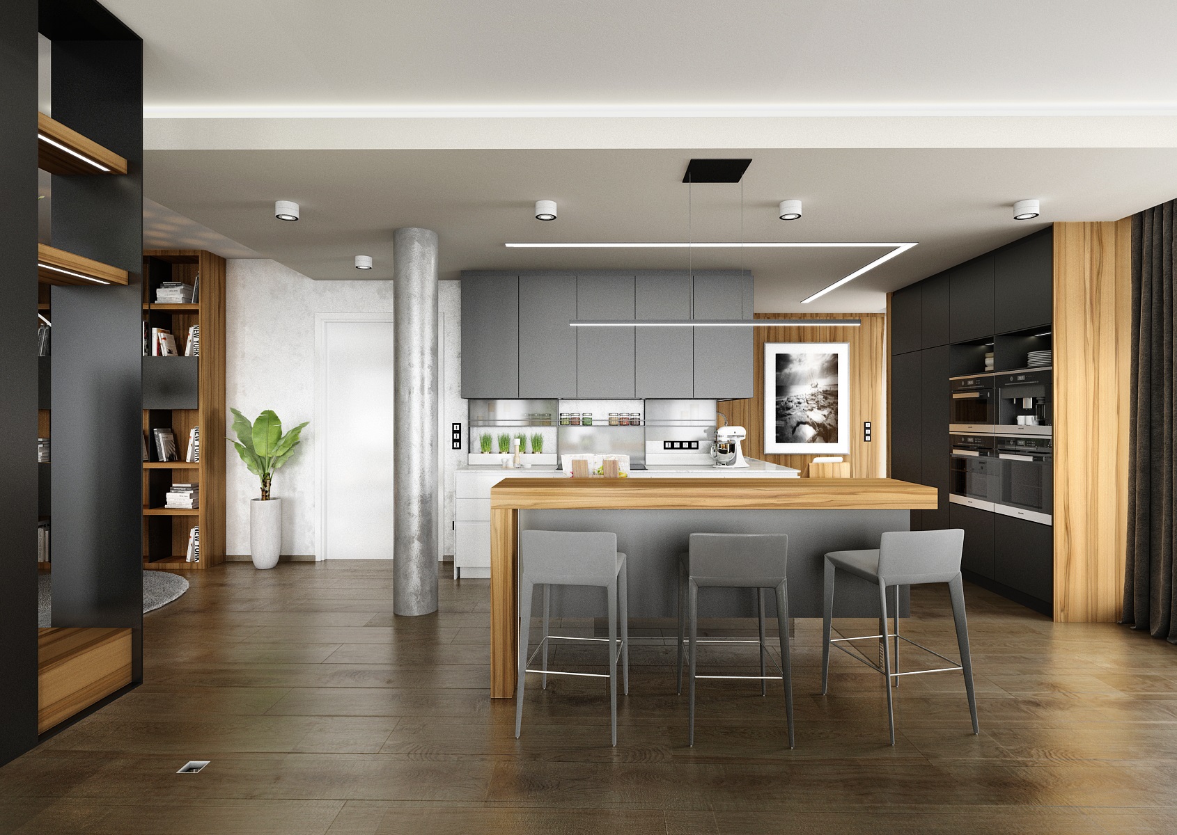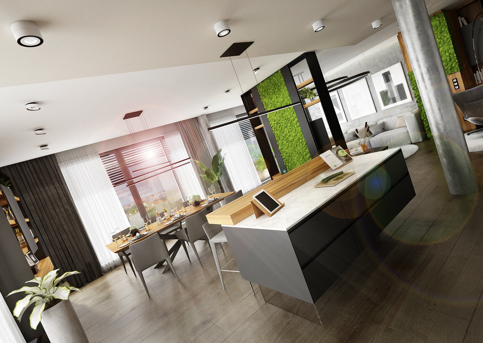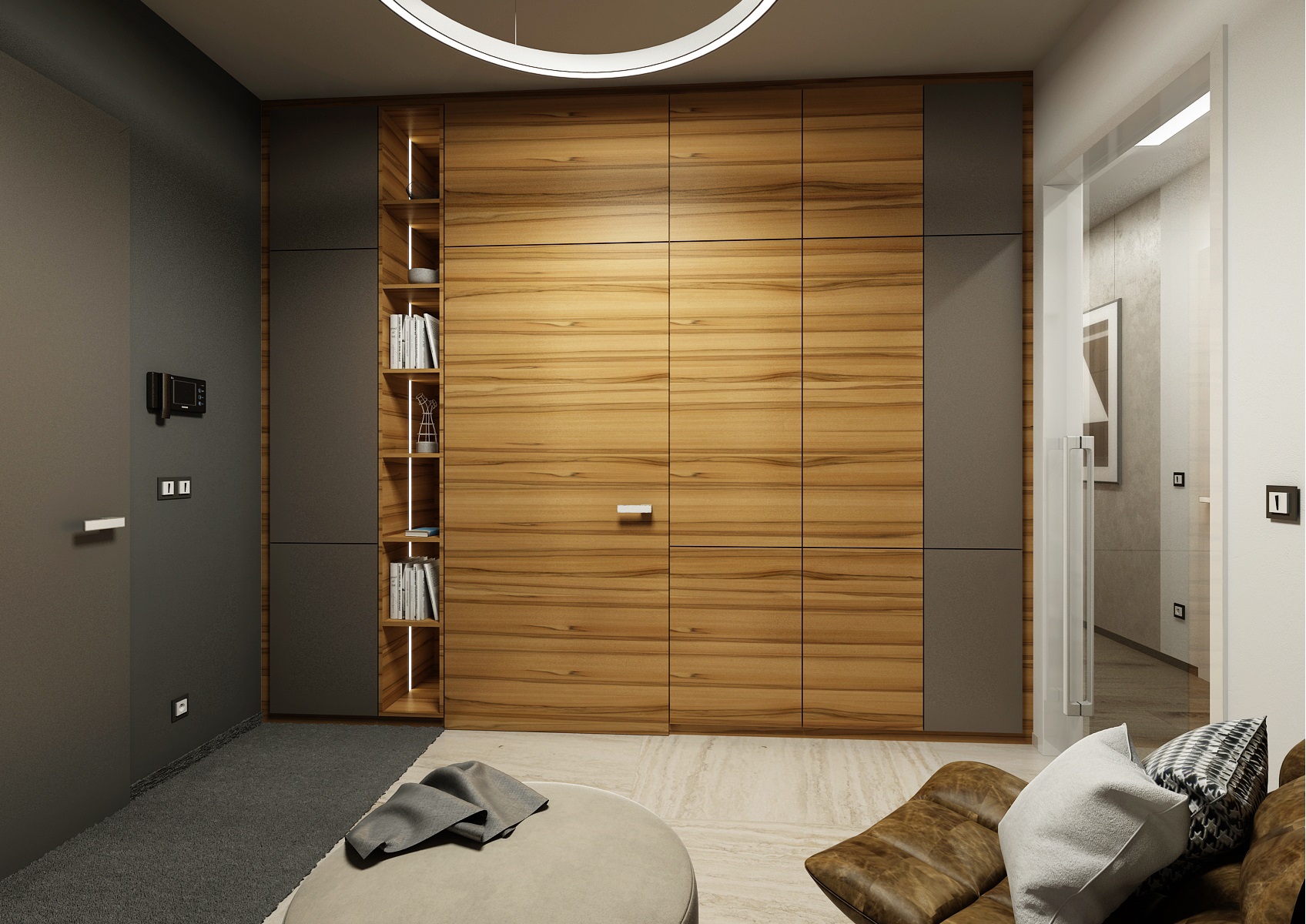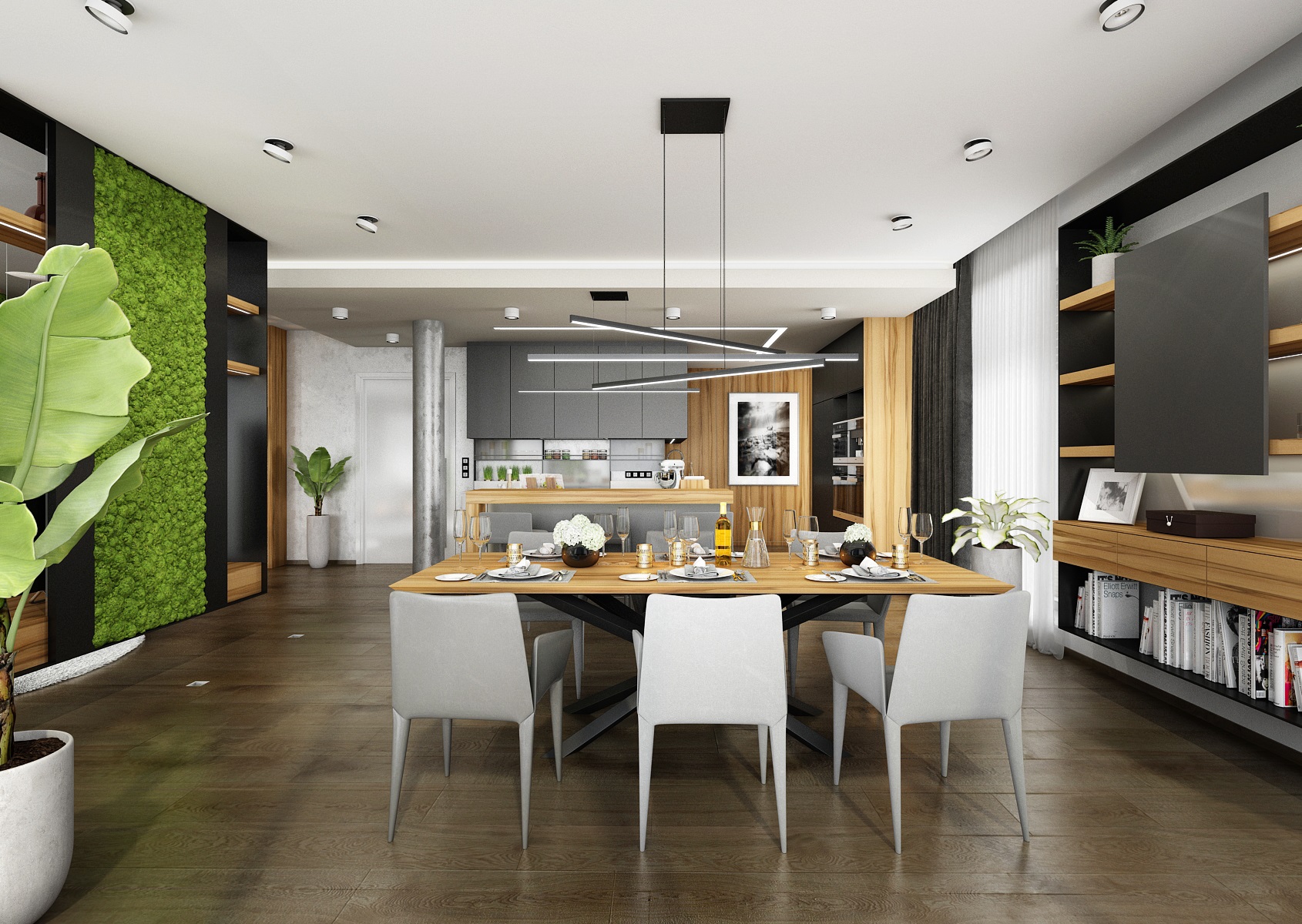 Návrh interiéru rezidenčního bytu jsme navrhli v ultramatové antracitovo-bílé kombinaci, ze které v kontrastu vystupují dílce v ořechové dýze a zelené panely s mumifikovaným mechem.