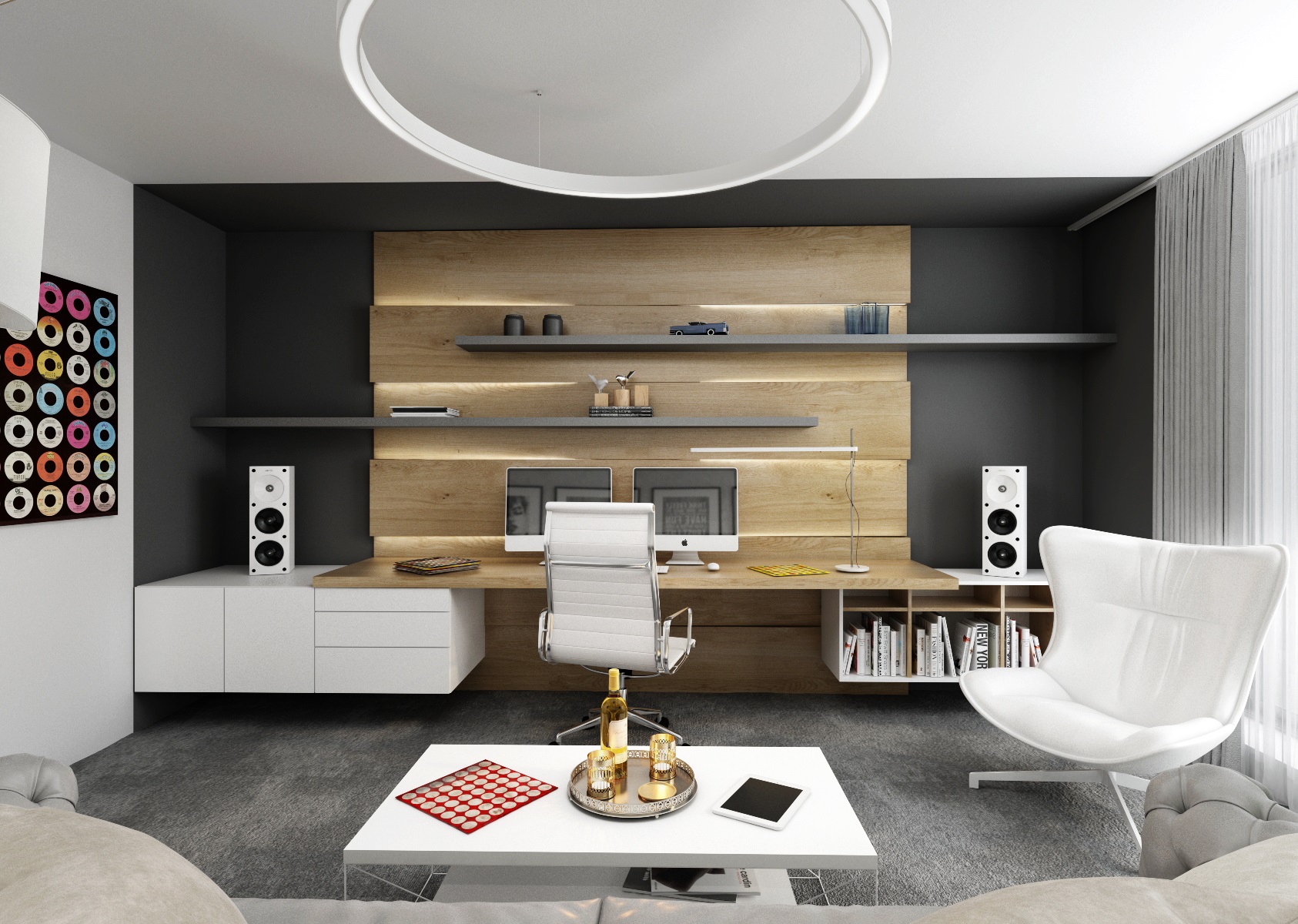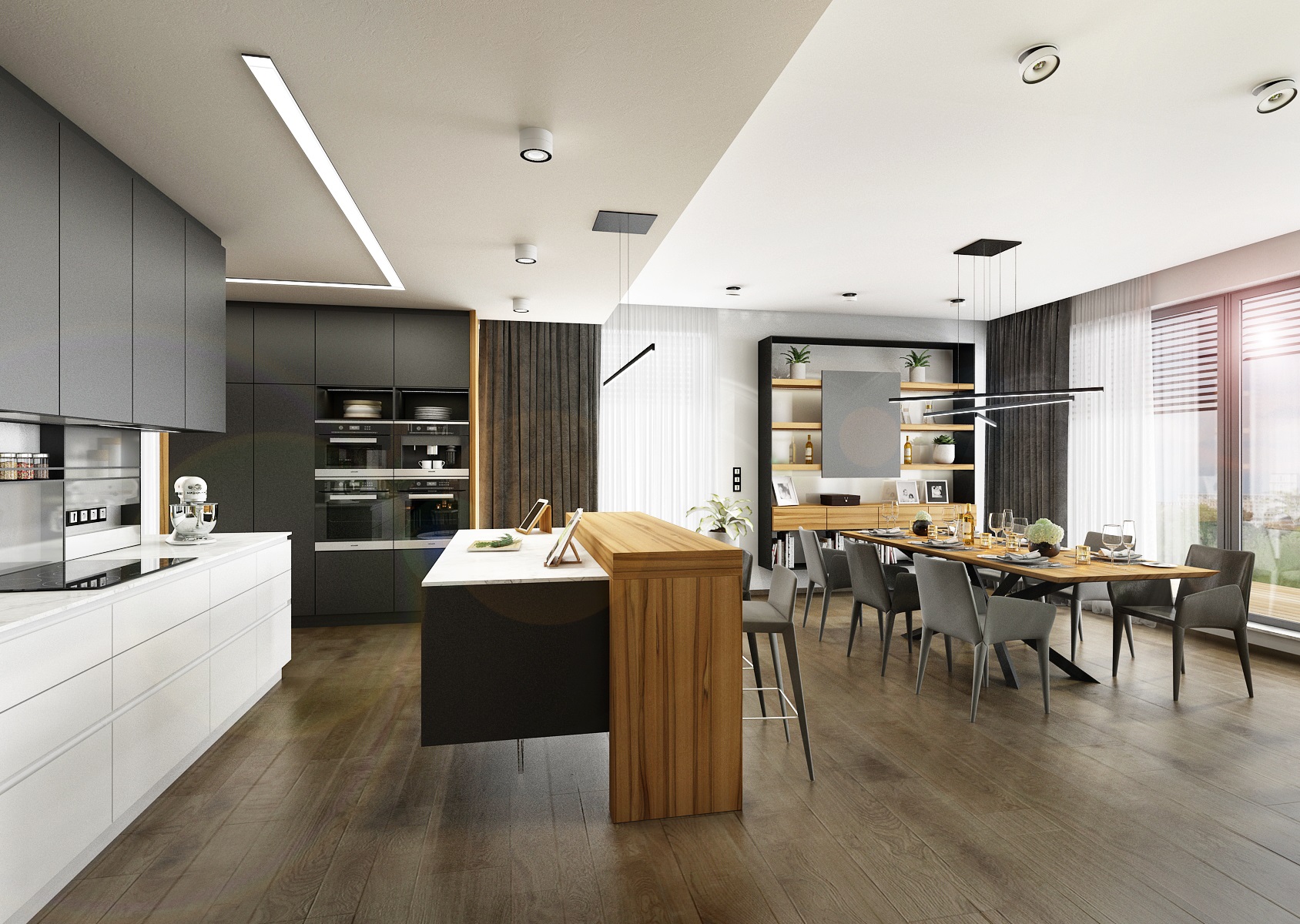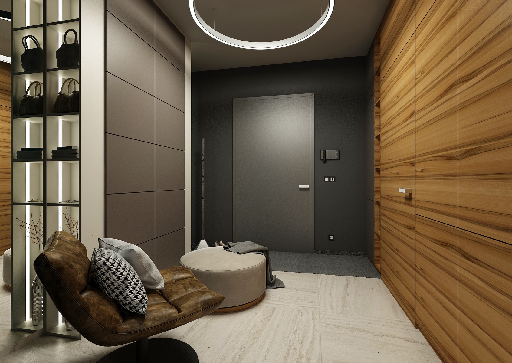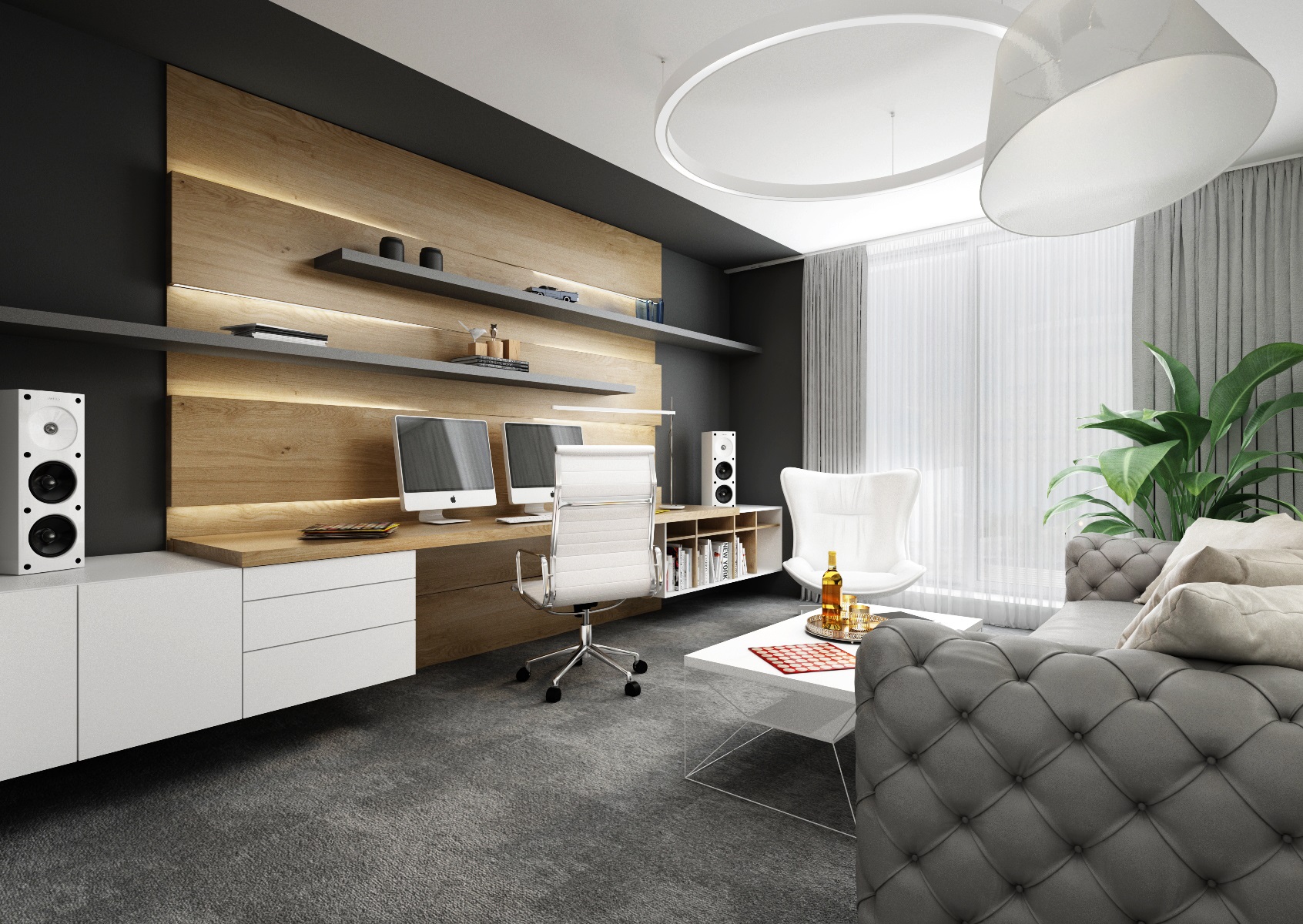 Návrh interiéru rezidenčního bytu jsme navrhli v ultramatové antracitovo-bílé kombinaci, ze které v kontrastu vystupují dílce v ořechové dýze a zelené panely s mumifikovaným mechem.