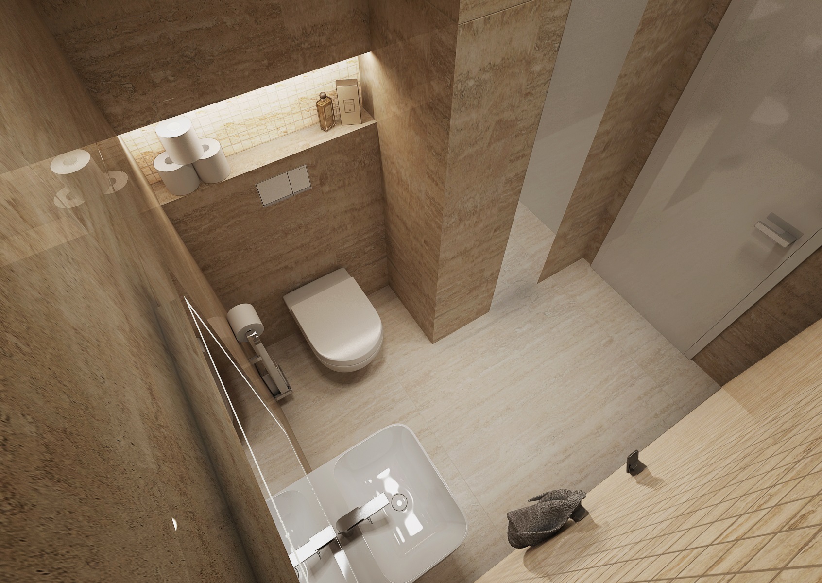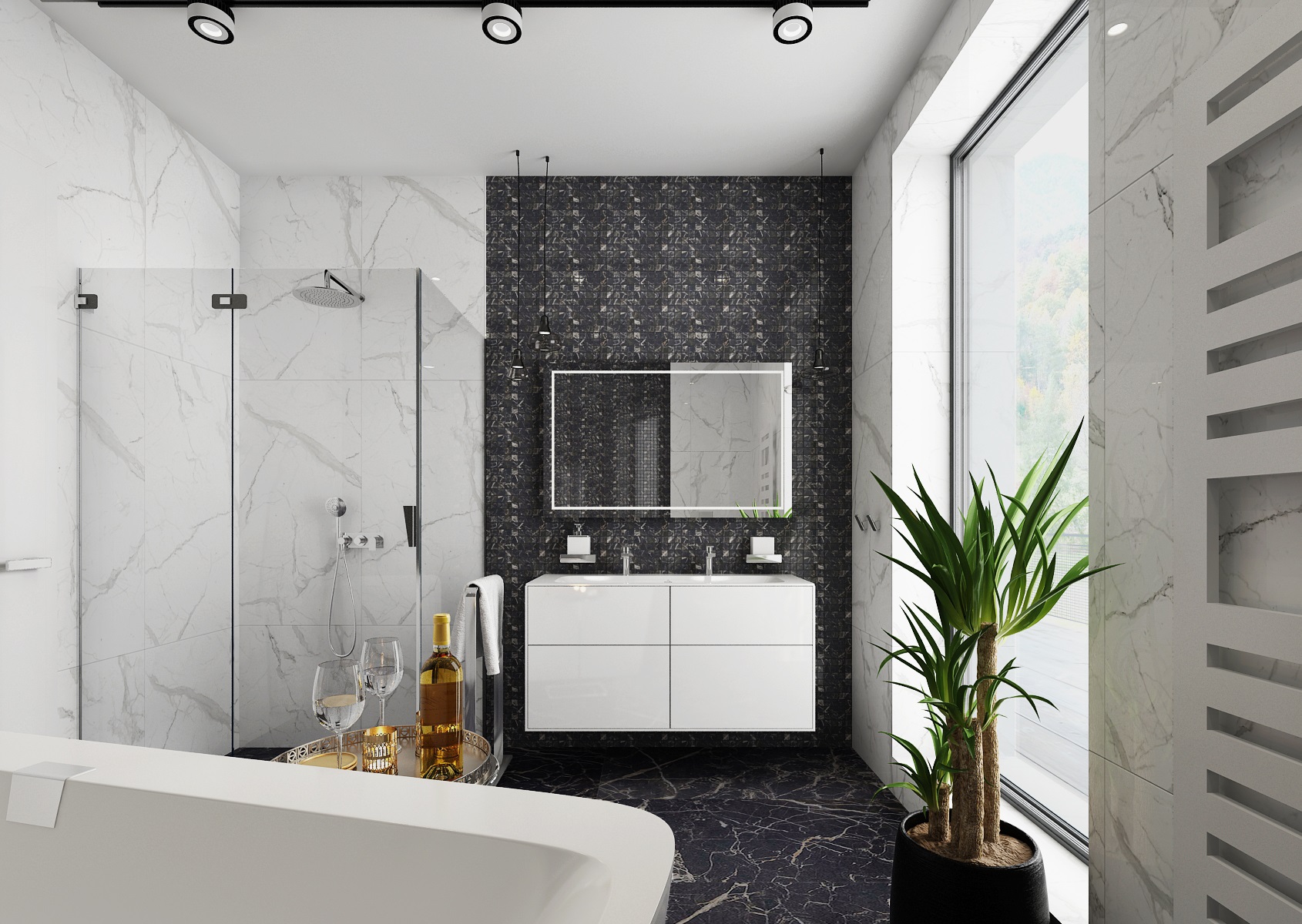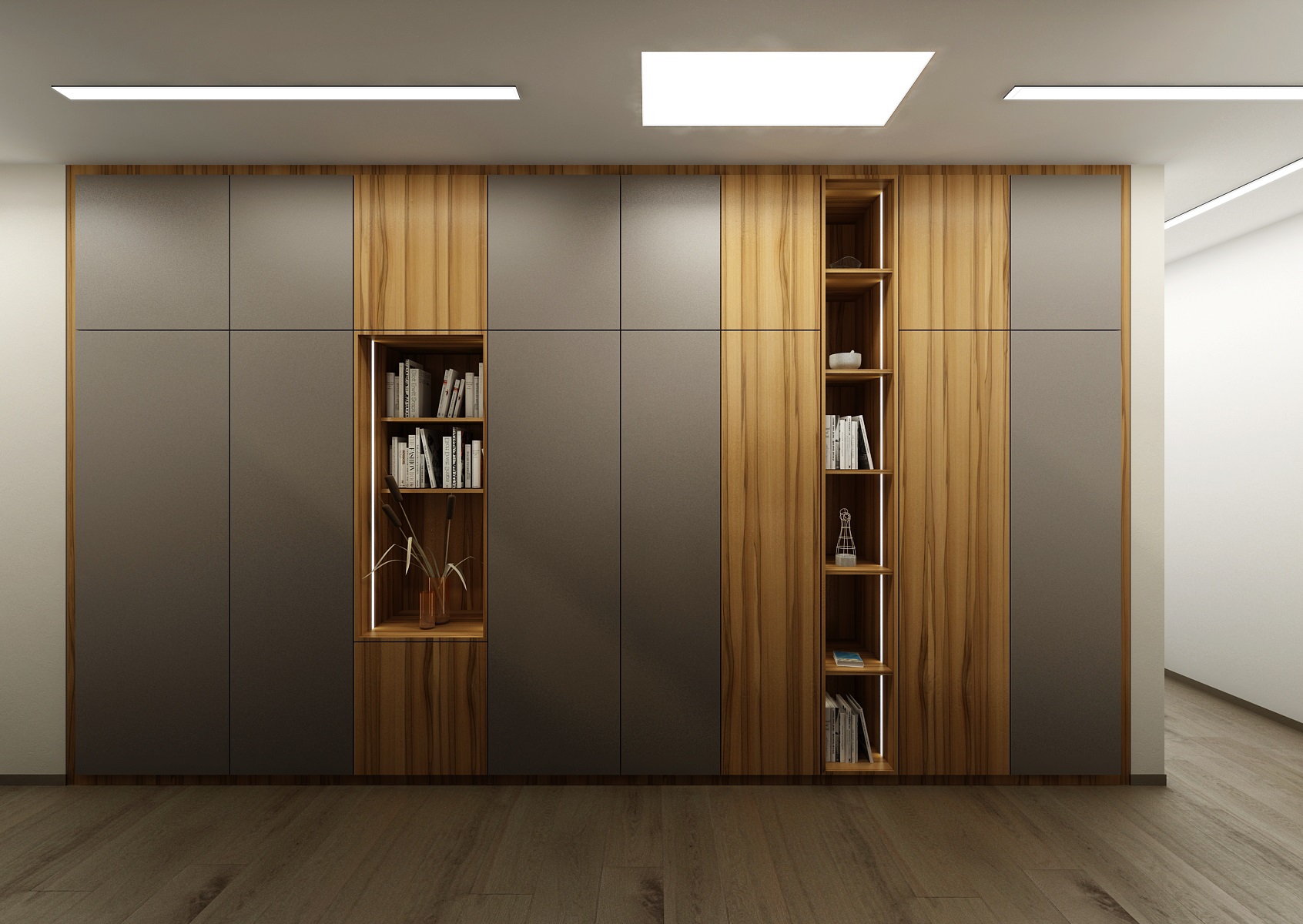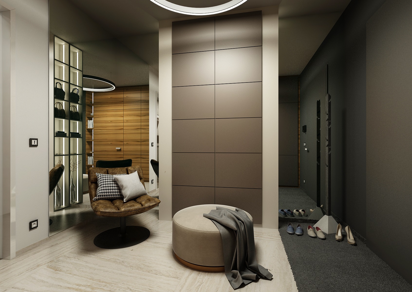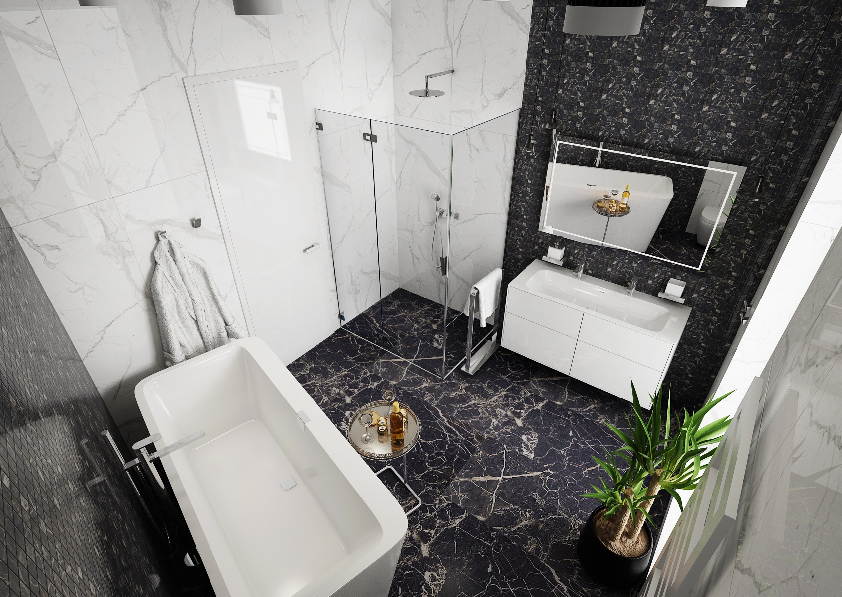 Návrh interiéru rezidenčního bytu jsme navrhli v ultramatové antracitovo-bílé kombinaci, ze které v kontrastu vystupují dílce v ořechové dýze a zelené panely s mumifikovaným mechem.