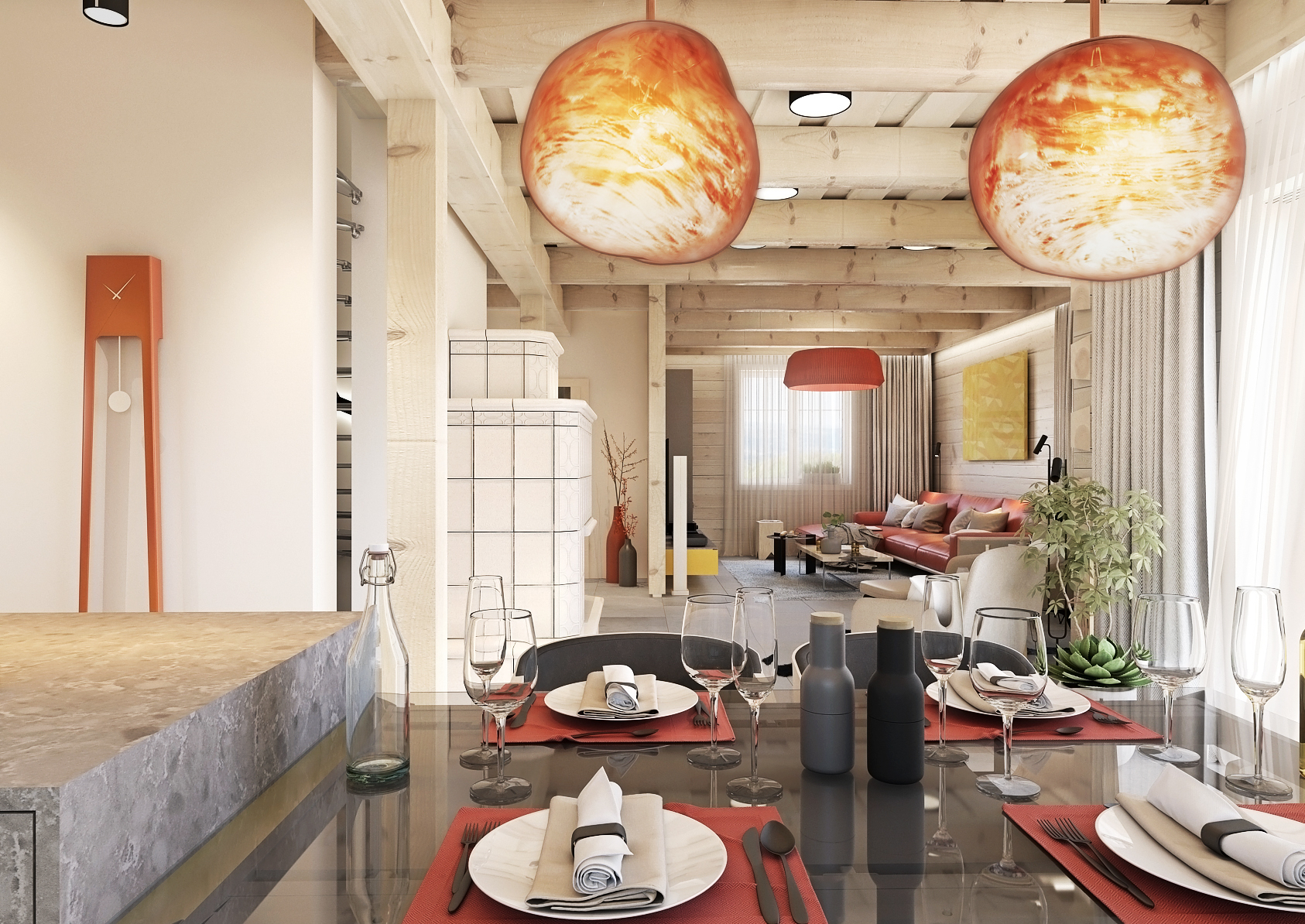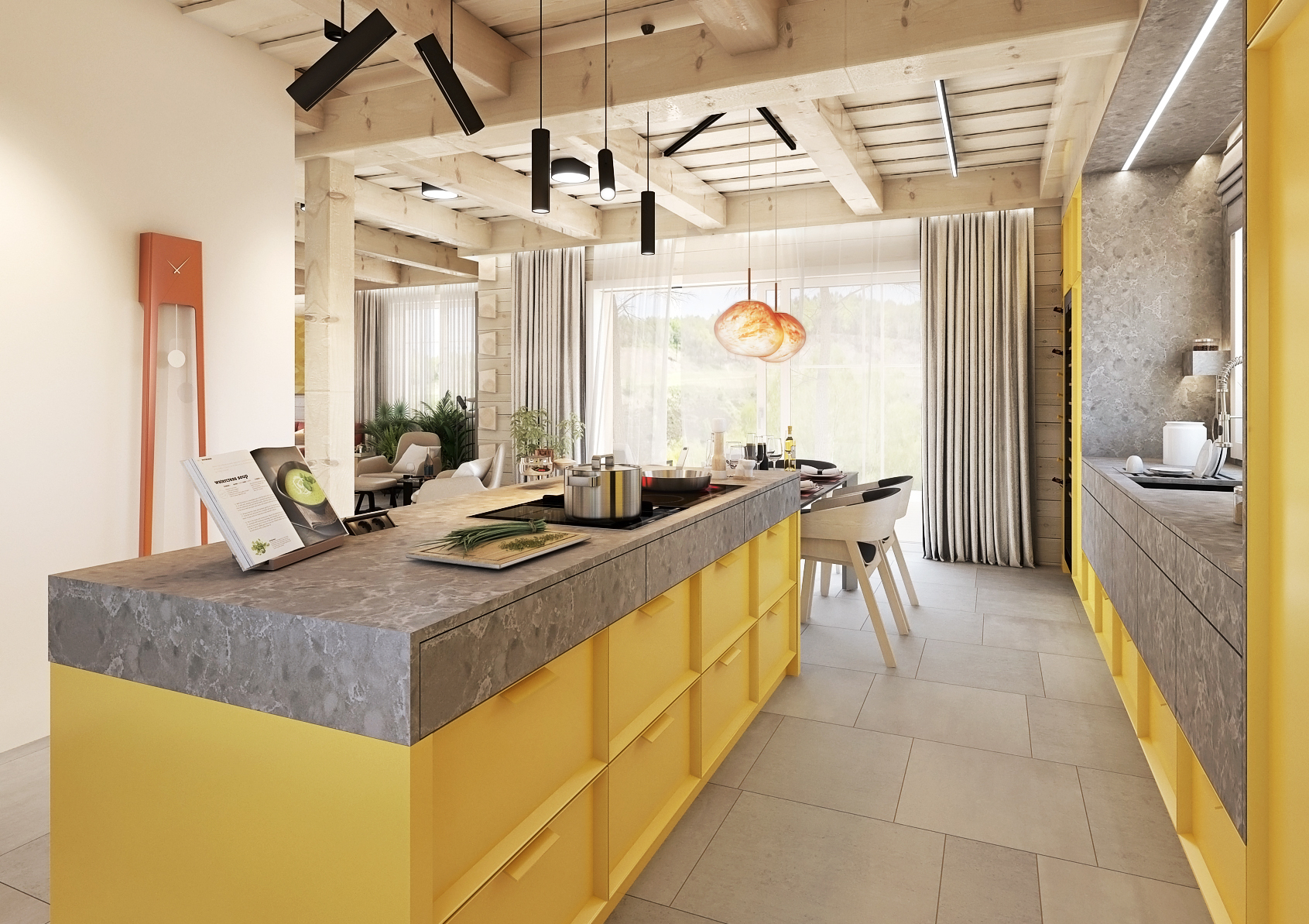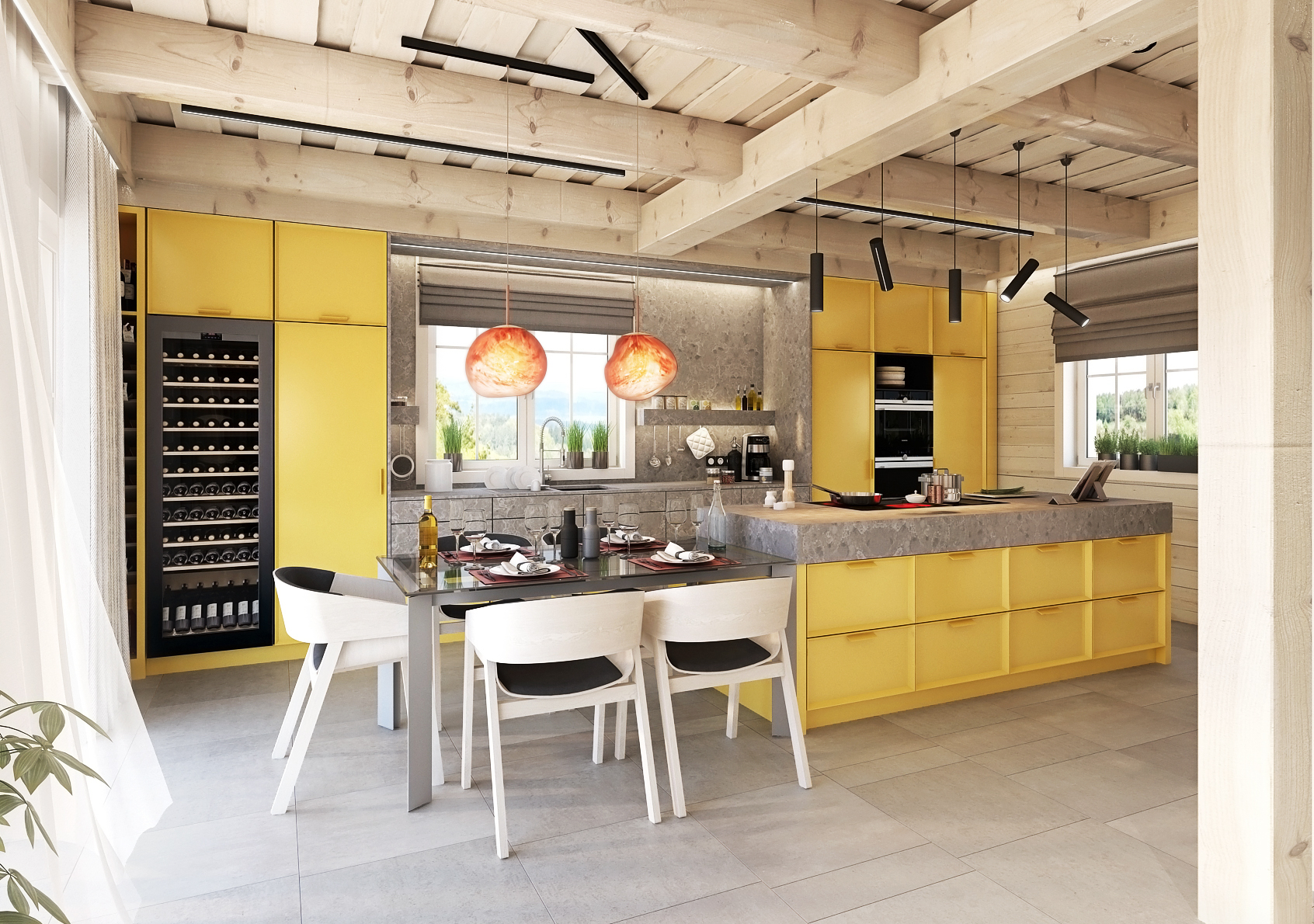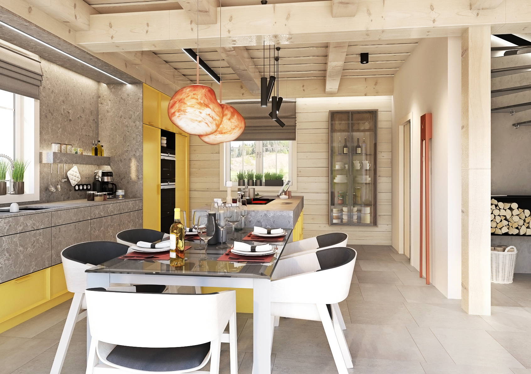 Jako první vás jistě zaujmou výrazné akcentující barvy. V případě kuchyně je touhle výraznou barvou právě žlutá, kterou lze nalézt na kuchyňských skříňkách, které jsou zde v kombinaci s kamennou pracovní deskou. Stejný motiv betonu je využit i na zdi pomocí strukturované betonové stěrky. Prostor nad skleněným jídelním stolem, který vizuálně navazuje na kuchyňský ostrůvek, ozvláštňují dvě designové závěsné lampy. Nechybí ani vitrína na prémiový alkohol či servis.
