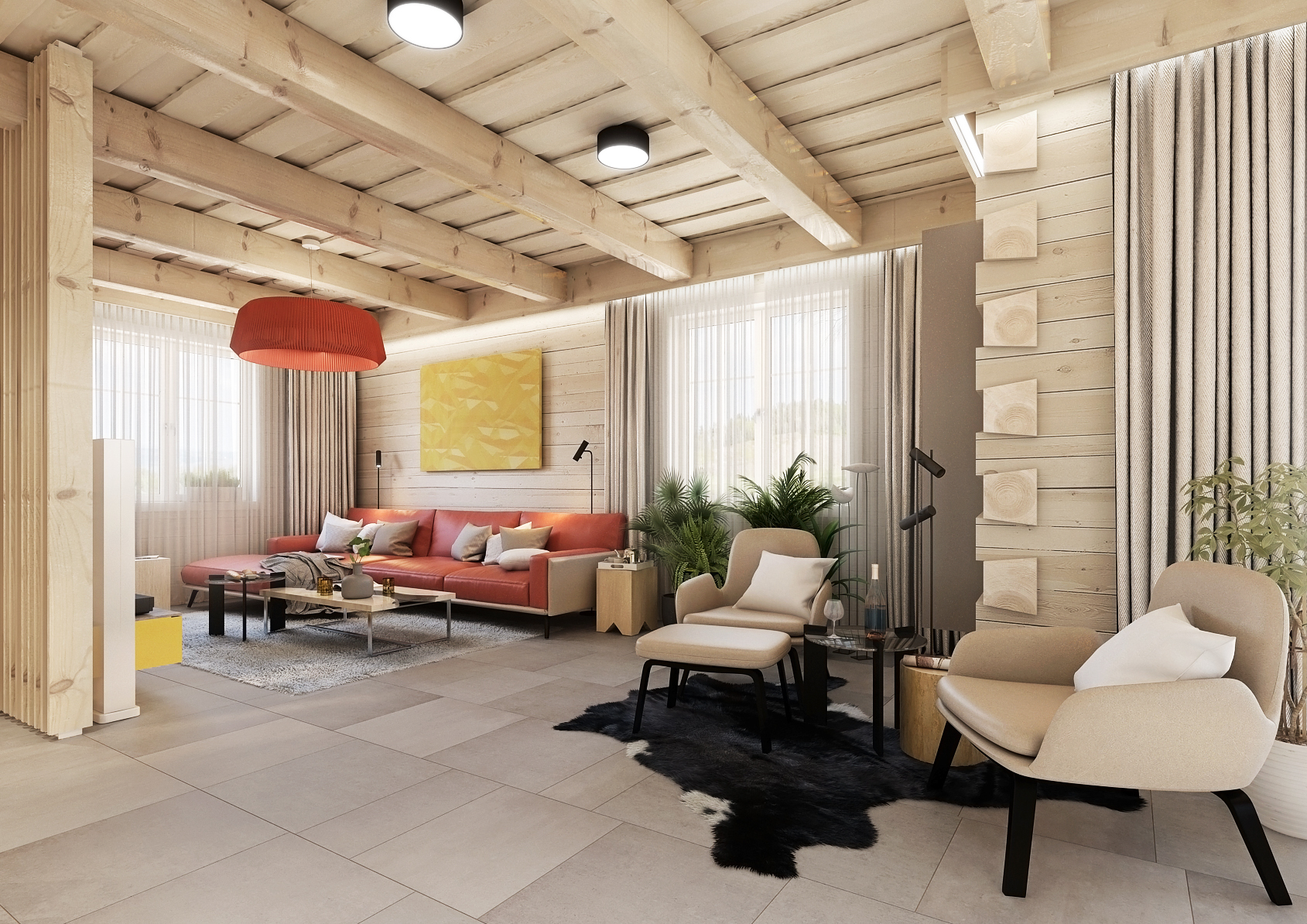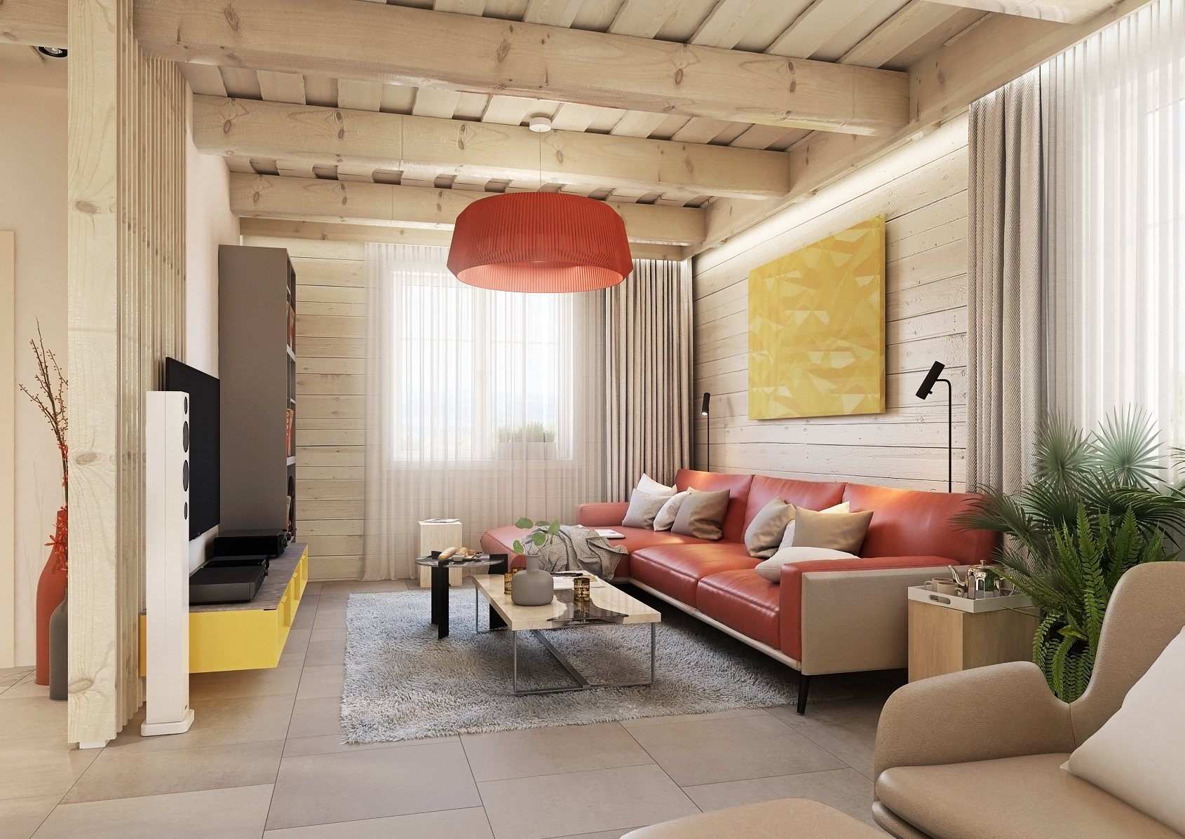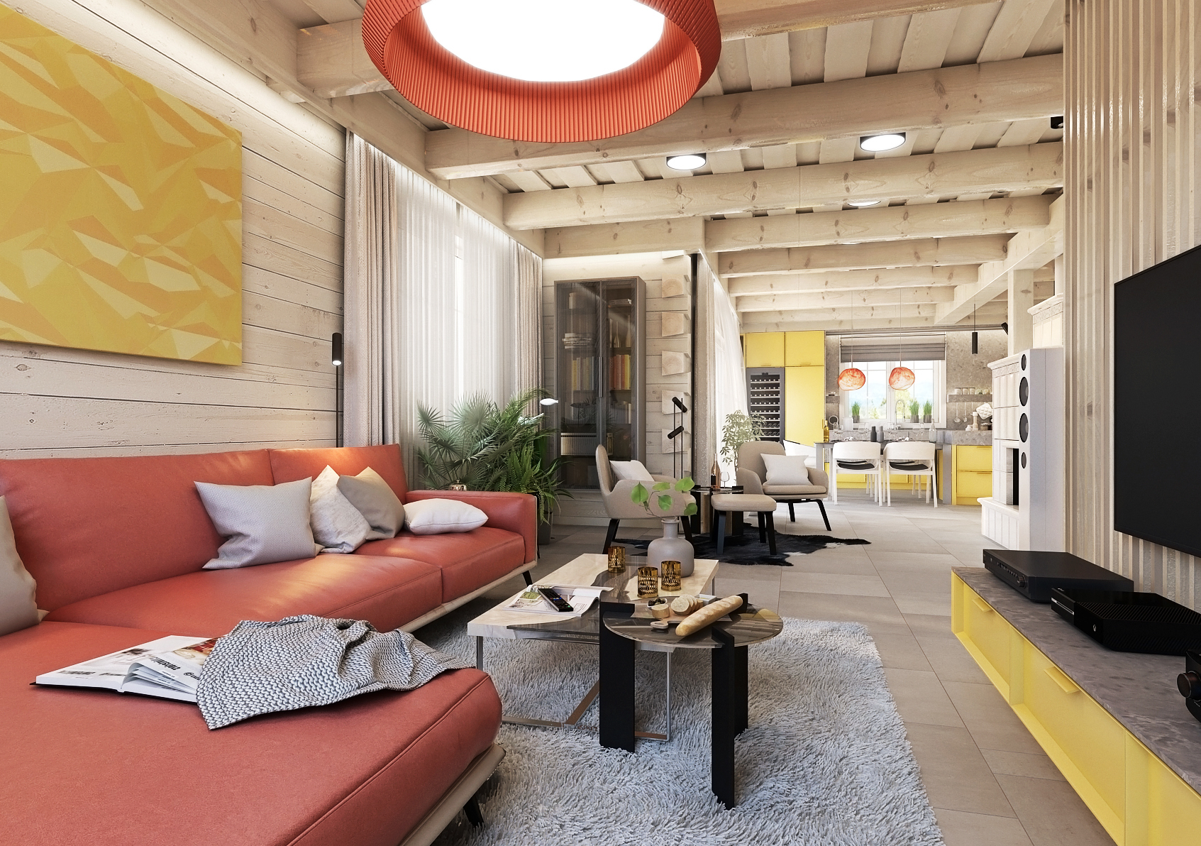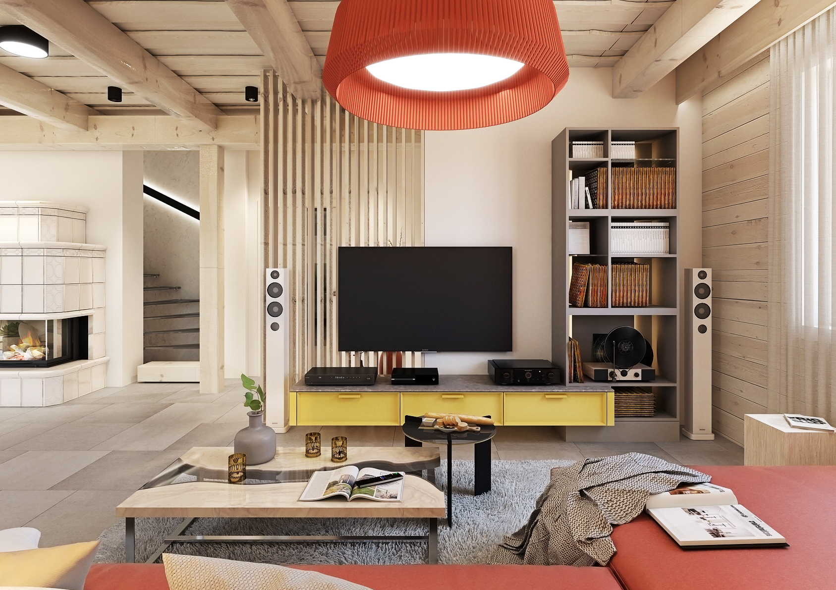 Obývací pokoj, kde žlutá přechází pomalu ale jistě do výrazné červené, od kuchyně oddělují dvě béžová křesílka se stolkem, což tvoří koutek pro relax naproti krbu, který je vizuálně řešen jako cihlová kamna. Červená prostorná kožená pohovka se pyšní uprostřed obývacího pokoje společně se dvěma odkládacími stolky navozují útulnou domáckou atmosféru.