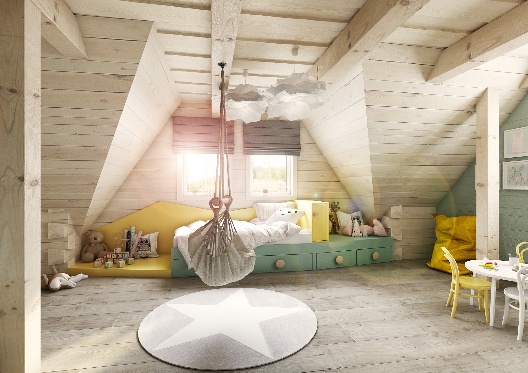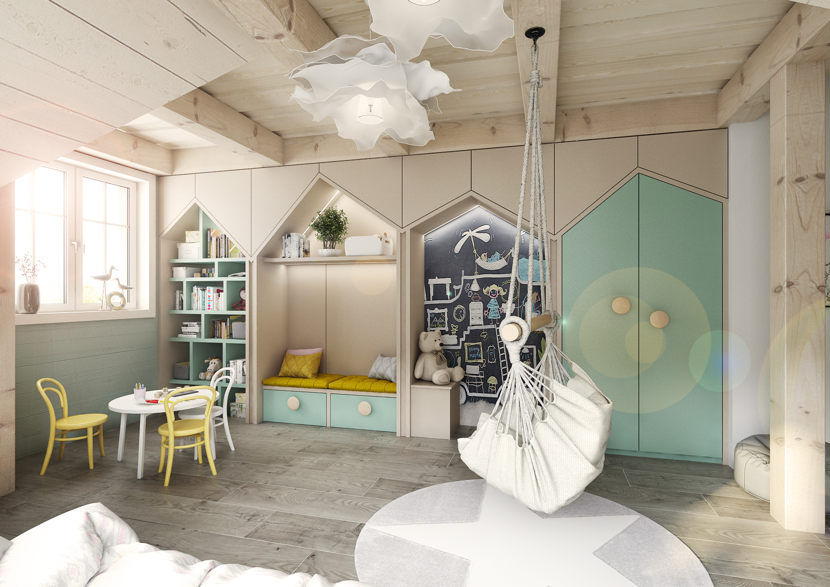 Dětský pokoj je zajímavý vestavnou sestavou po celé délce zdi táhnoucí se až k oknu, kde jsou výřezy v podobě domečků využity každý v jiném duchu. Z prvního je utvořena zavírací šatní skříň, hned vedle se nachází křídová tabule, v dalším posezení s úložným prostorem a v poslední řadě i otevřená knihovnička u okna. Nechybí ani postel, houpací síť ve středu pokoje a spousta místa na odpočinek.