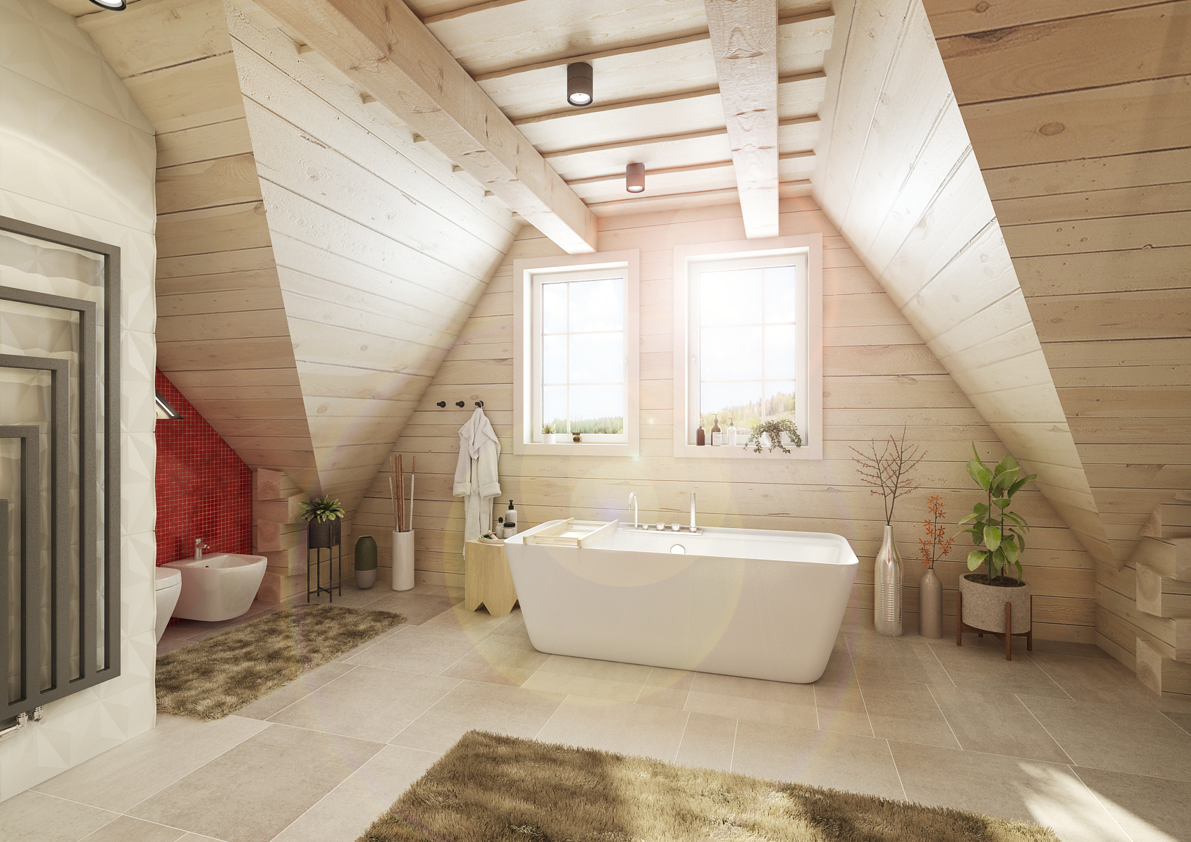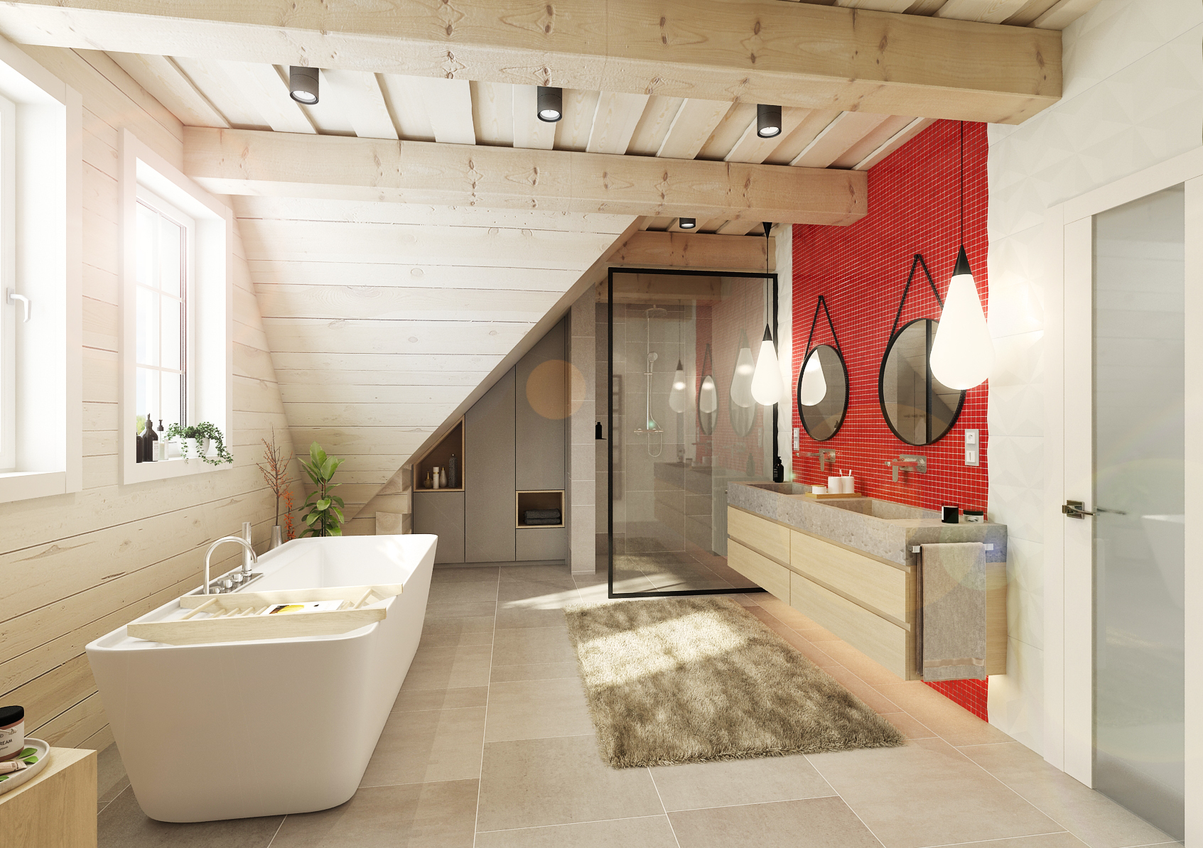 Na konec tu samozřejmě nechybí ani prostorná koupelna, kde pro změnu akcentuje hlavně červená barva v kombinaci s hnědými koberci a černými prvky. Walk in sprcha, kterou od zbytku koupelny odděluje pouze prosklený panel nebo vana jako solitér? To vše tato koupelna nabízí.