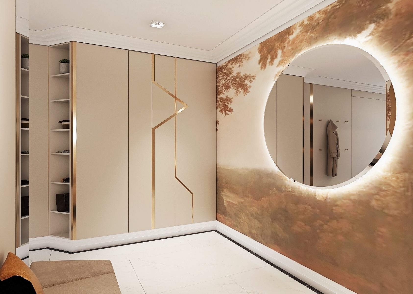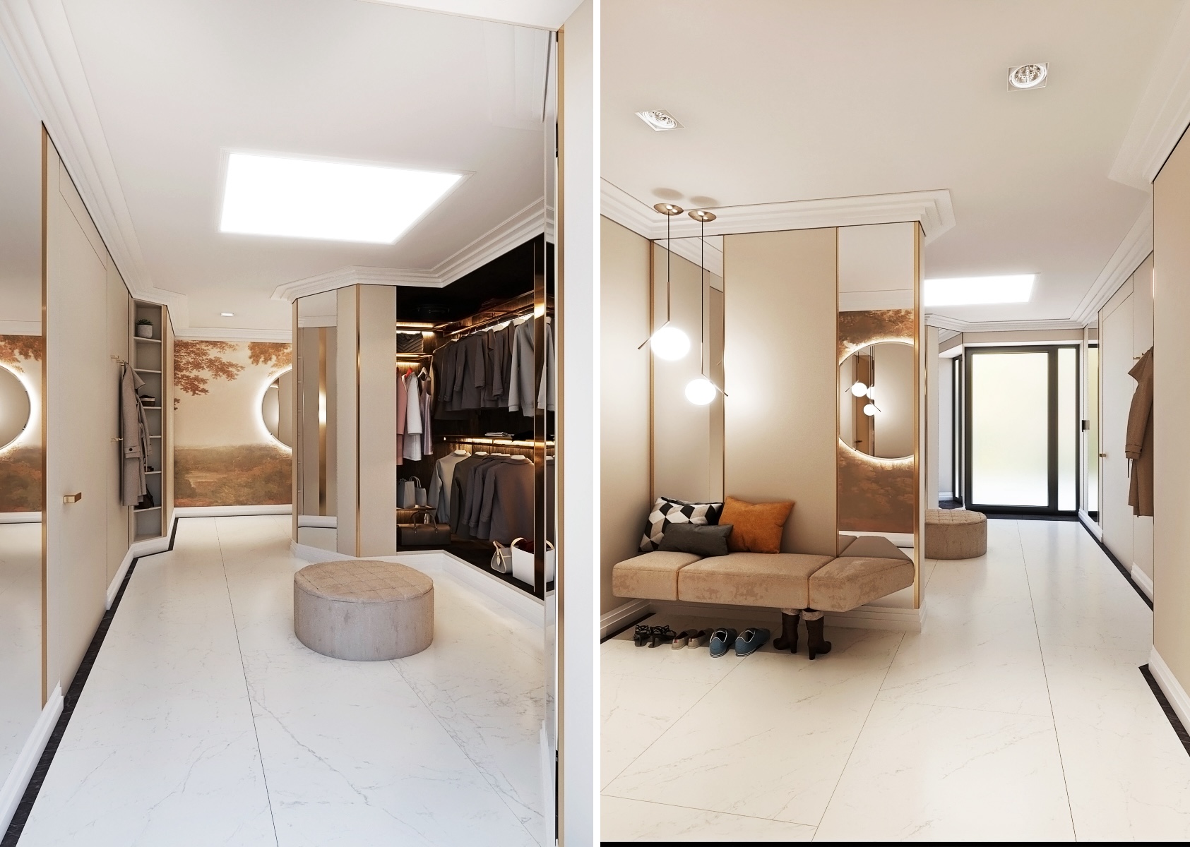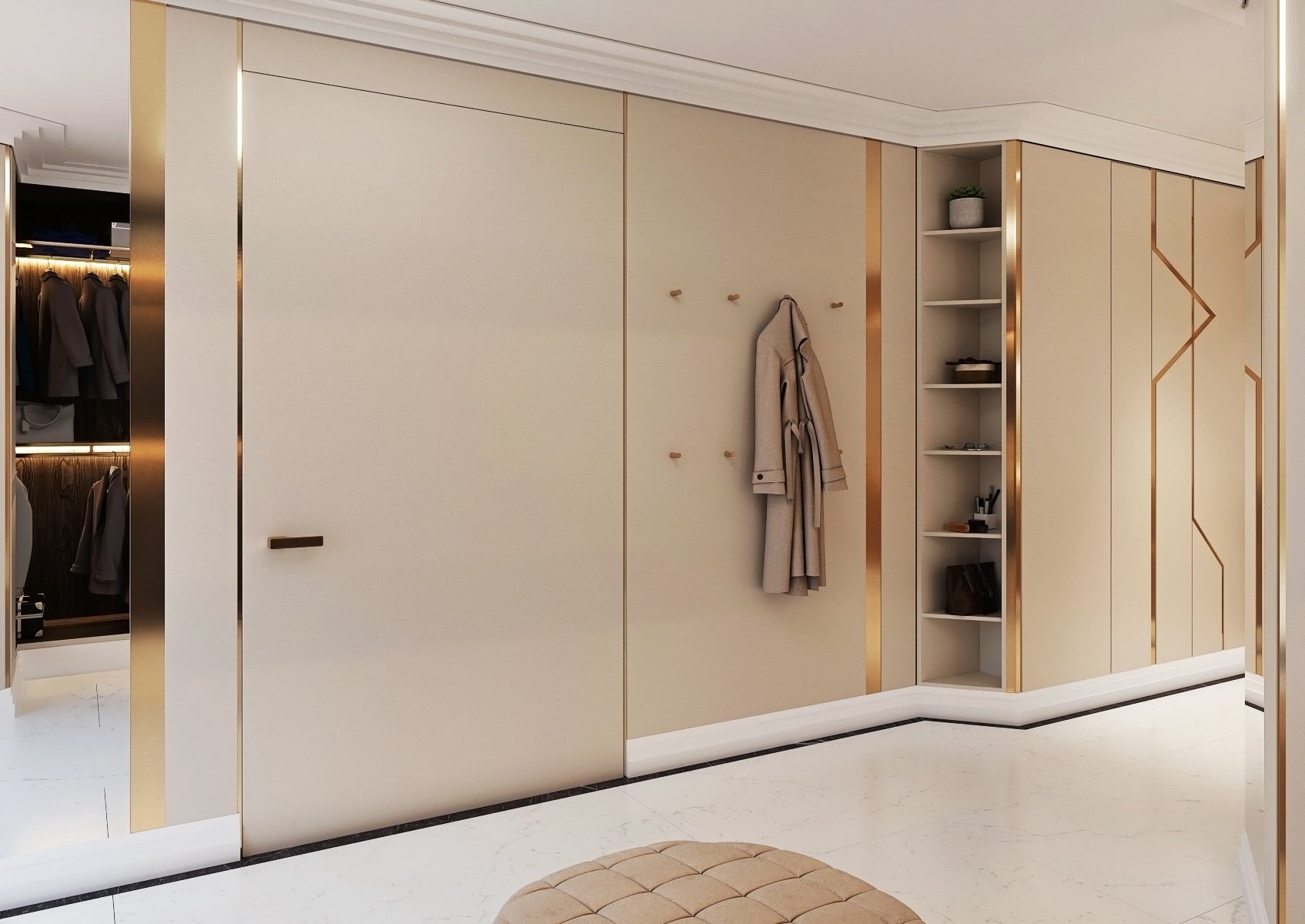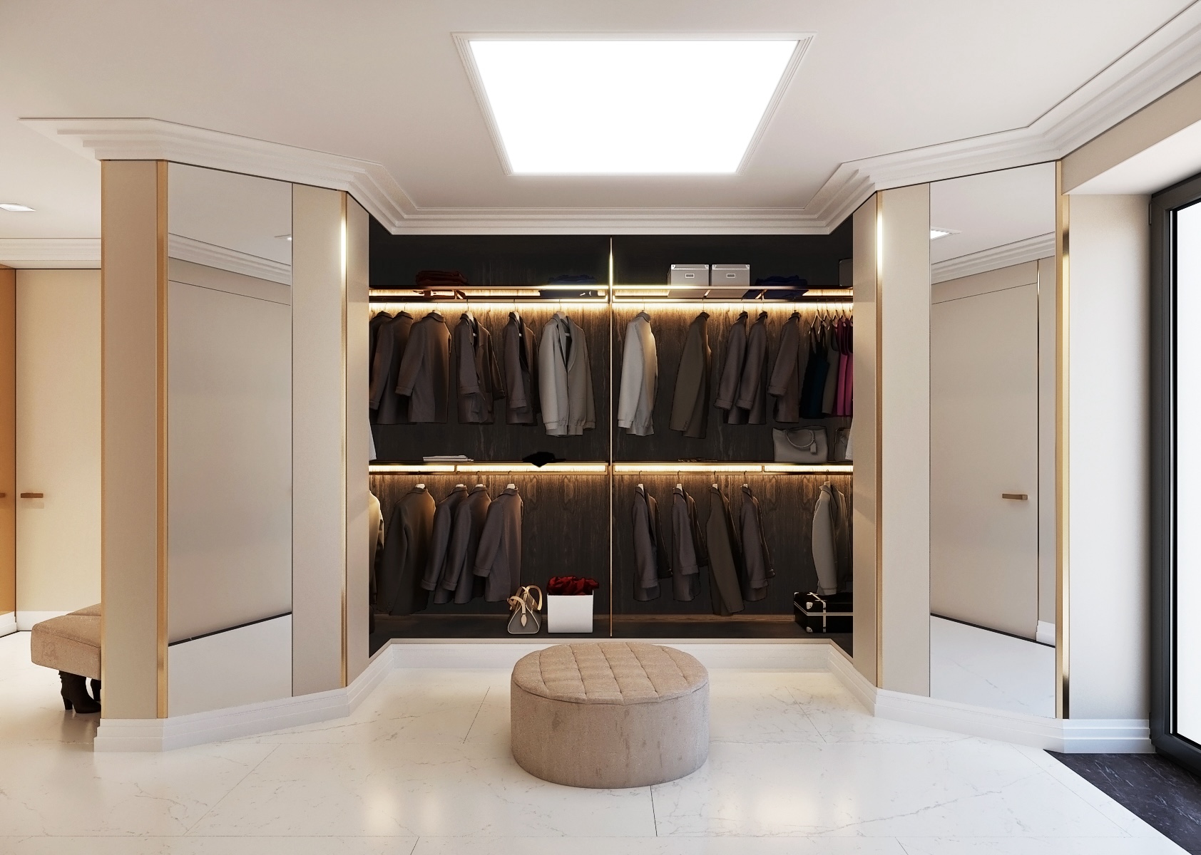 Při vstupu do místnosti vás přivítá hladká, leštěná podlaha s mramorovým vzhledem, která dodává prostoru pocit luxusu a prostor prosvětluje. Místnost je dobře osvětlena díky kombinaci přímých a nepřímých světelných zdrojů, které zahrnují zabudované stropní světlomety a elegantní nástěnné lampy, poskytující teplé světlo, ideální pro volbu outfitů.