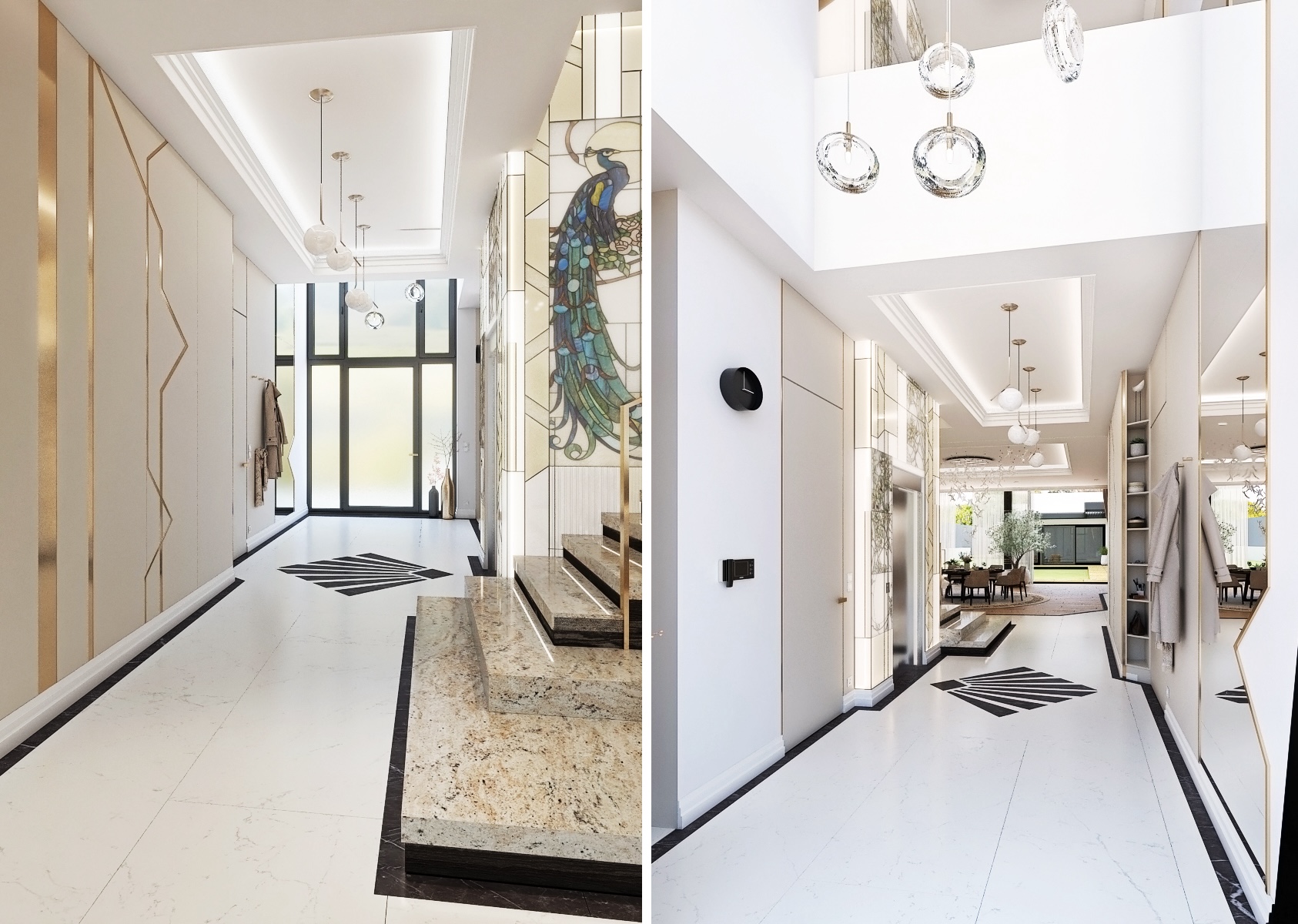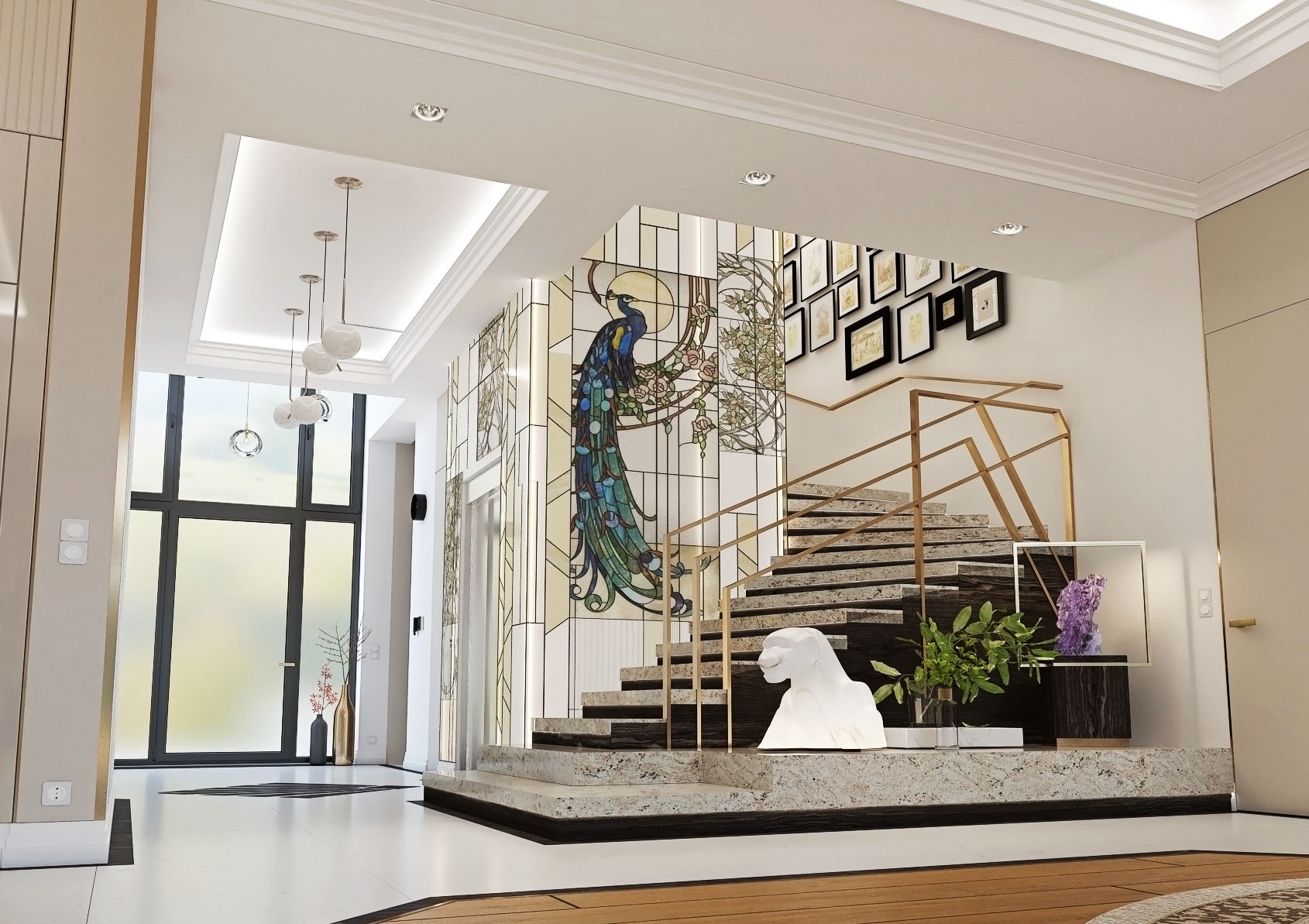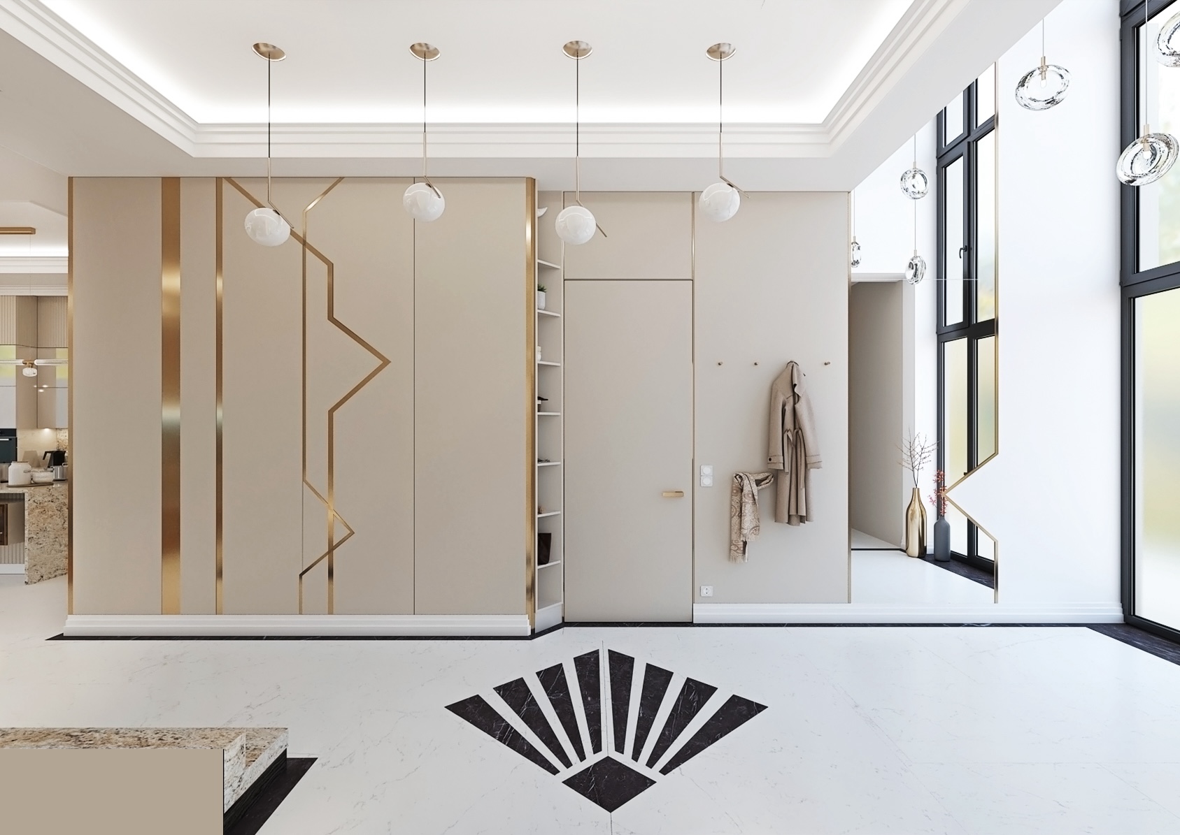 Tento prostor je moderně navržený vstup rodinného domu, který kombinuje funkčnost s estetikou.
