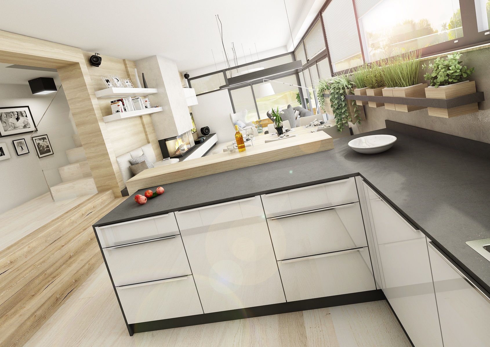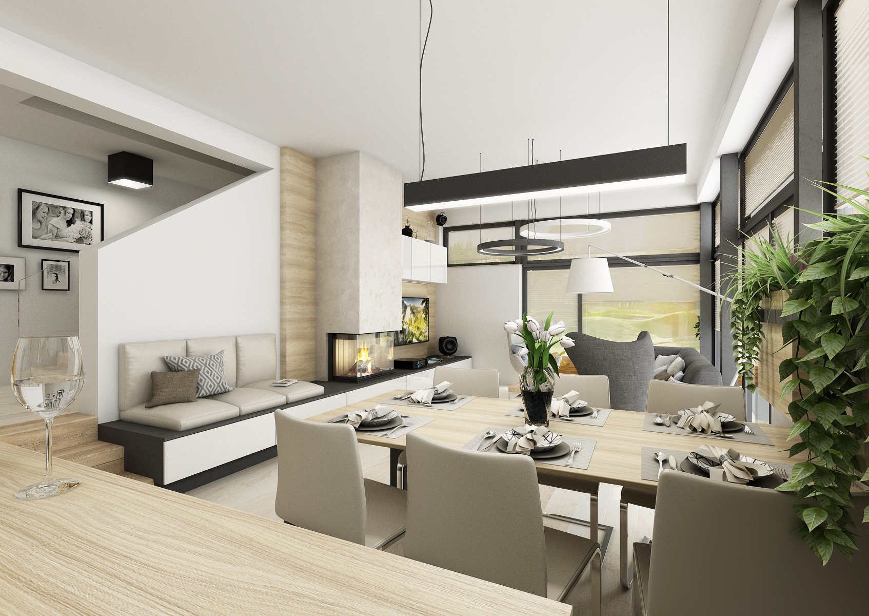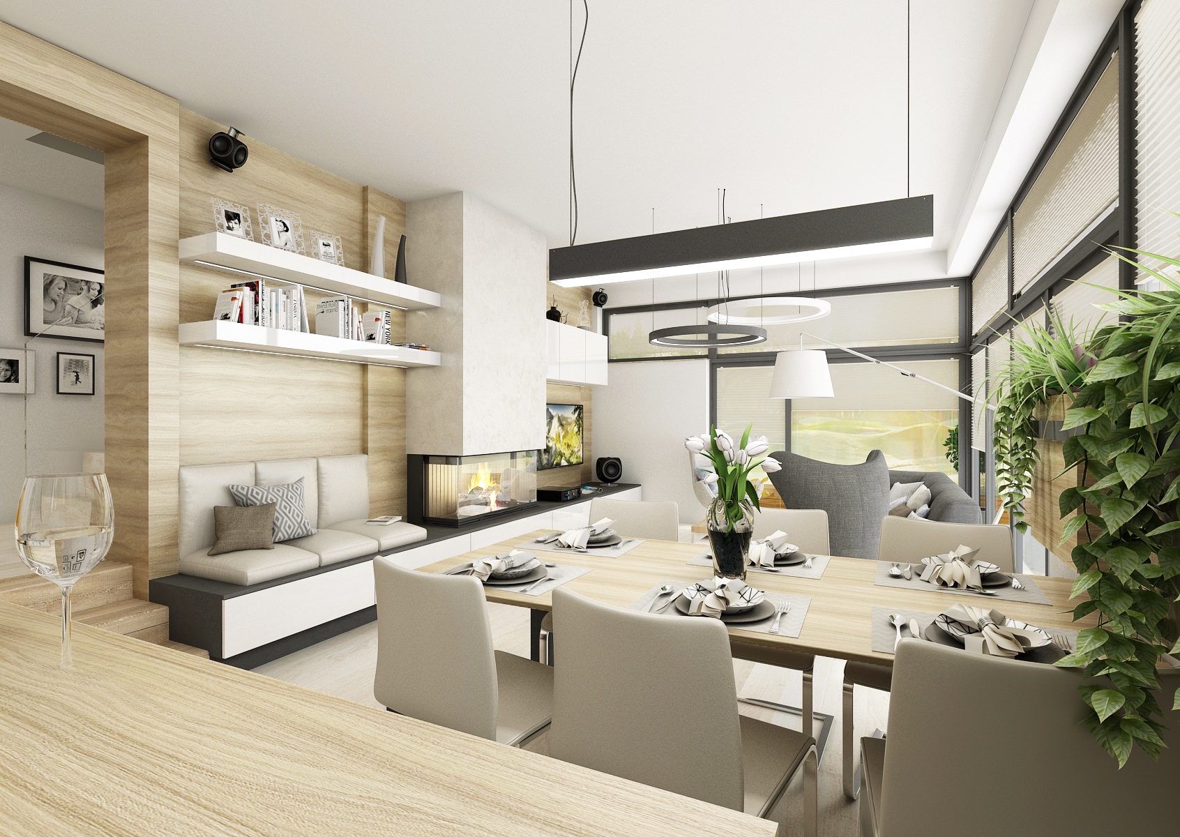 Interiér haly přes dva schůdky navazující na kuchyň s obývacím pokojem v jedné rovině, které jsou v těsném kontaktu s exteriérem, díky proskleným stěnám i vstupem přímo do zahrady. Většina dýhového nábytku, stejně jako obklady a plovoucí podlaha, je navržena ve světlém přírodním dubu, subtilní pracovní deska kuchyňské linky je kompaktní deska od Polyrey v barvě antracitu a dvířka v bílém lesklém laku. Těleso krbu je "posazeno" na nábytkovou sestavu, zásuvky, lemující zeď od televizoru až po sedací lavici.