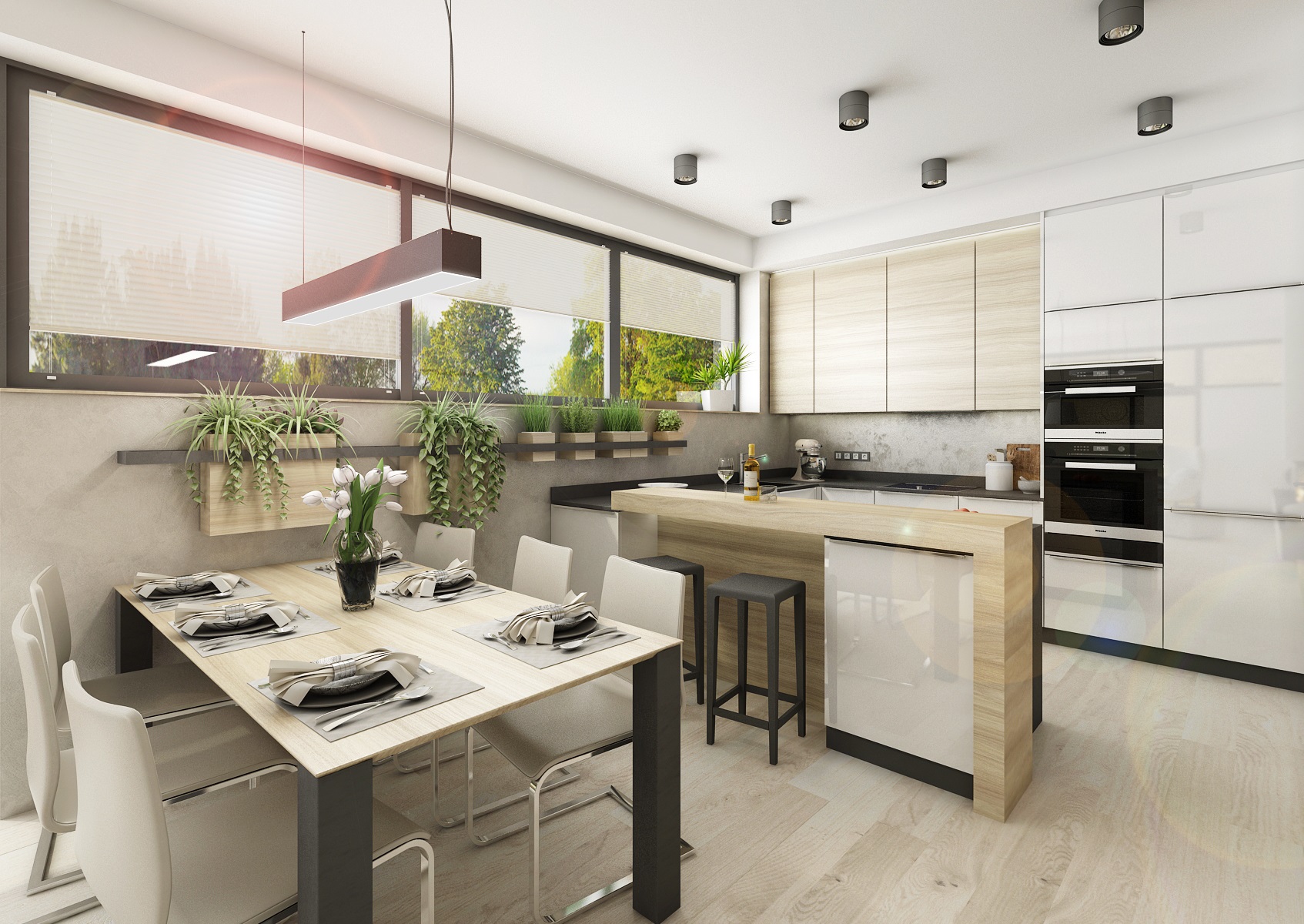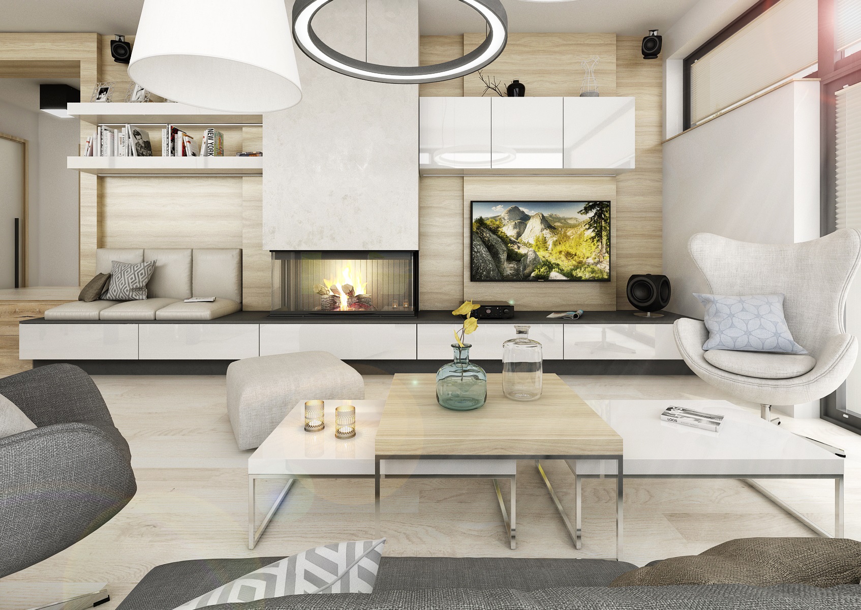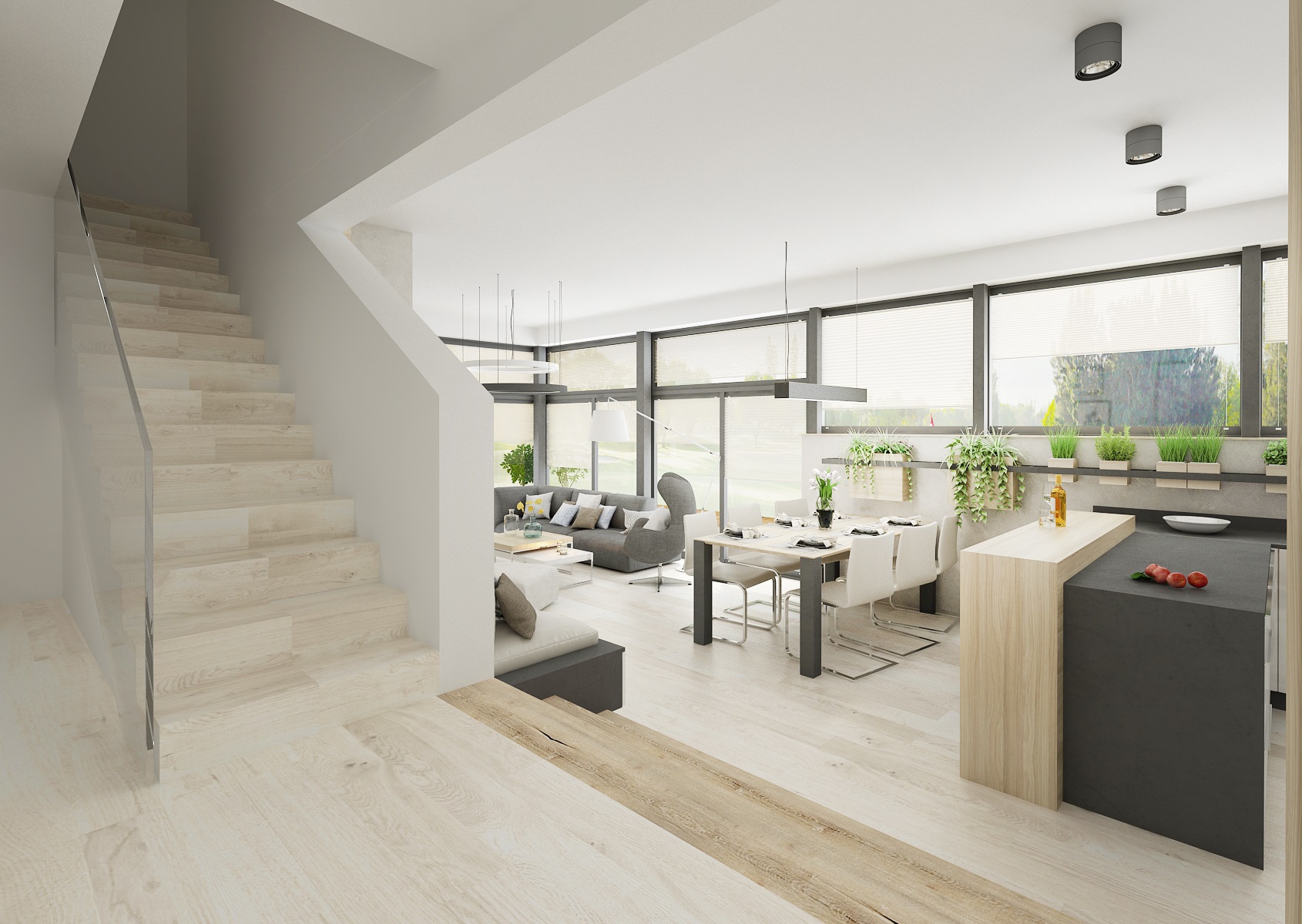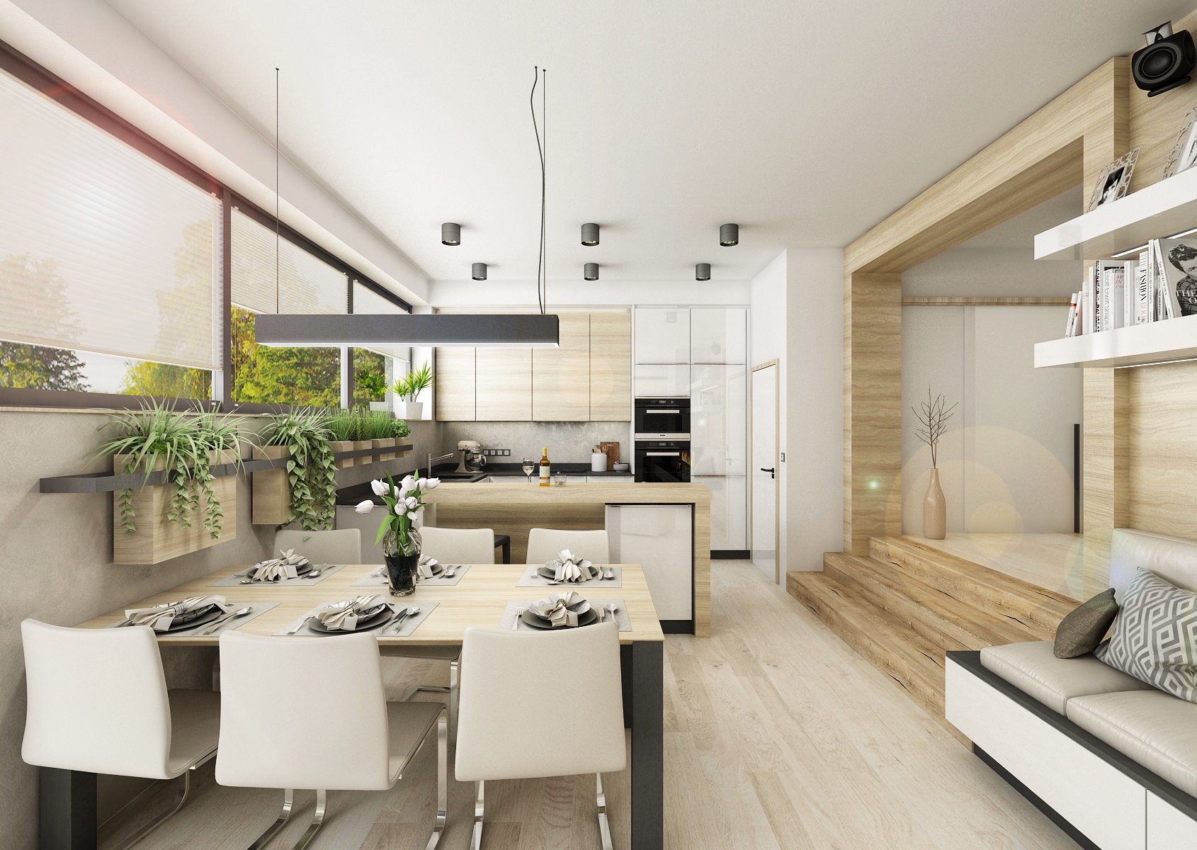 Interiér haly přes dva schůdky navazující na kuchyň s obývacím pokojem v jedné rovině, které jsou v těsném kontaktu s exteriérem, díky proskleným stěnám i vstupem přímo do zahrady. Většina dýhového nábytku, stejně jako obklady a plovoucí podlaha, je navržena ve světlém přírodním dubu, subtilní pracovní deska kuchyňské linky je kompaktní deska od Polyrey v barvě antracitu a dvířka v bílém lesklém laku. Těleso krbu je "posazeno" na nábytkovou sestavu, zásuvky, lemující zeď od televizoru až po sedací lavici.