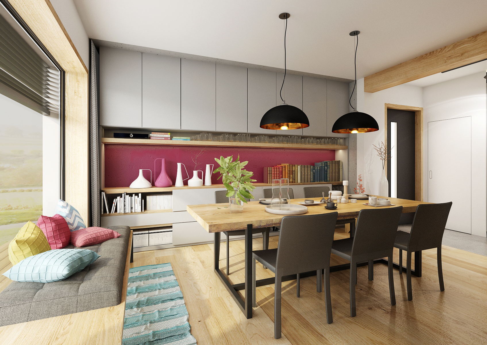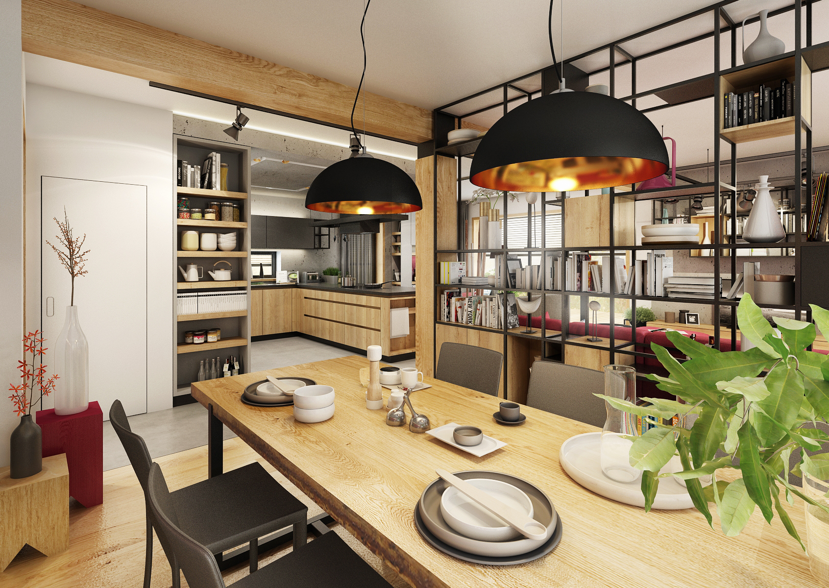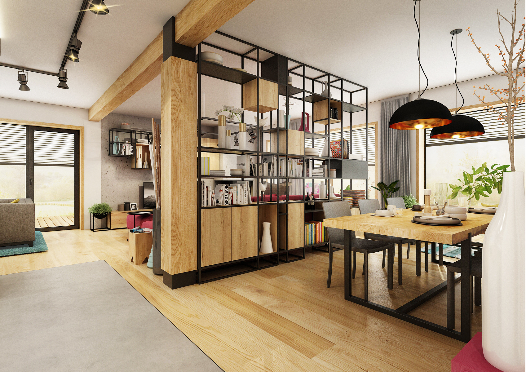 Rodina chtěla být co nejvíce pospolu, proto při rekonstrukci přízemního bungalovu vznikla tato dispozice, kterou v prostoru neruší žádná zděná příčka. Téměř pravidelný obdelník je pomyslně rozdělen na čtyři zóny. Pouze vysoká policová sestava v industriálním stylu mezi jídelnou a obývací částí rozčleňuje prostor. Dřevo a černé kovové prvky doplňuje betonová stěrka. Zemité barvy v interiéru oživují veselé kusové koberce a malinové čalounění sedací soupravy. Touto výraznou barvou bylo natřeno i pozadí skříňové niky.