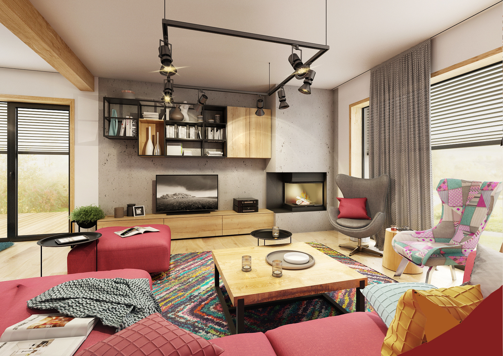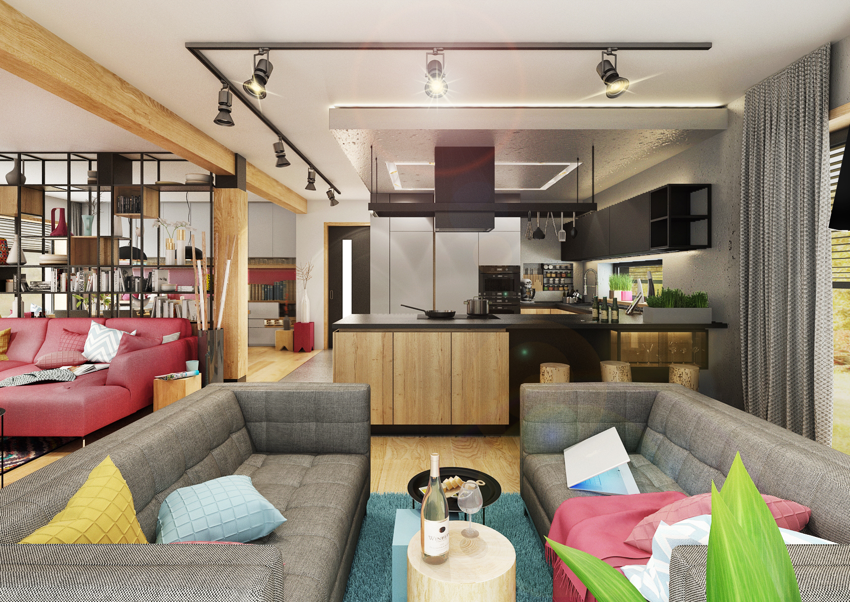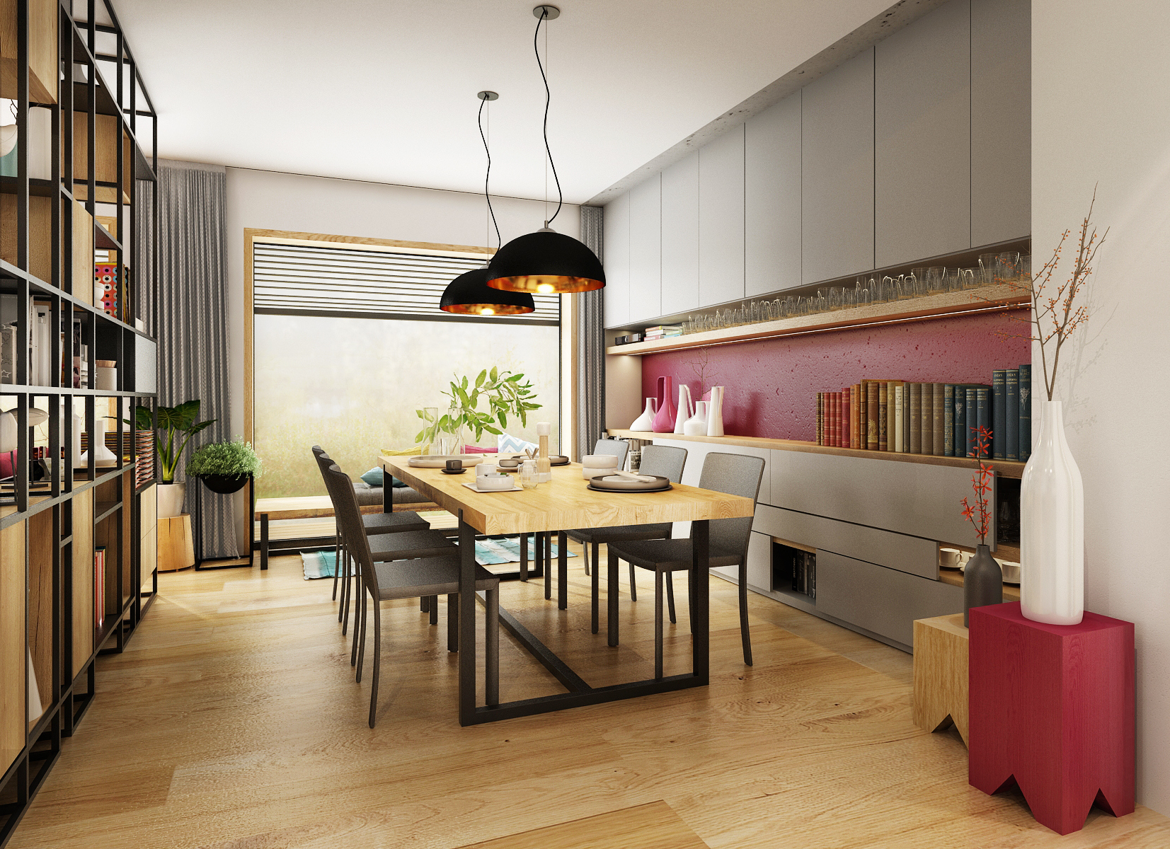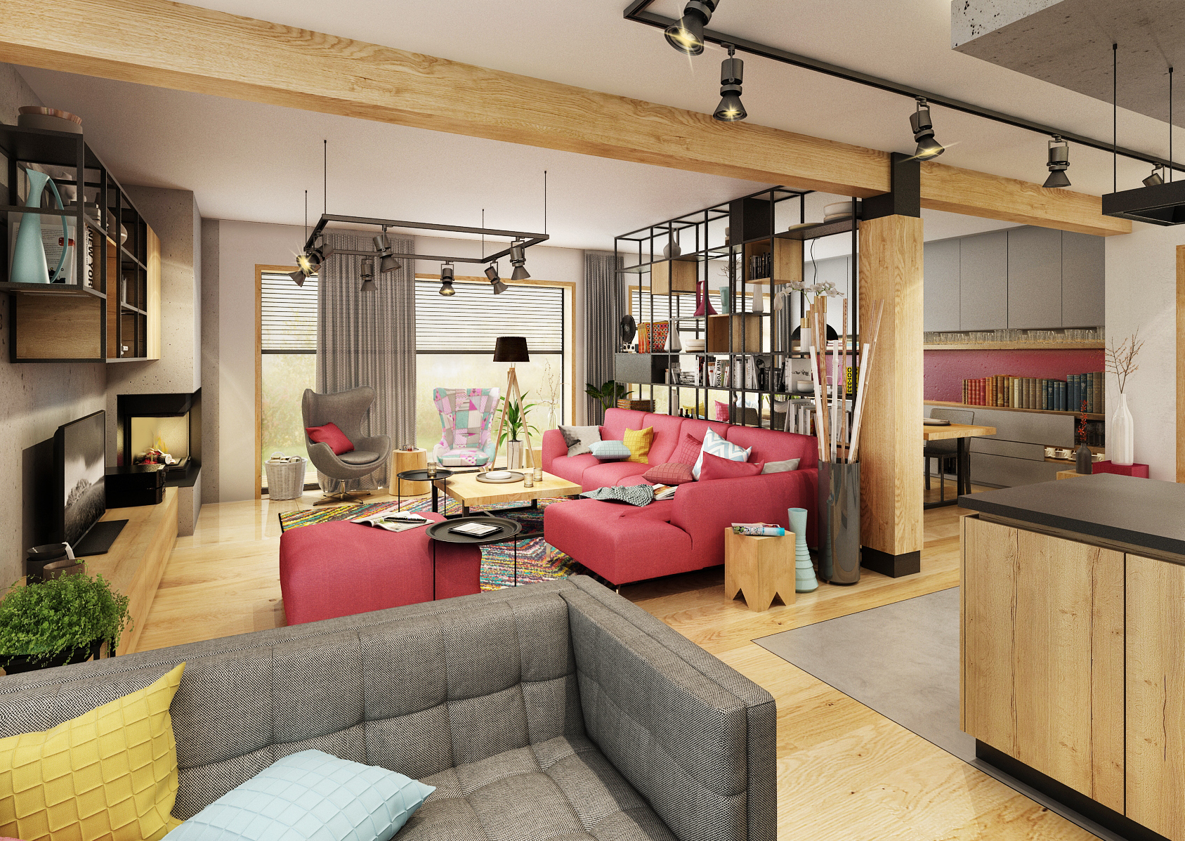 Rodina chtěla být co nejvíce pospolu, proto při rekonstrukci přízemního bungalovu vznikla tato dispozice, kterou v prostoru neruší žádná zděná příčka. Téměř pravidelný obdelník je pomyslně rozdělen na čtyři zóny. Pouze vysoká policová sestava v industriálním stylu mezi jídelnou a obývací částí rozčleňuje prostor. Dřevo a černé kovové prvky doplňuje betonová stěrka. Zemité barvy v interiéru oživují veselé kusové koberce a malinové čalounění sedací soupravy. Touto výraznou barvou bylo natřeno i pozadí skříňové niky.