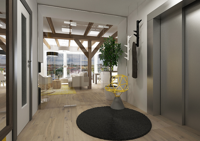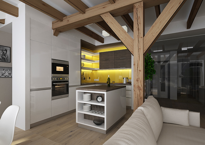 Návrh obývacího pokoje v podkroví. Barevná kombinace je v zemitých tónech doplněná žlutou. Na dřevěných trámech, které prolínají celý prostor, jsou z vrchní strany LED pásky a slouží pro vytvoření nepřímého intimního osvětlení.