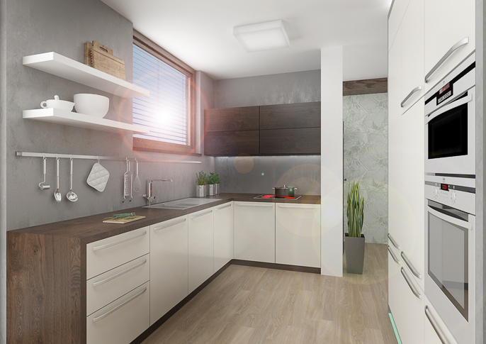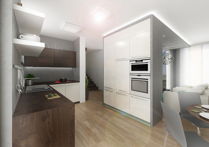 Vzorová vizualizace pro developerský projekt ve Veverské Bitýšce. Příčka mezi obývacím pokojem a kuchyní slouží pro vestavbu kuchyňských spotřebičů a z obývací části pro TV. Díky šedé stěrce v kombinaci s bílou barvou a tmavým dřevodekorem působí interiér moderně a jednoduše.