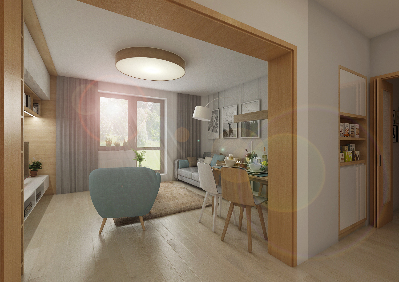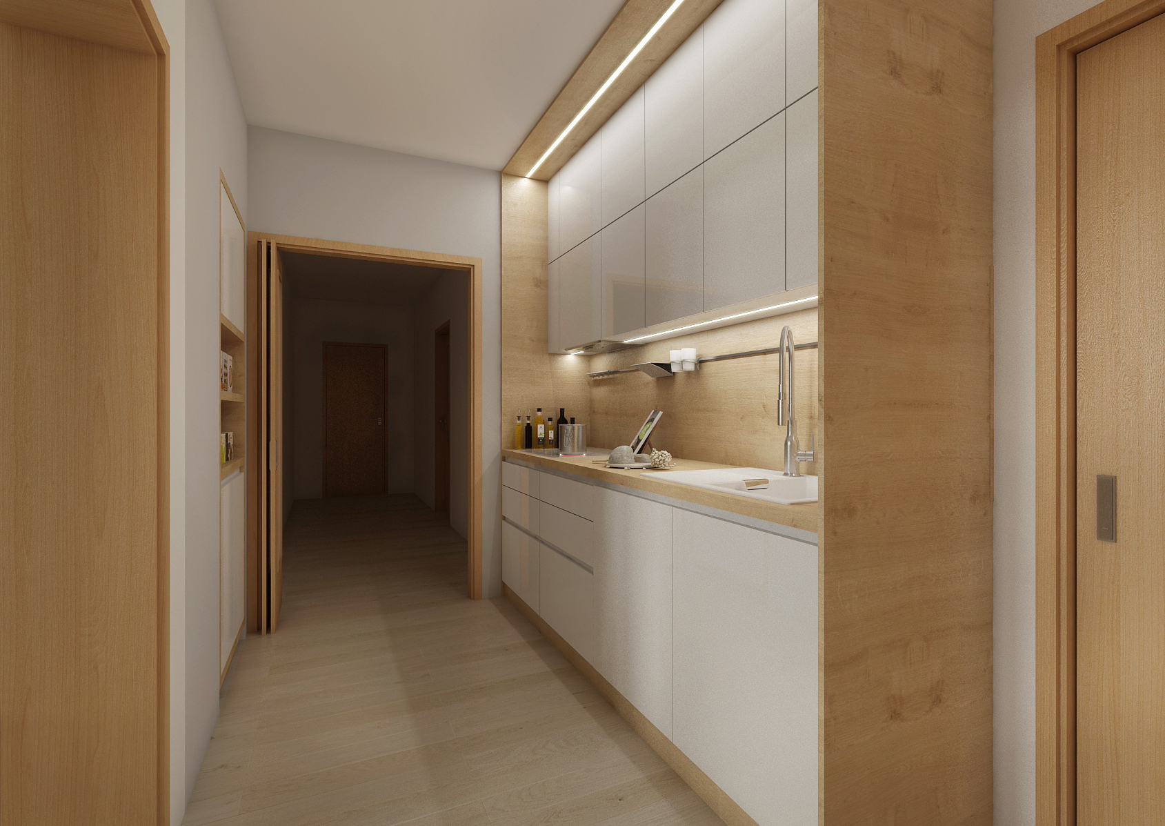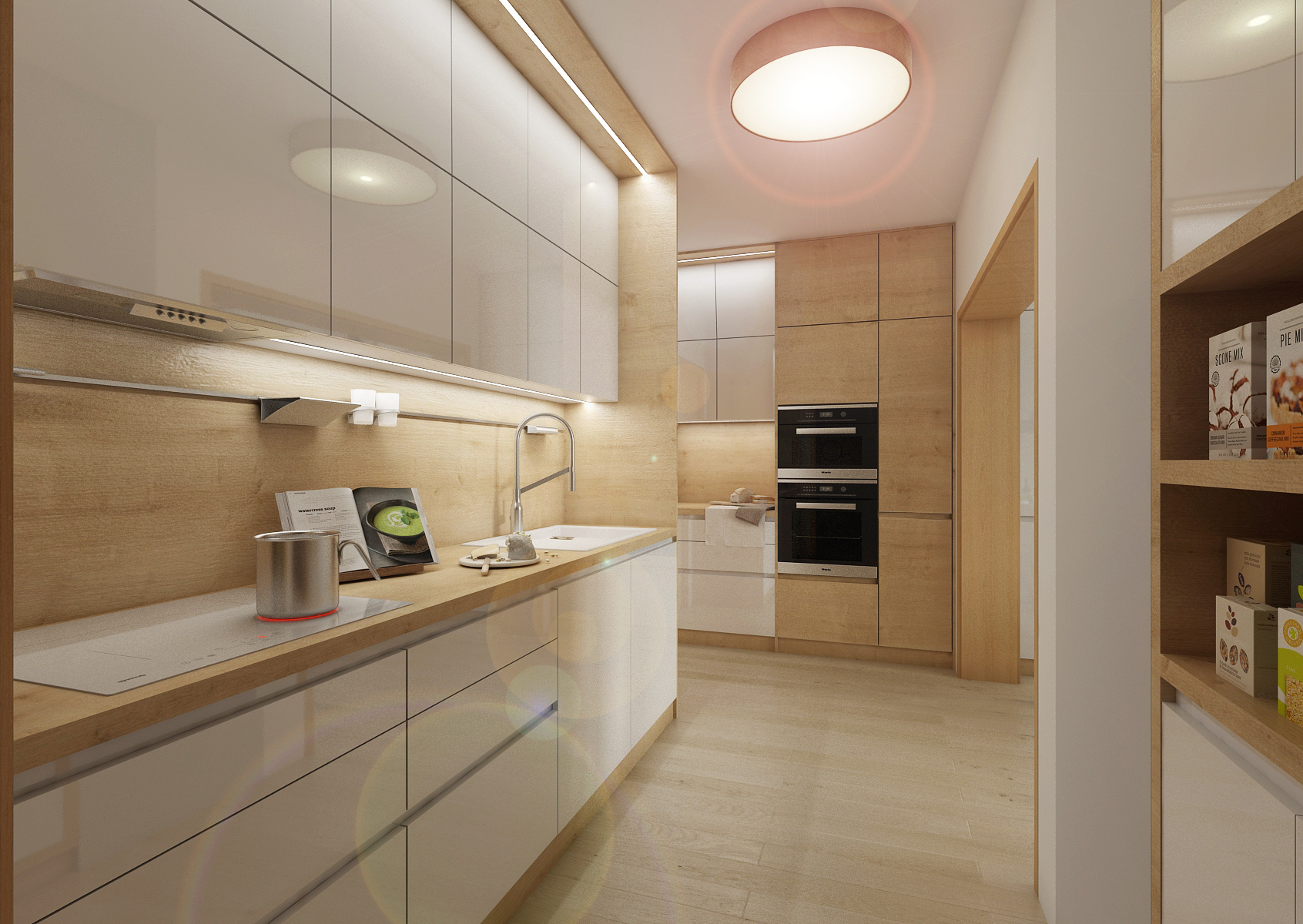 byt s kuchyňským koutem, nábytek v kombinaci bílý lak a světlý dub volně přechází z kuchyně do obývacího pokoje. Tento pokoj zároveň slouží i jako ložnice. Prostor pro kuchyň byl maximálně využit, skříňky zasahují až po strop, úložné prostory se vždy hodí. Světlost podporuje i šedá barva na čalounění a výmalbě. Barevně vystupuje pouze křeslo a textil na rozkládací pohovce pro každodenní spaní. Stejný materiál se opakuje i v dětském pokoji, nábytek na míru vyplňuje každý kousek prostoru. Velký pracovní stůl a knihovna je nezbytnou součástí studentského pokoje. Postel je rozkládací, ukrývá v sobě výsuvné druhé lůžko pro občasné návštěvy.