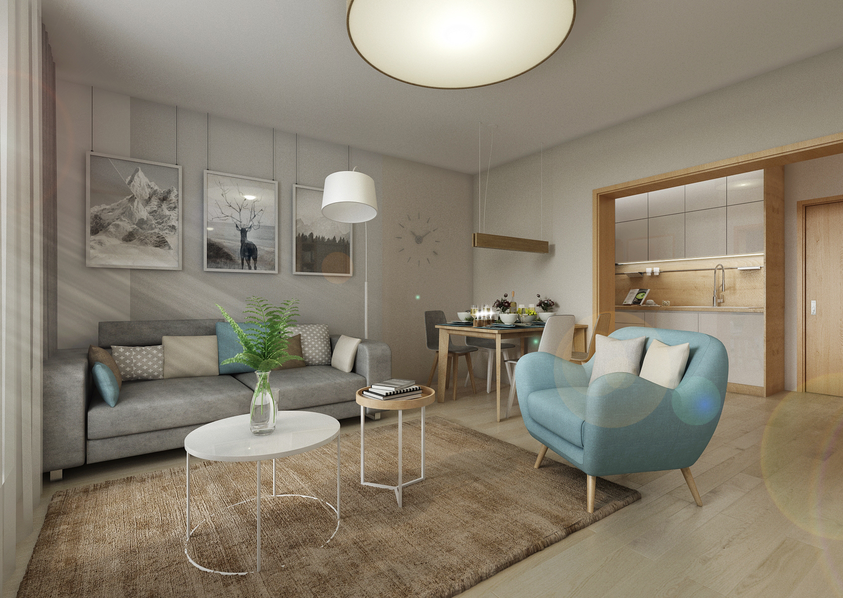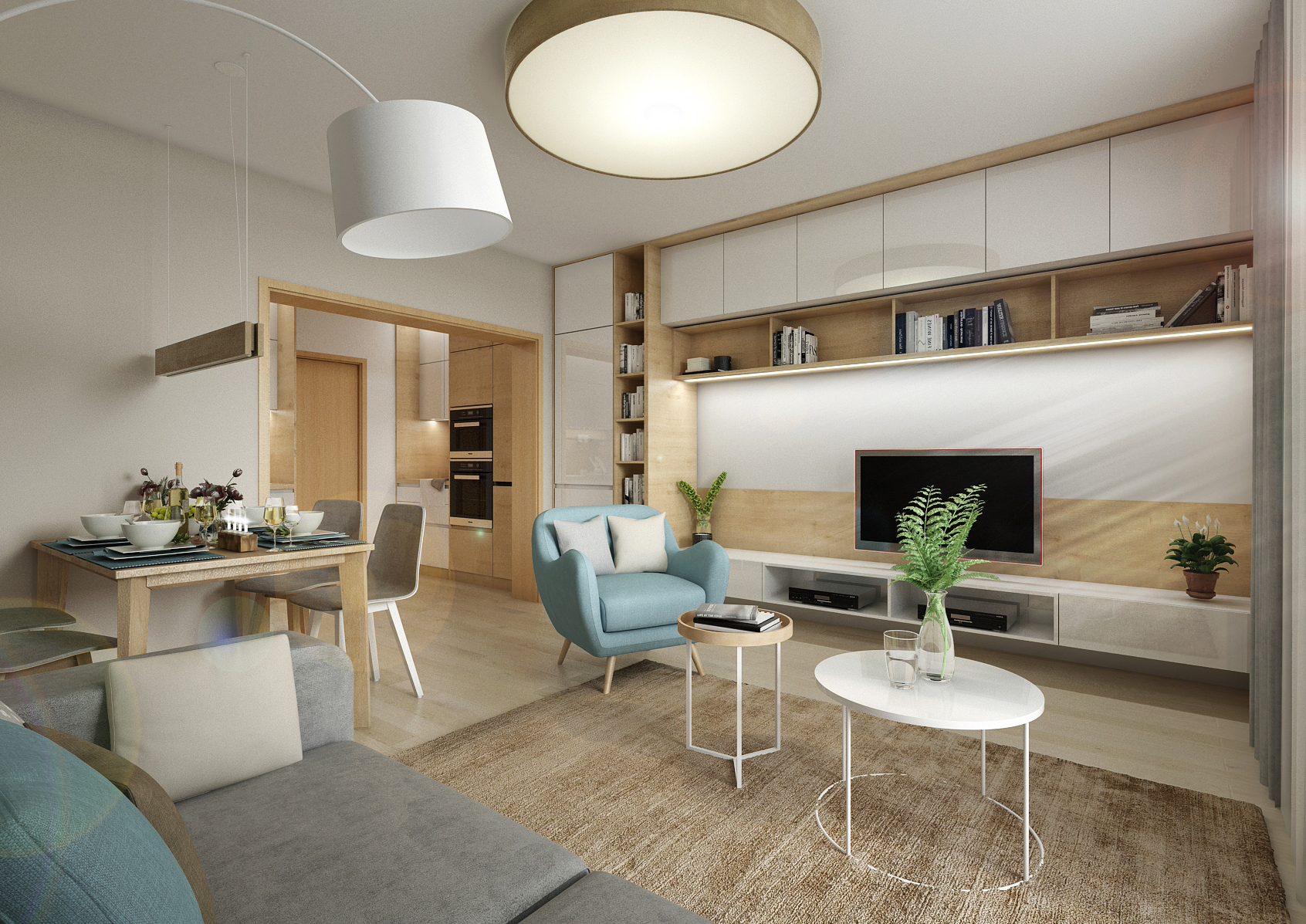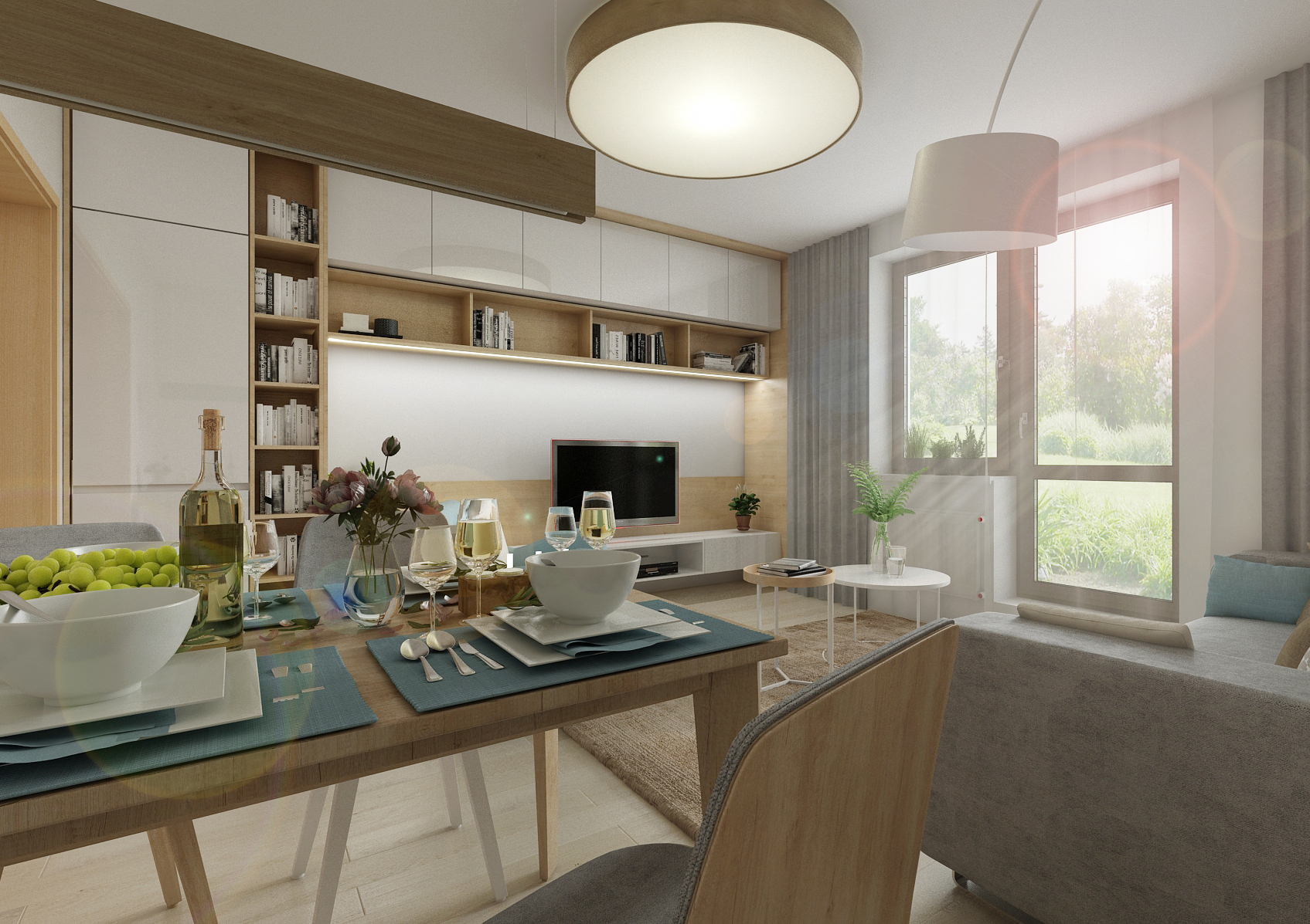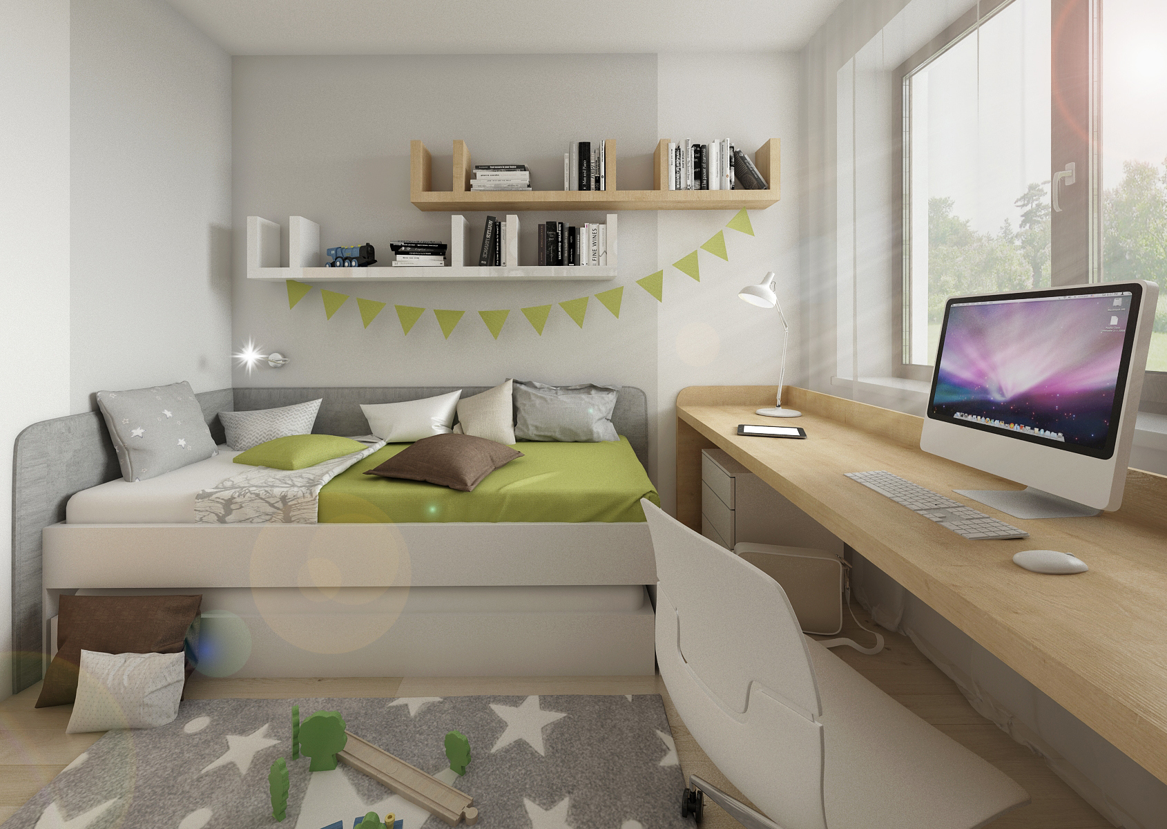 byt s kuchyňským koutem, nábytek v kombinaci bílý lak a světlý dub volně přechází z kuchyně do obývacího pokoje. Tento pokoj zároveň slouží i jako ložnice. Prostor pro kuchyň byl maximálně využit, skříňky zasahují až po strop, úložné prostory se vždy hodí. Světlost podporuje i šedá barva na čalounění a výmalbě. Barevně vystupuje pouze křeslo a textil na rozkládací pohovce pro každodenní spaní. Stejný materiál se opakuje i v dětském pokoji, nábytek na míru vyplňuje každý kousek prostoru. Velký pracovní stůl a knihovna je nezbytnou součástí studentského pokoje. Postel je rozkládací, ukrývá v sobě výsuvné druhé lůžko pro občasné návštěvy.