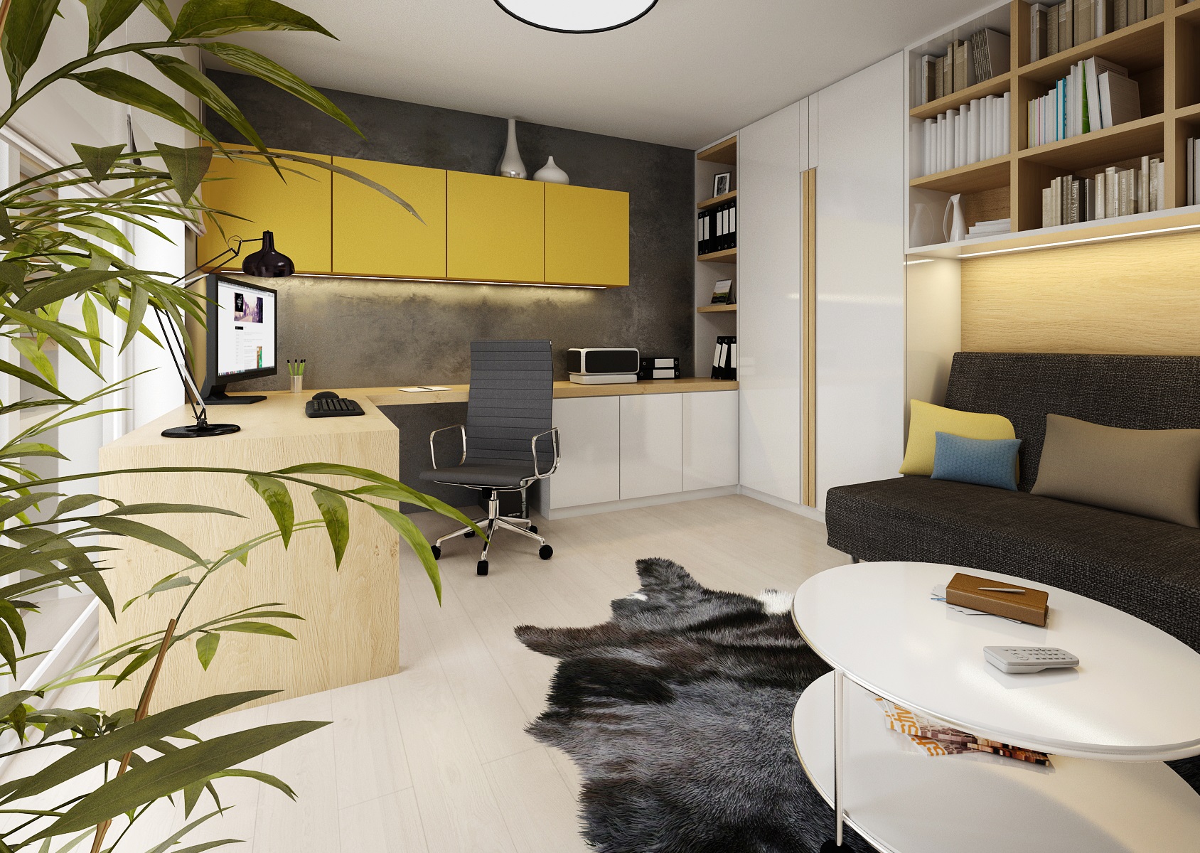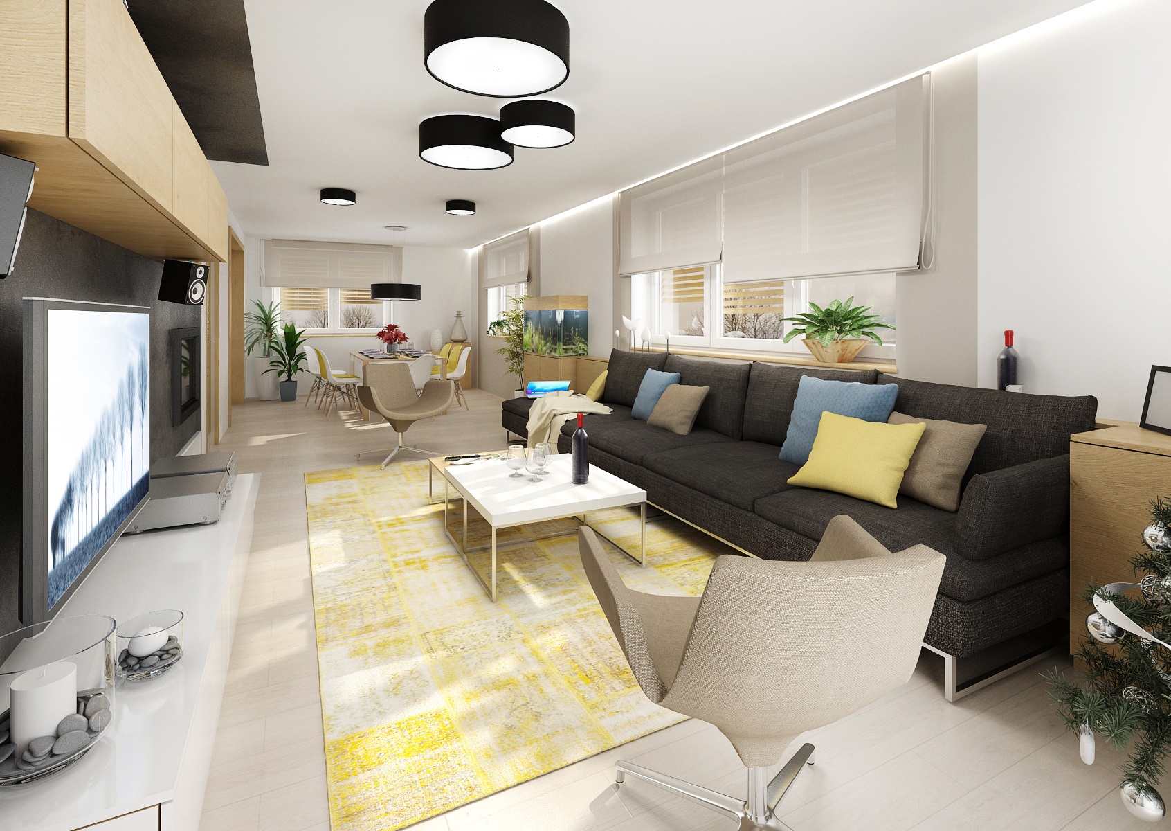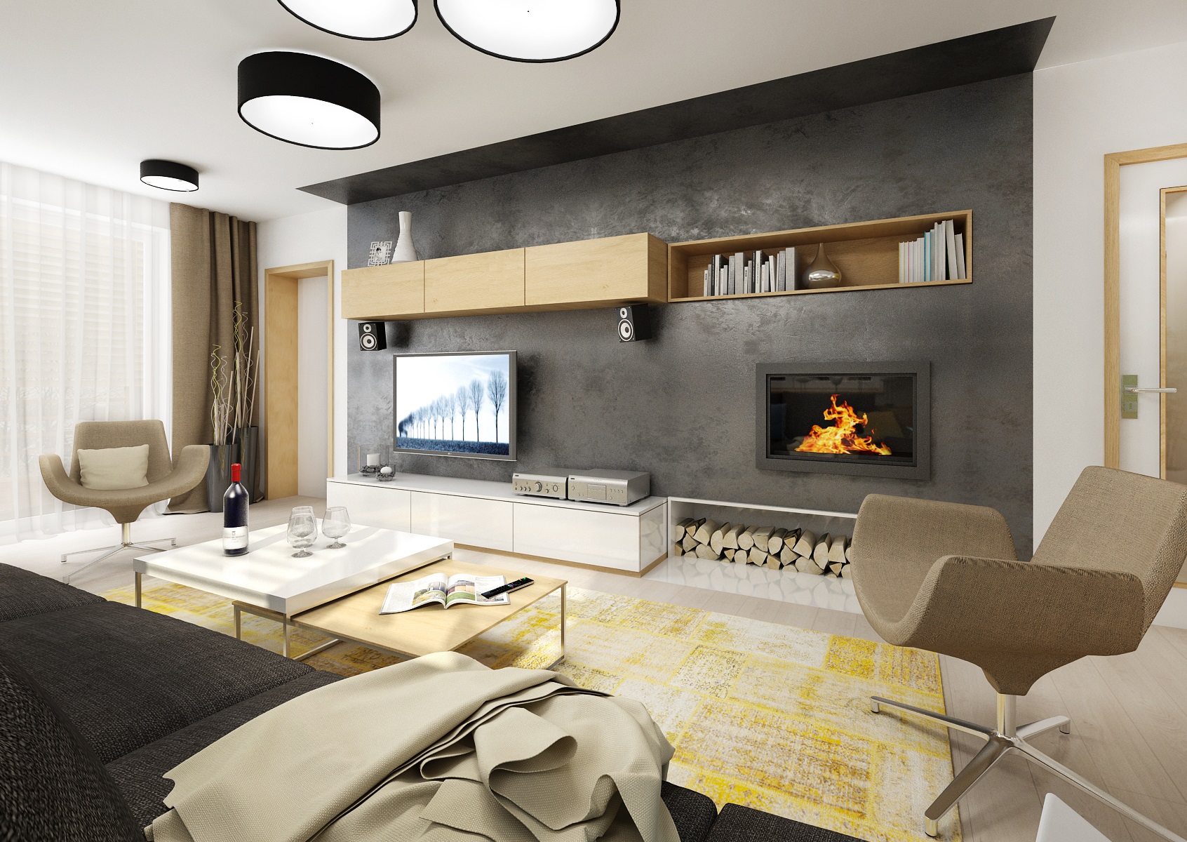 Kompletní návrh rekonstrukce rodinného domu v duchu přírodního dubu, bílého lesku, antracitové stěrky a textilu, doplněnými žlutými akcenty doplňků. Nejzajímavějšími prvky jsou např.: akvárium mezi jídelnou a obývacím pokojem, krbová kazeta Bef zapuštěná ve stěně obývacího pokoje, postel Mamma od tuzemské firmy Jitona.