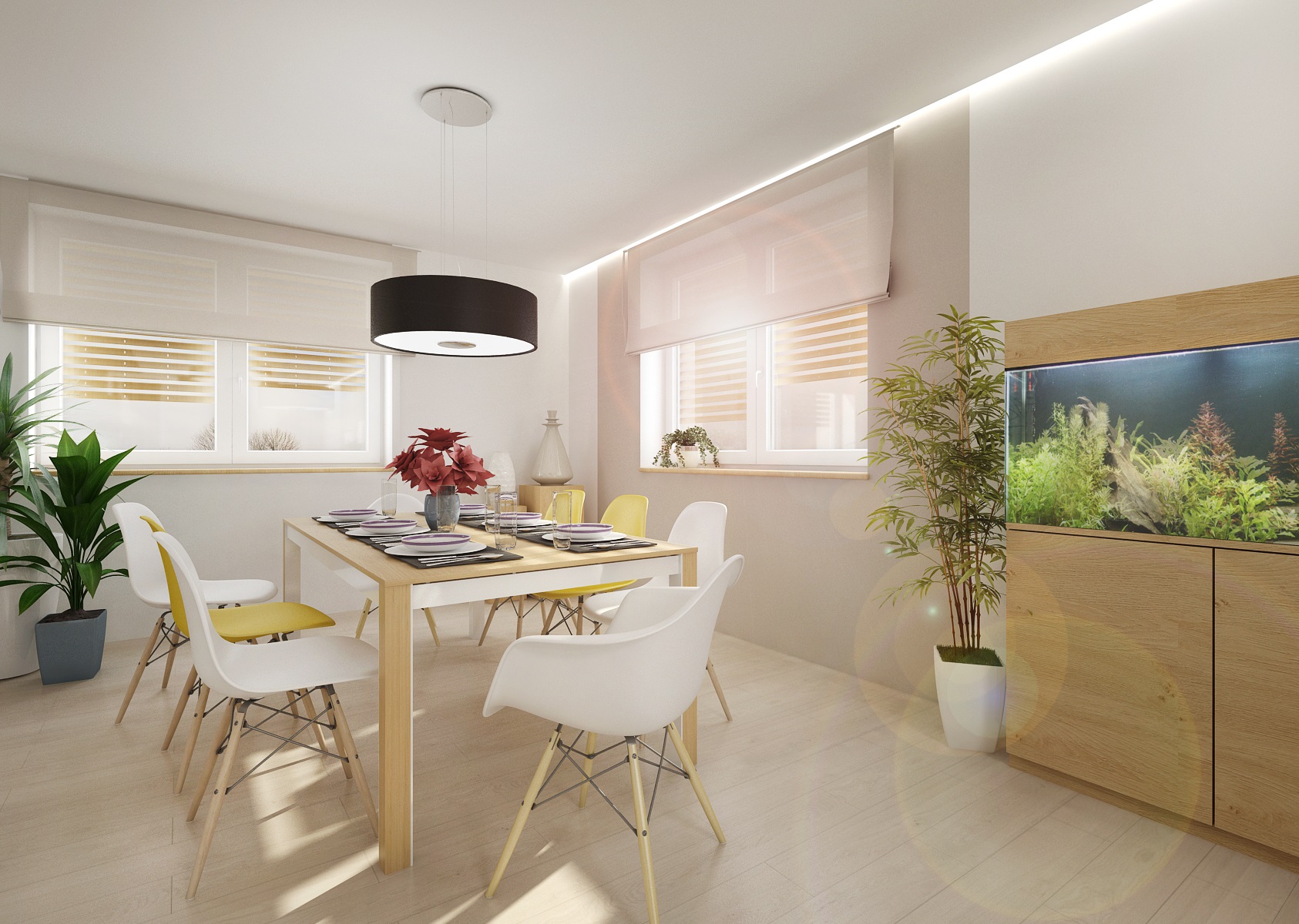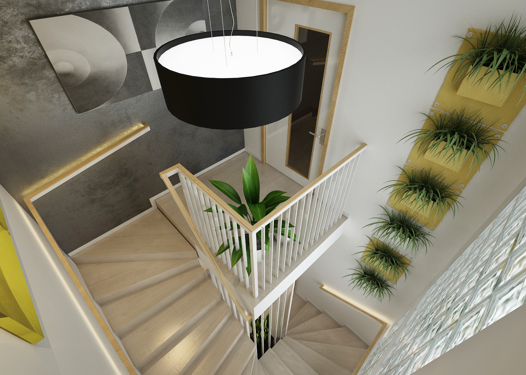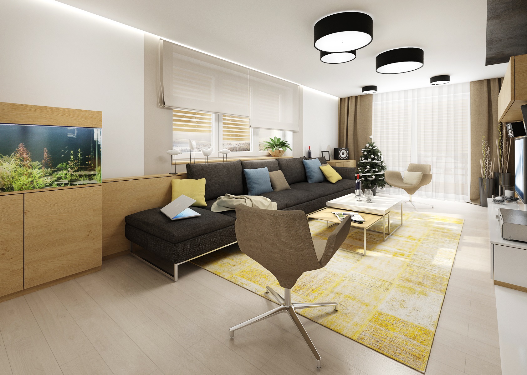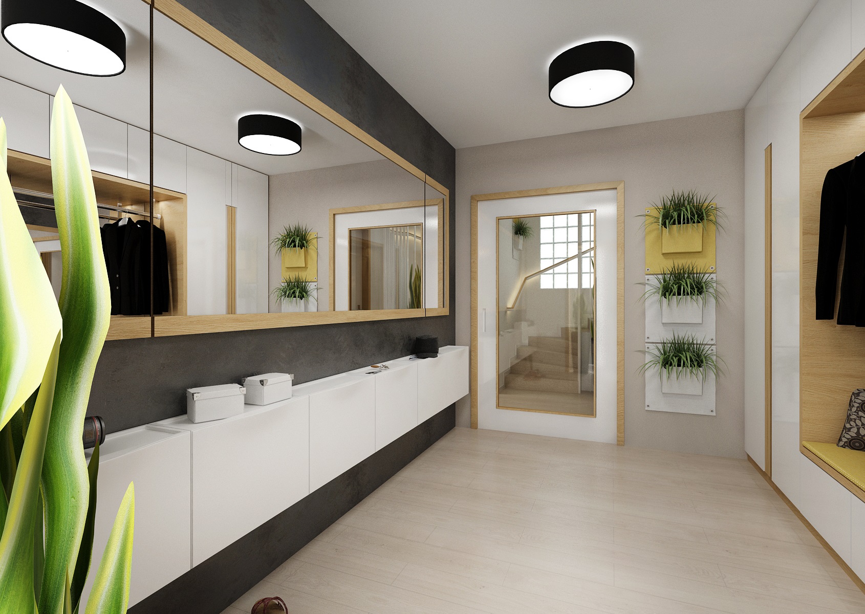 Kompletní návrh rekonstrukce rodinného domu v duchu přírodního dubu, bílého lesku, antracitové stěrky a textilu, doplněnými žlutými akcenty doplňků. Nejzajímavějšími prvky jsou např.: akvárium mezi jídelnou a obývacím pokojem, krbová kazeta Bef zapuštěná ve stěně obývacího pokoje, postel Mamma od tuzemské firmy Jitona.