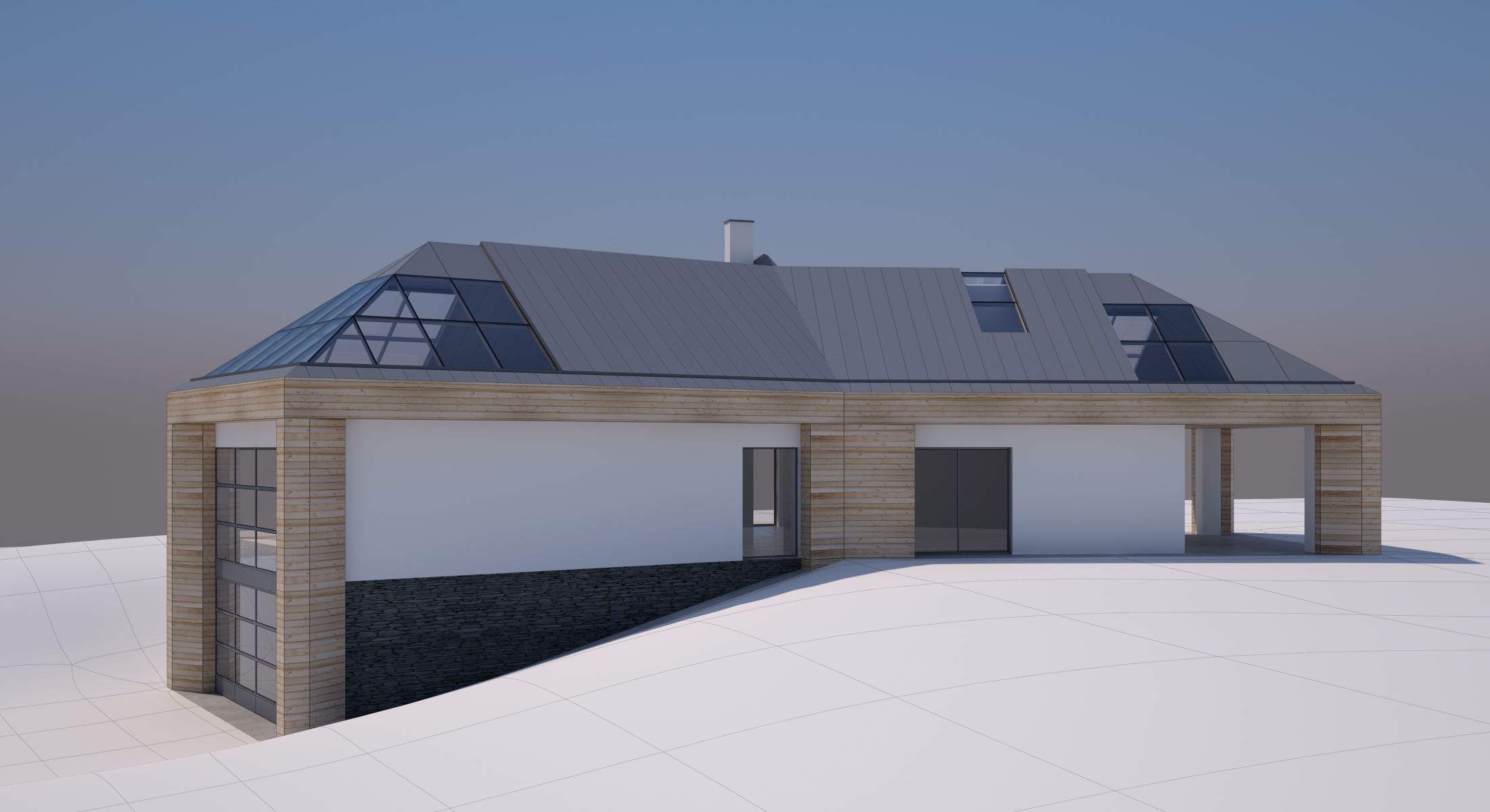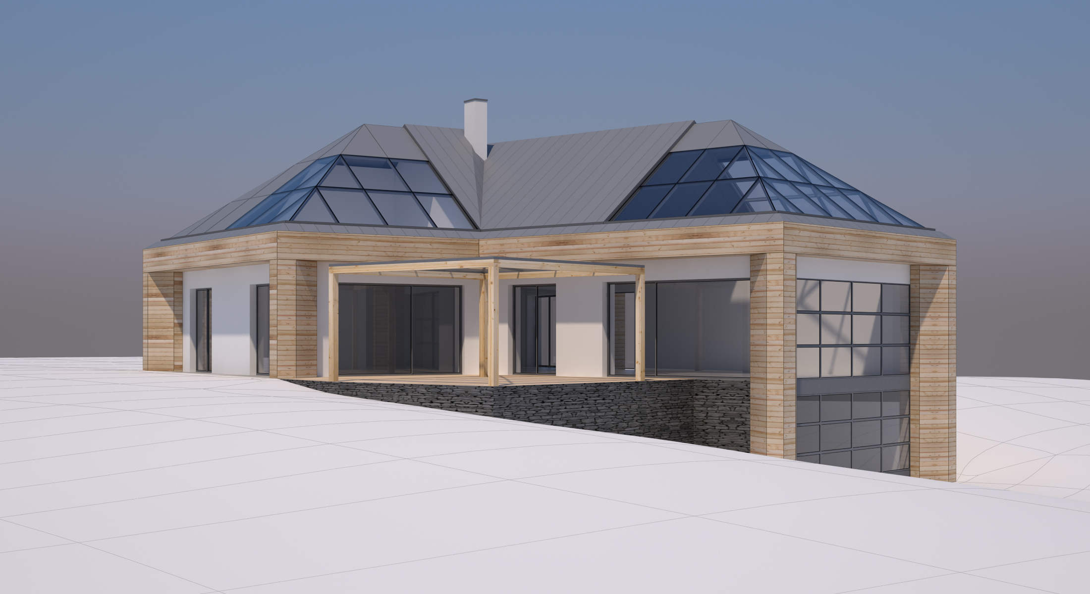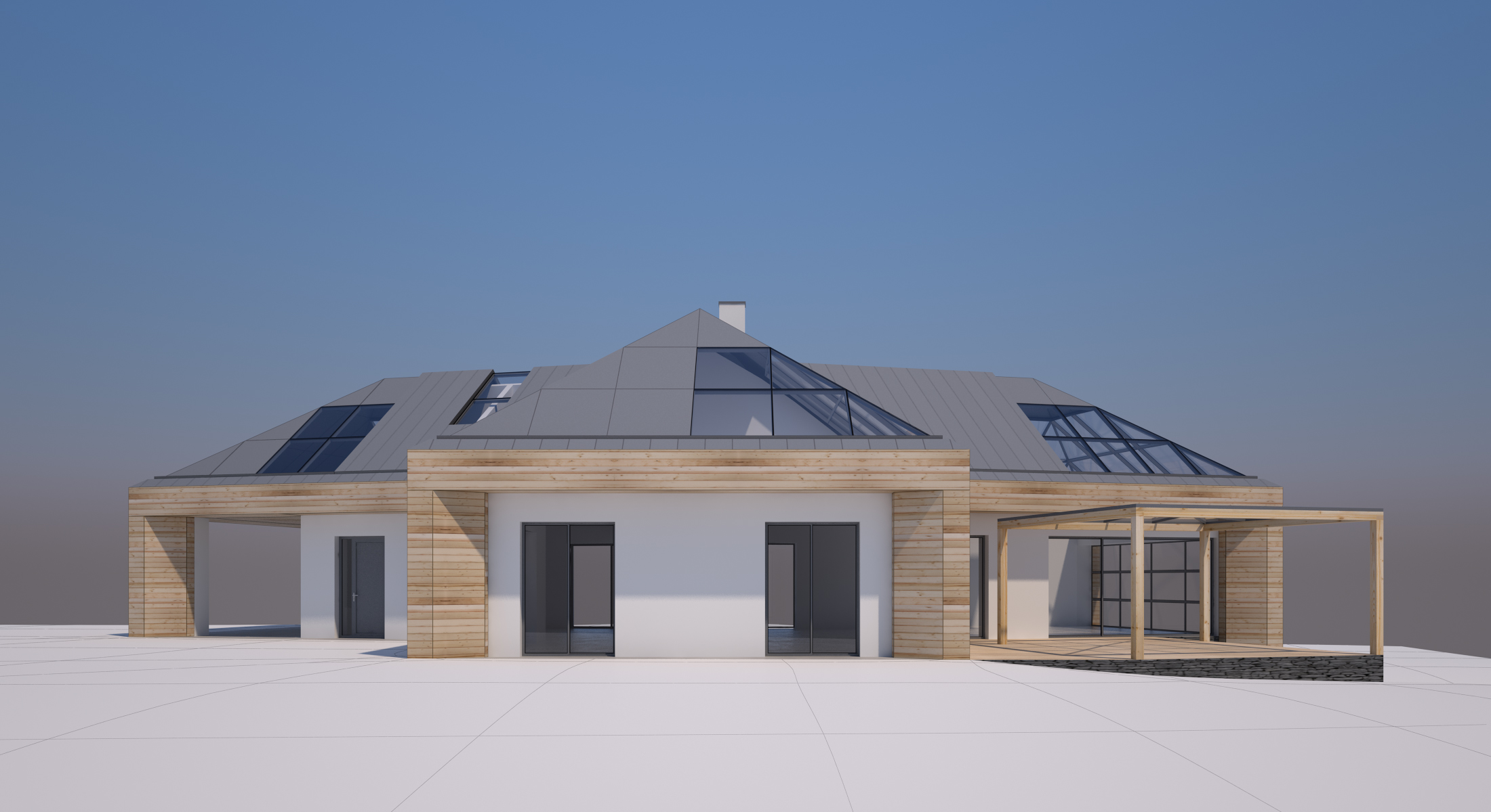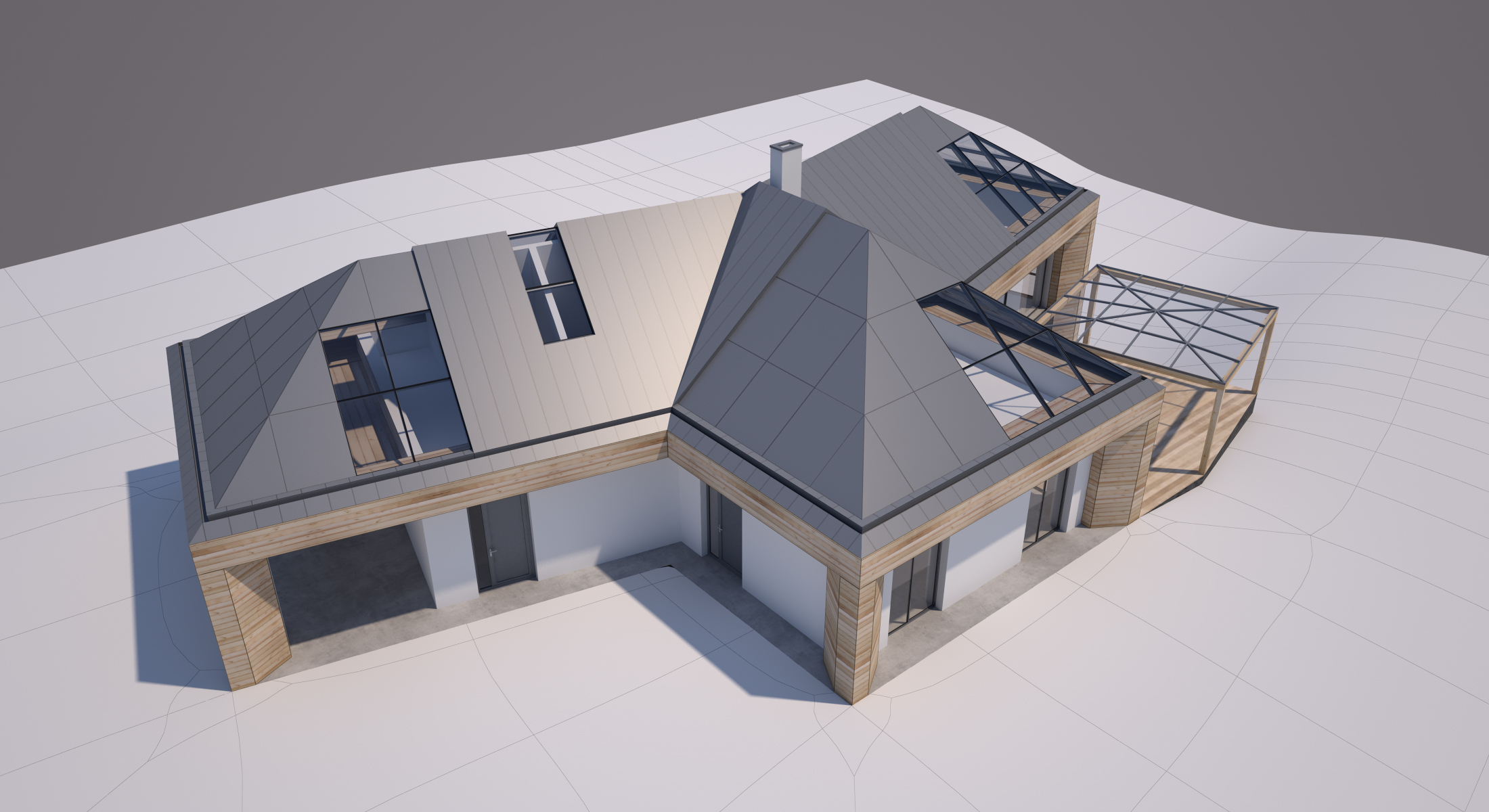 V novém návrhu zůstává zachován původní tvar střechy, ale dojde k výměně stávajících keramických střešních tašek za bezúdržbový titano-zinkový systém a z velké části jsou začleněny i prosklené plochy. Kompletně je plánována výměna oken za nová hliníková s trojskly, většinou posuvná francouzská.
