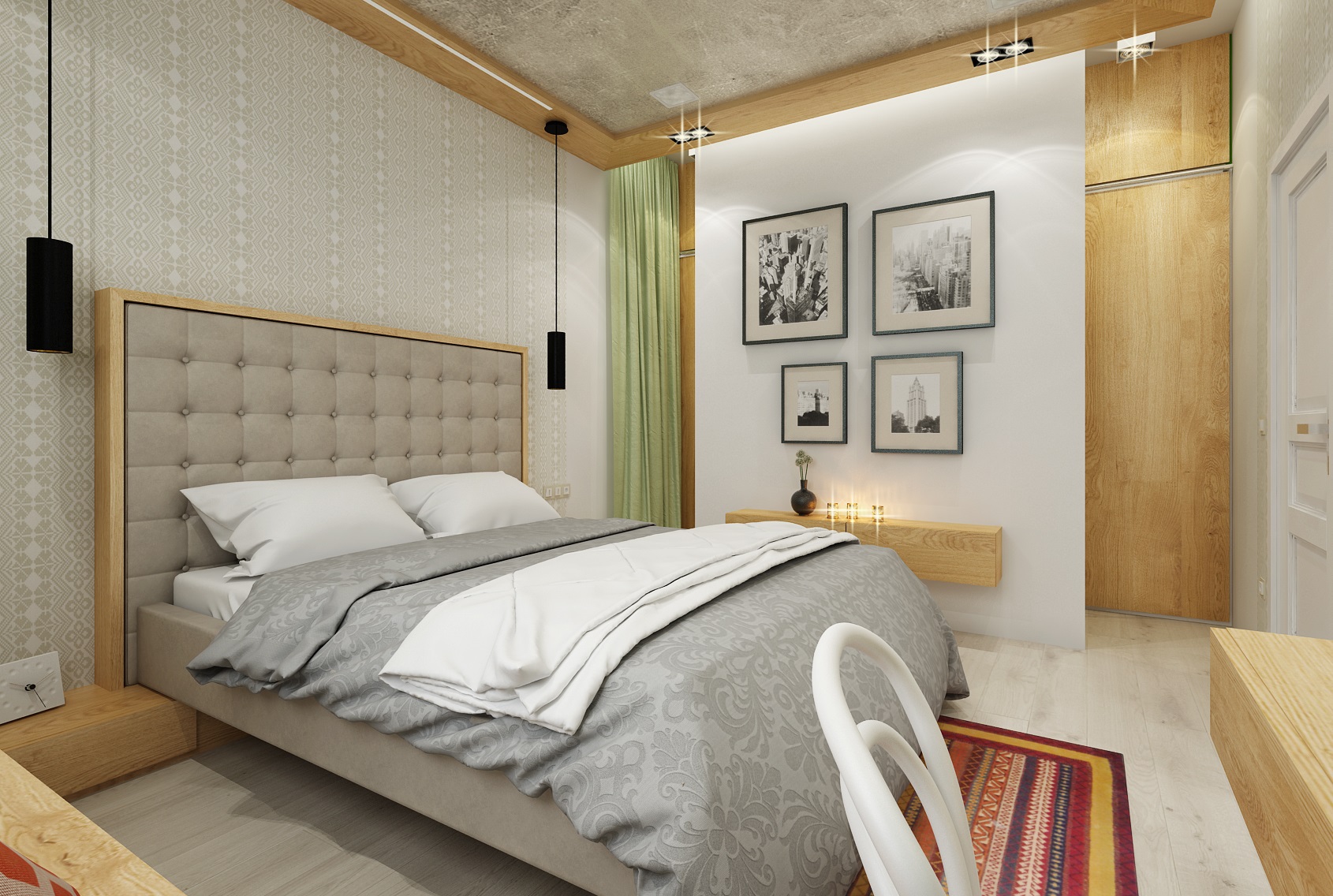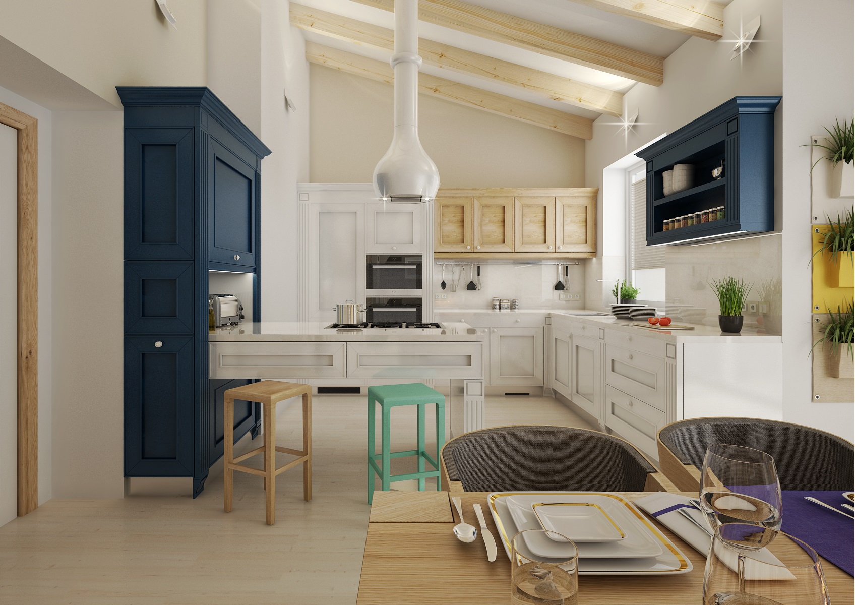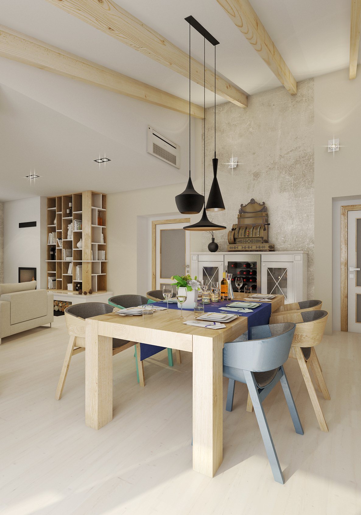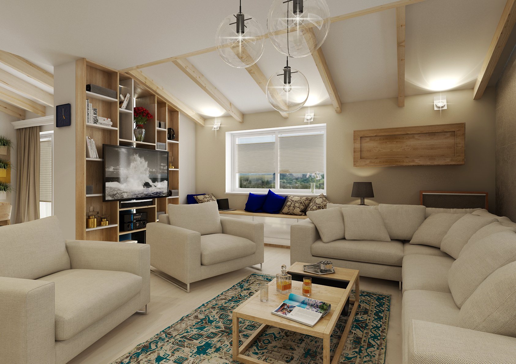 Moderní a přesto retro? Retro a moderní? V tomto projektu jsme obojí skloubili a použili např. rustikální kazetová dvířka, frézované sloupky a lišty u kuchyně. V modernějším obývacím pokoji a jídelně zase dodává retro nádech perský koberec, přiznané trámy, svítidla od Toma Dixona a jako perlička stará kasa. Ložnice má zase výrazně prošívané čelo postele, vzory na tapetě a koberci. V koupelně je použit na stěně se zrcadlem výrazný retro obklad Metro.