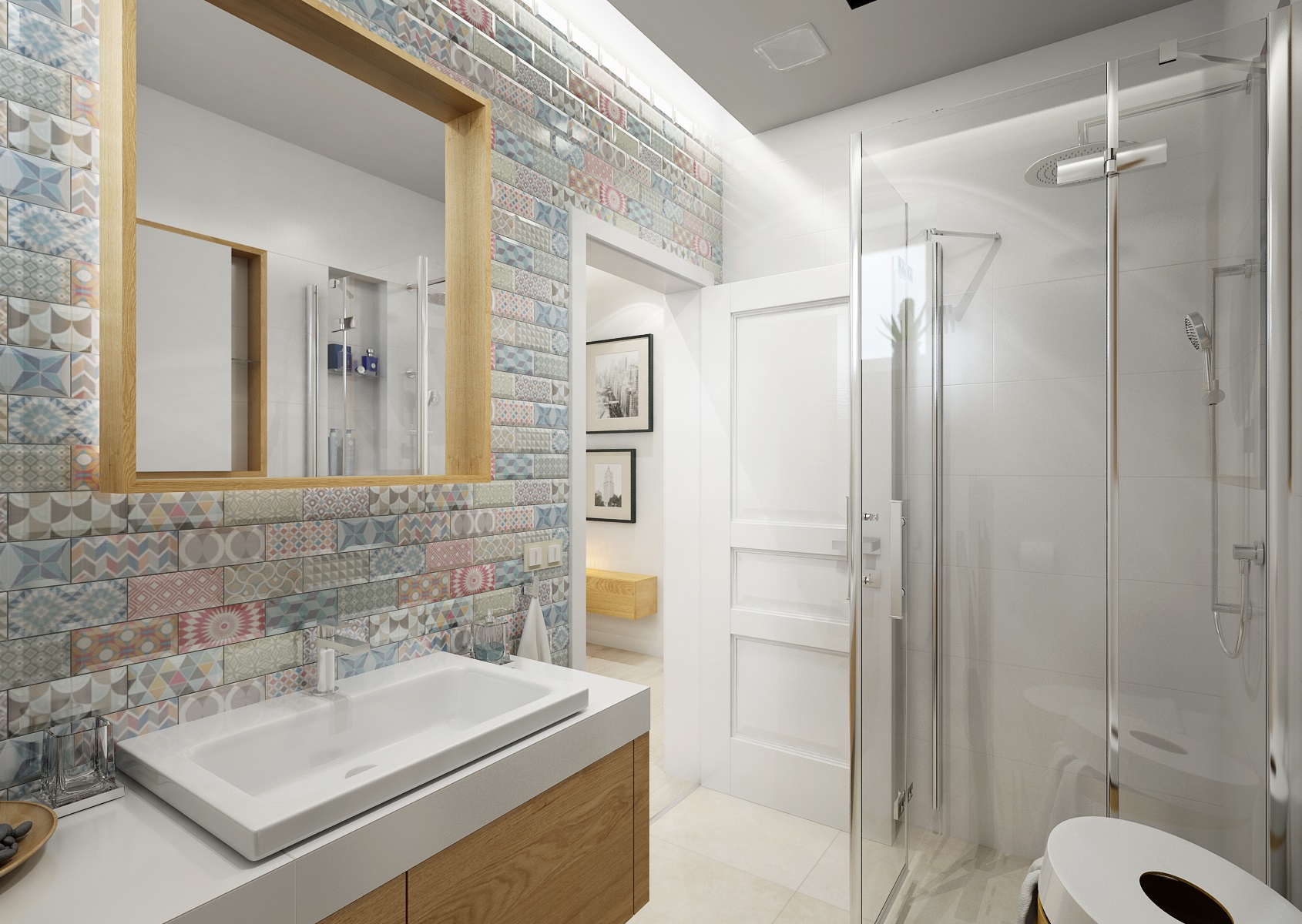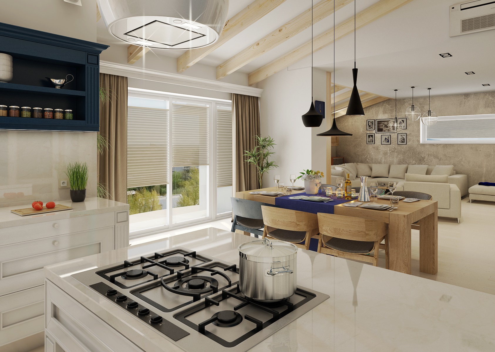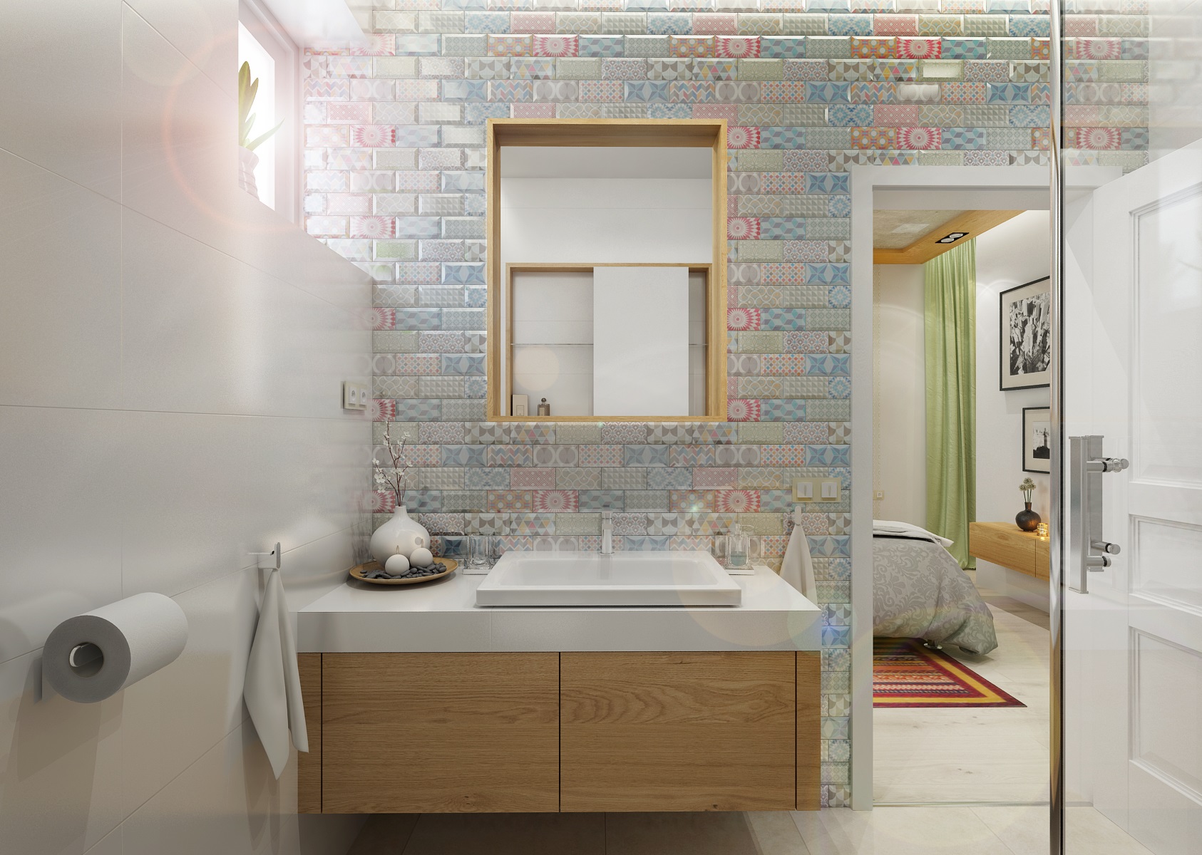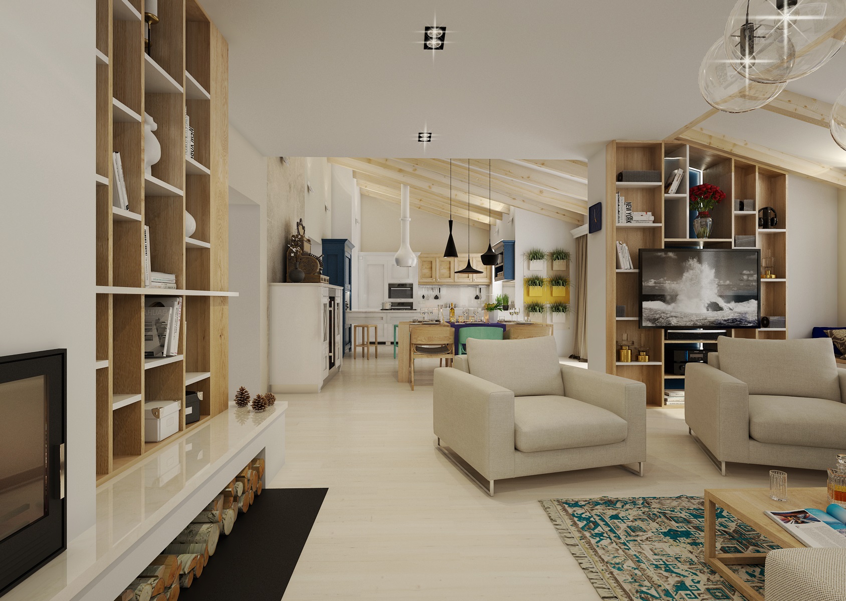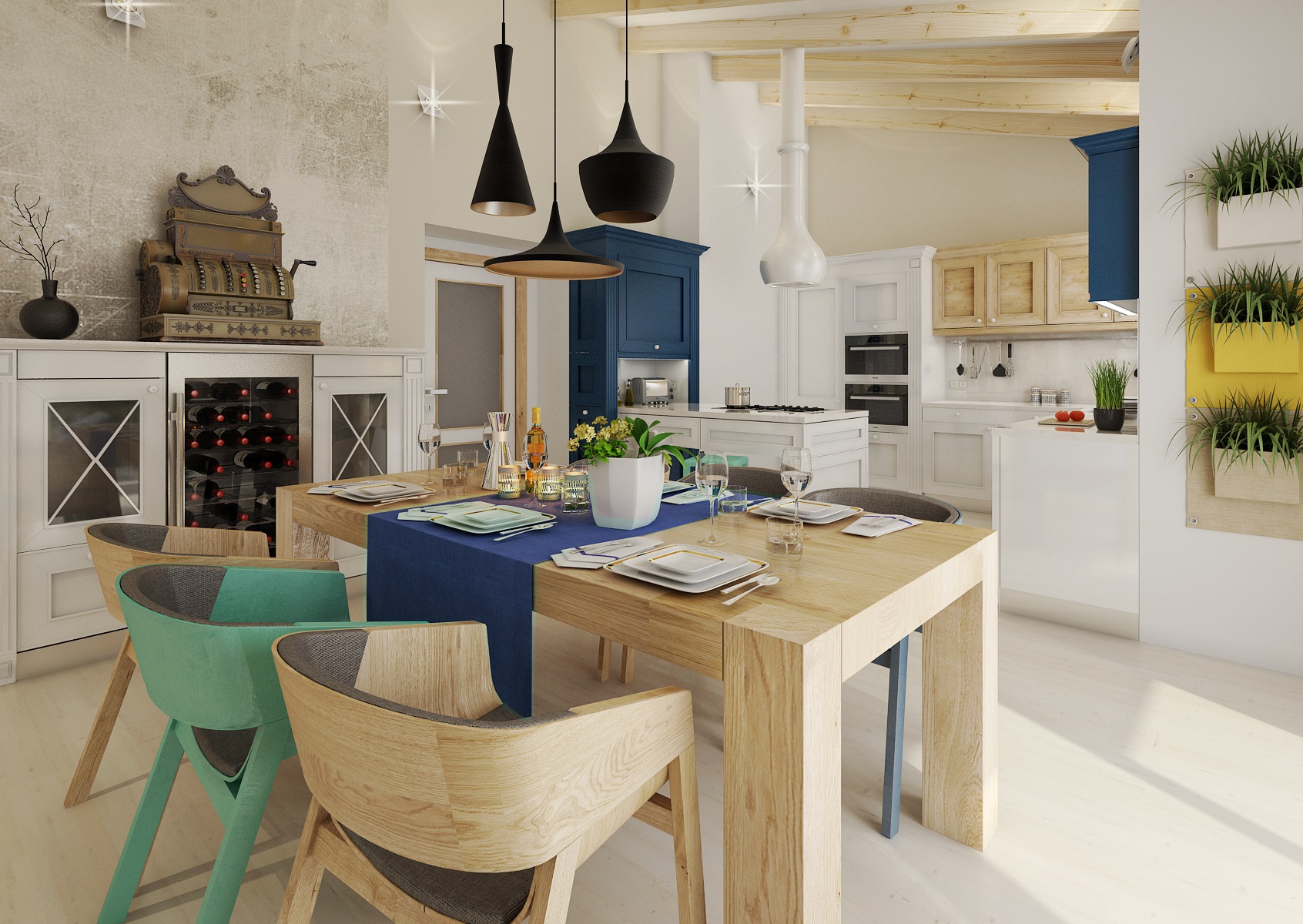 Moderní a přesto retro? Retro a moderní? V tomto projektu jsme obojí skloubili a použili např. rustikální kazetová dvířka, frézované sloupky a lišty u kuchyně. V modernějším obývacím pokoji a jídelně zase dodává retro nádech perský koberec, přiznané trámy, svítidla od Toma Dixona a jako perlička stará kasa. Ložnice má zase výrazně prošívané čelo postele, vzory na tapetě a koberci. V koupelně je použit na stěně se zrcadlem výrazný retro obklad Metro.
