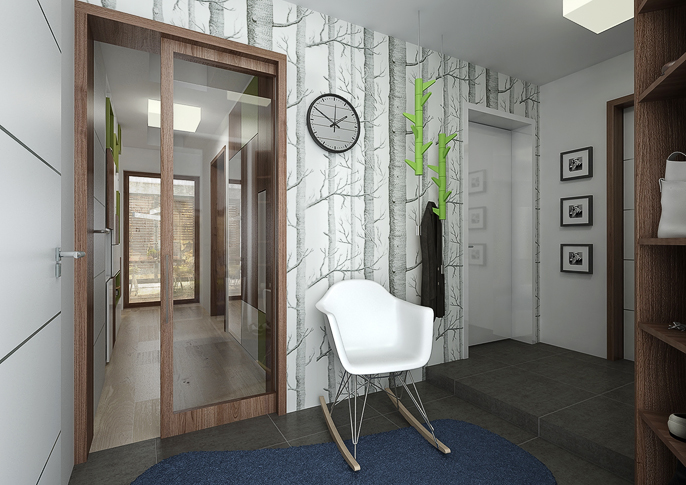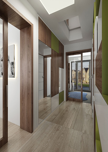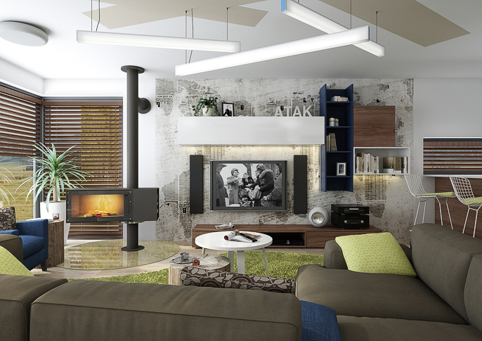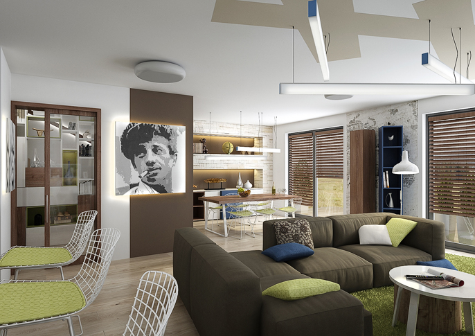 Svěží interiér všech místností proveden převážně v dubové dýze, kterou doplňují kontrastní barvy v zeleném a modrém laminu. Industriálněji pojatá TV stěna nemusí působit neútulně, ale právě naopak oživuje obývací pokoj spojený s kuchyní a jídelnou. Zvláštním prvkem je netradičně umístěný krb.