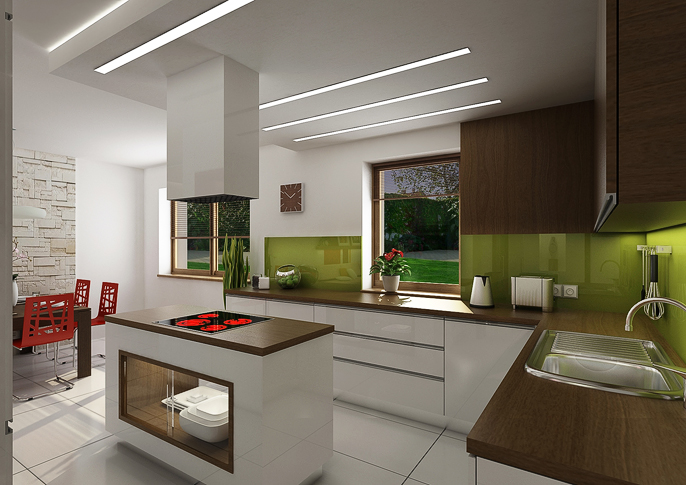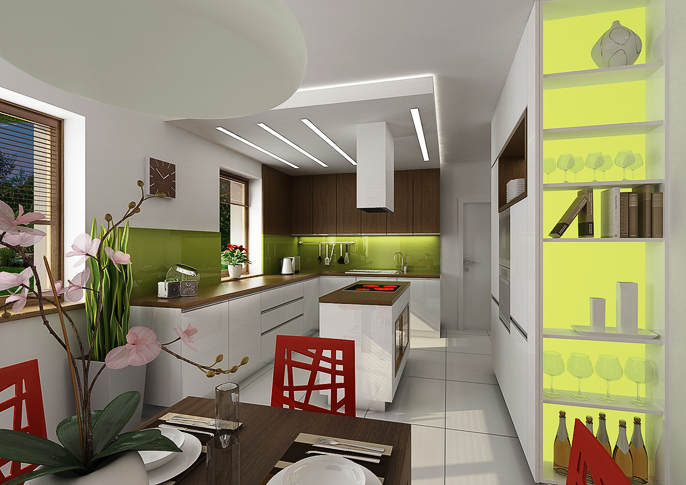 Vzdušný, světlý, jednoduchý s nábytkem v dřevěné dýze a doplněný svěží zelenou a zemitou hnědou- takový je interiér rodinného domku v prostředí Pavlovských vrchů. Kuchyňská linka osazena osvětleným obkladem z materiálu Lacobel.