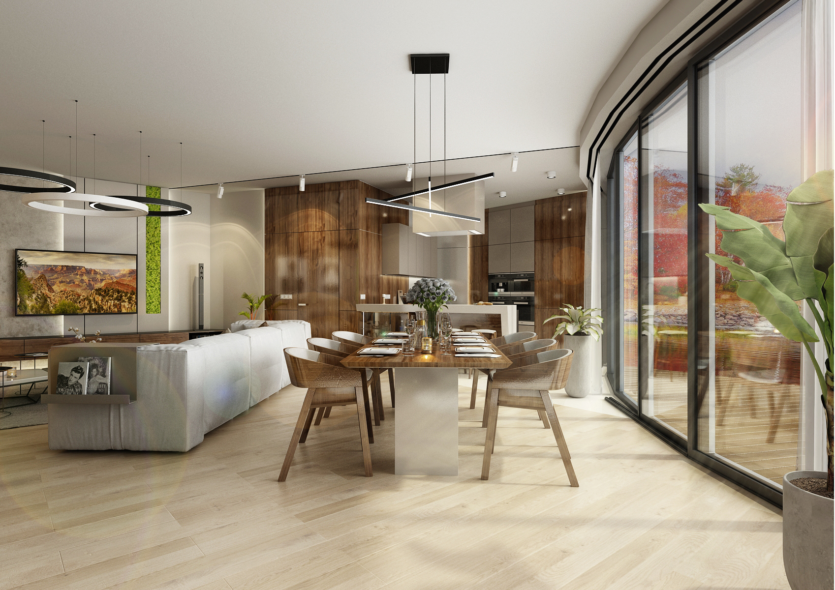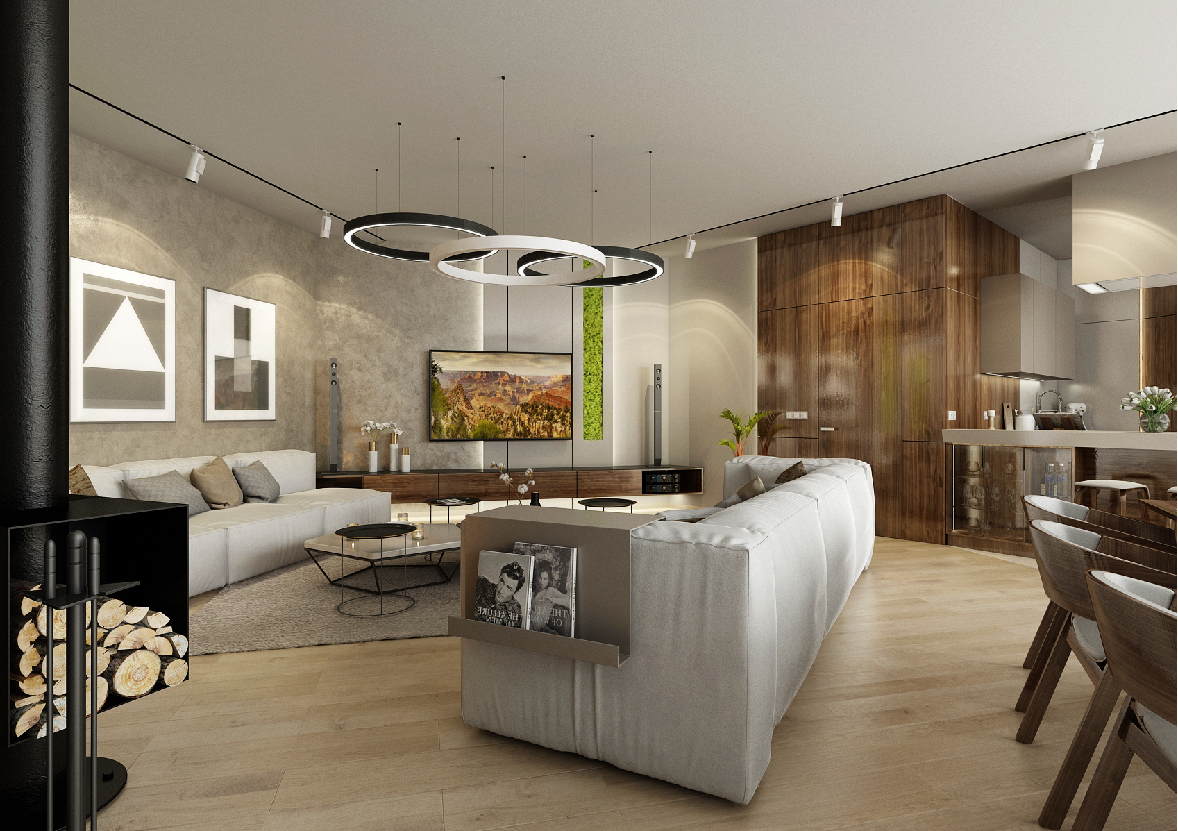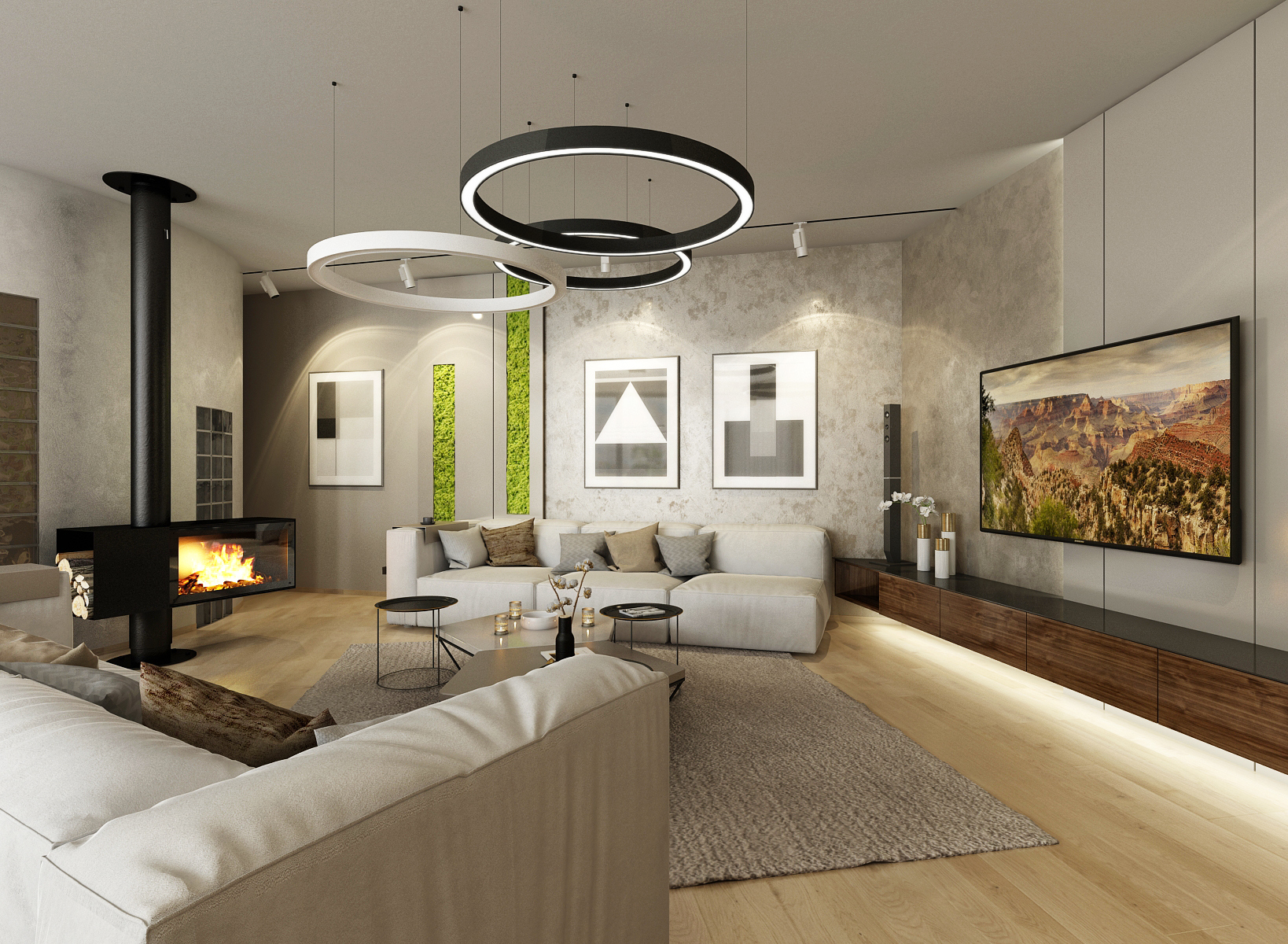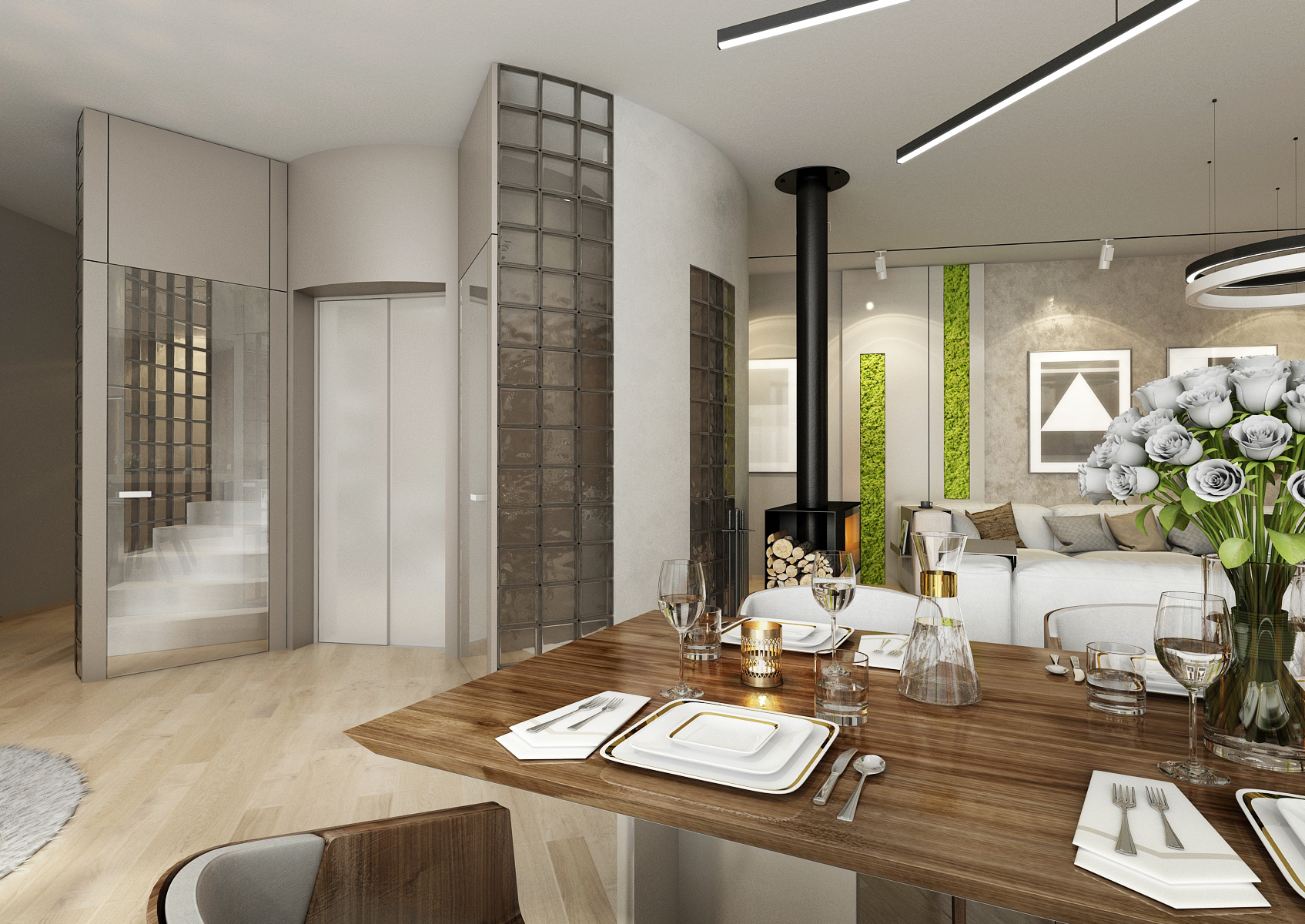 Do terénu zasazený RD s vyhlídkou na Znojmo, kterou umožnuje atypická prosklená stěna domu prohnutá do luku. Zaoblené jsou i křivky centrální schodiště, které obtáčí tubus výtahu a od pokoje je odděleno příčkou s luxfery a uzavřeno za skleněné dveře. Vícefunkční otevřený prostor má velkorysé rozměry. V kontrastu se světlou dubovou podlahu je použita výrazná ořechová dýha s vysokým leskem, přesněji Ořech Pacific tabákový. Kuchyňská linka s barovým pultem plynule přechází v „ořechové“ jádro, kde se skrývá koupelna.