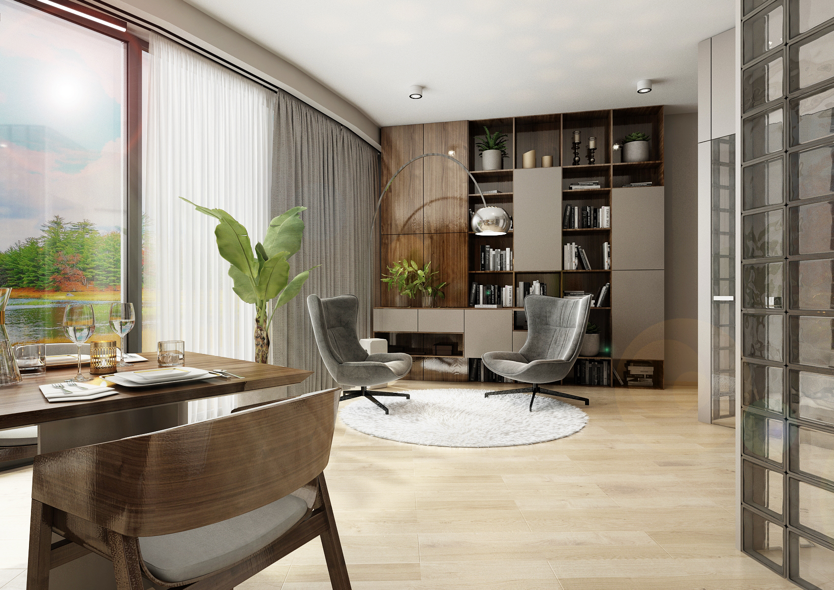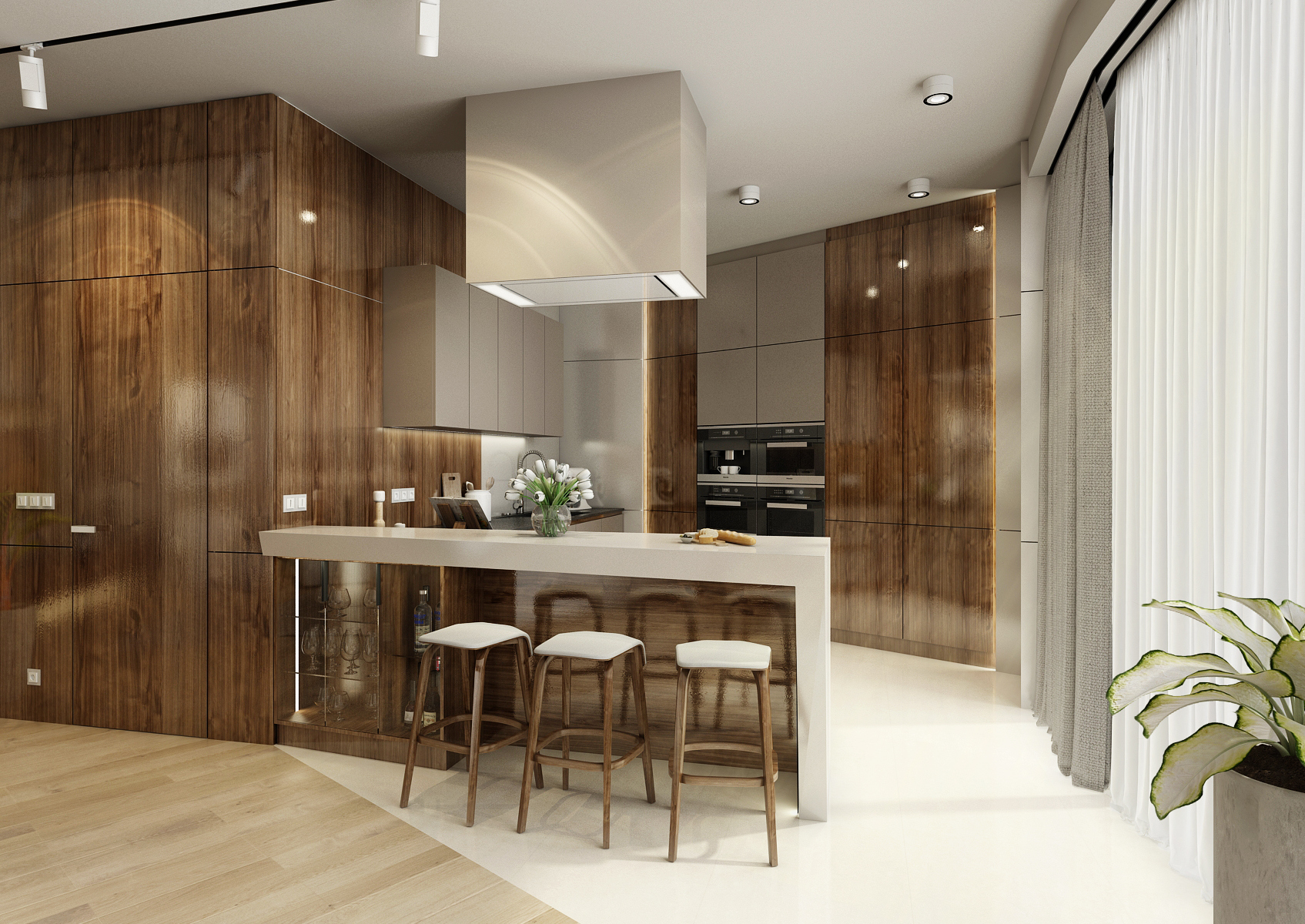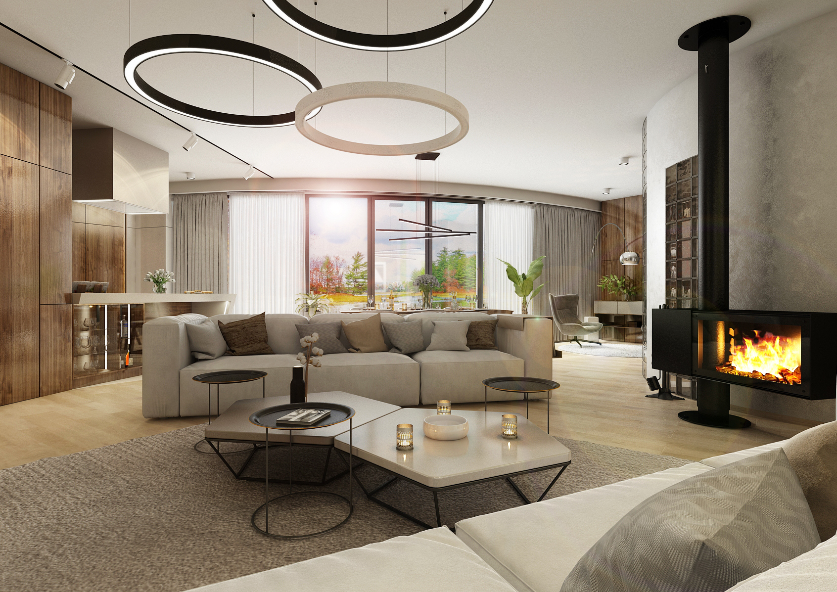 Do terénu zasazený RD s vyhlídkou na Znojmo, kterou umožnuje atypická prosklená stěna domu prohnutá do luku. Zaoblené jsou i křivky centrální schodiště, které obtáčí tubus výtahu a od pokoje je odděleno příčkou s luxfery a uzavřeno za skleněné dveře. Vícefunkční otevřený prostor má velkorysé rozměry. V kontrastu se světlou dubovou podlahu je použita výrazná ořechová dýha s vysokým leskem, přesněji Ořech Pacific tabákový. Kuchyňská linka s barovým pultem plynule přechází v „ořechové“ jádro, kde se skrývá koupelna.