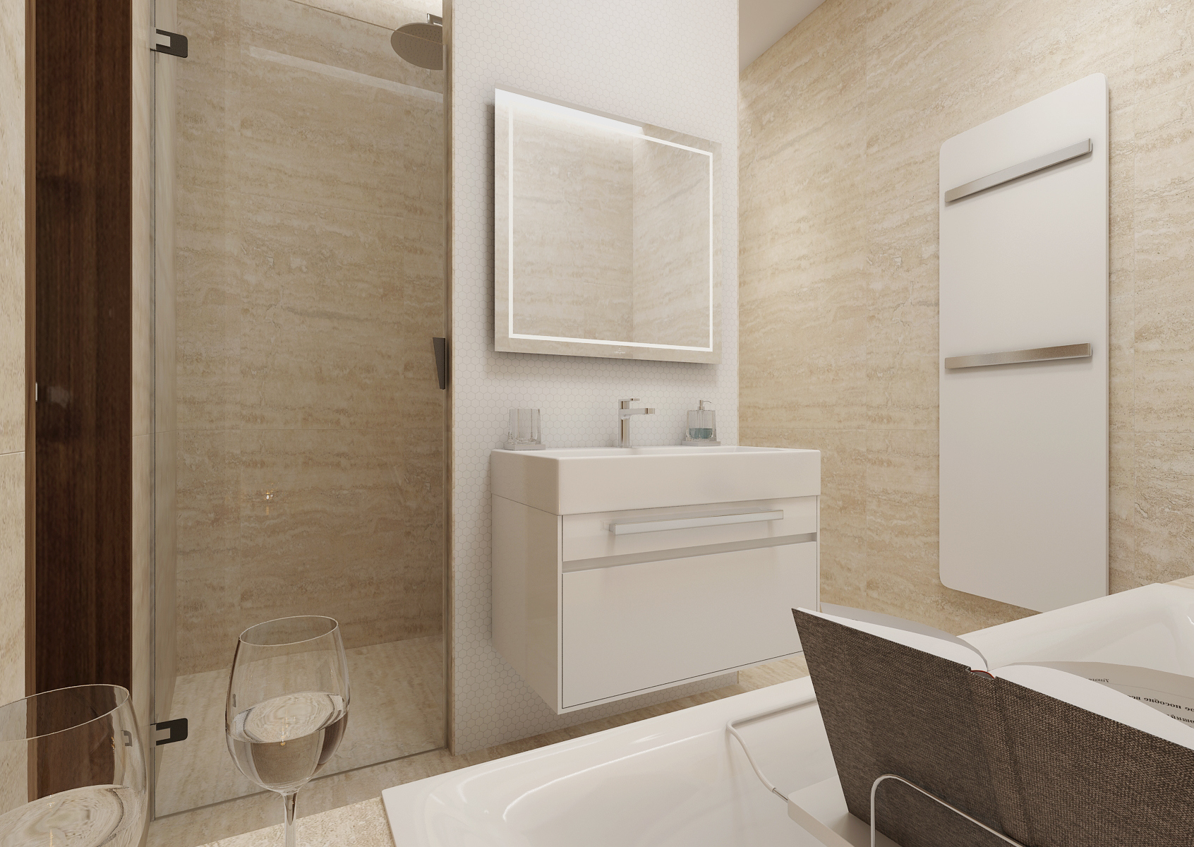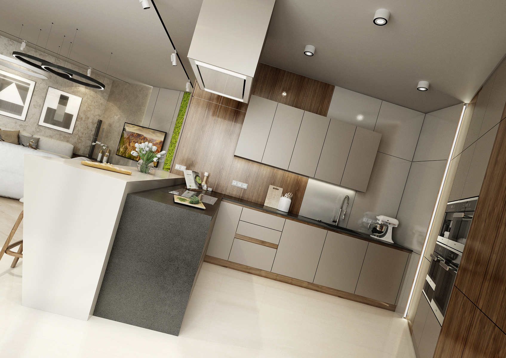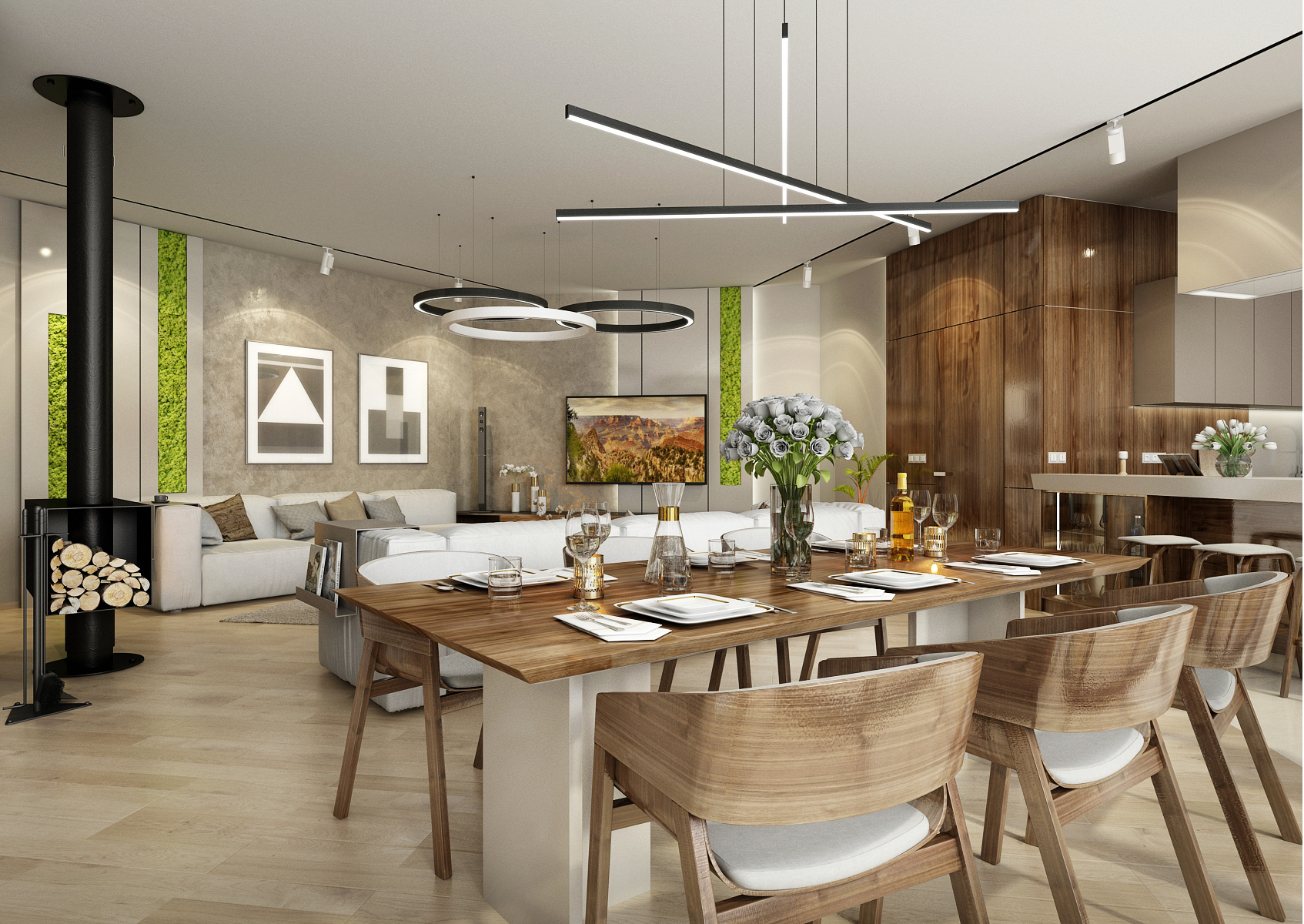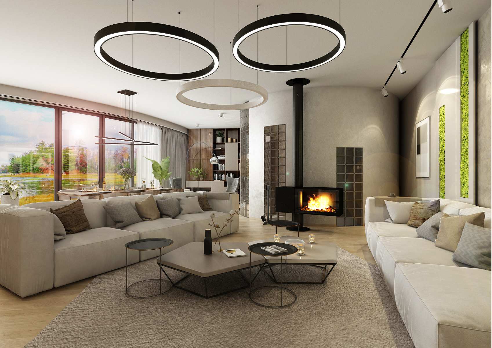 Do terénu zasazený RD s vyhlídkou na Znojmo, kterou umožnuje atypická prosklená stěna domu prohnutá do luku. Zaoblené jsou i křivky centrální schodiště, které obtáčí tubus výtahu a od pokoje je odděleno příčkou s luxfery a uzavřeno za skleněné dveře. Vícefunkční otevřený prostor má velkorysé rozměry. V kontrastu se světlou dubovou podlahu je použita výrazná ořechová dýha s vysokým leskem, přesněji Ořech Pacific tabákový. Kuchyňská linka s barovým pultem plynule přechází v „ořechové“ jádro, kde se skrývá koupelna.