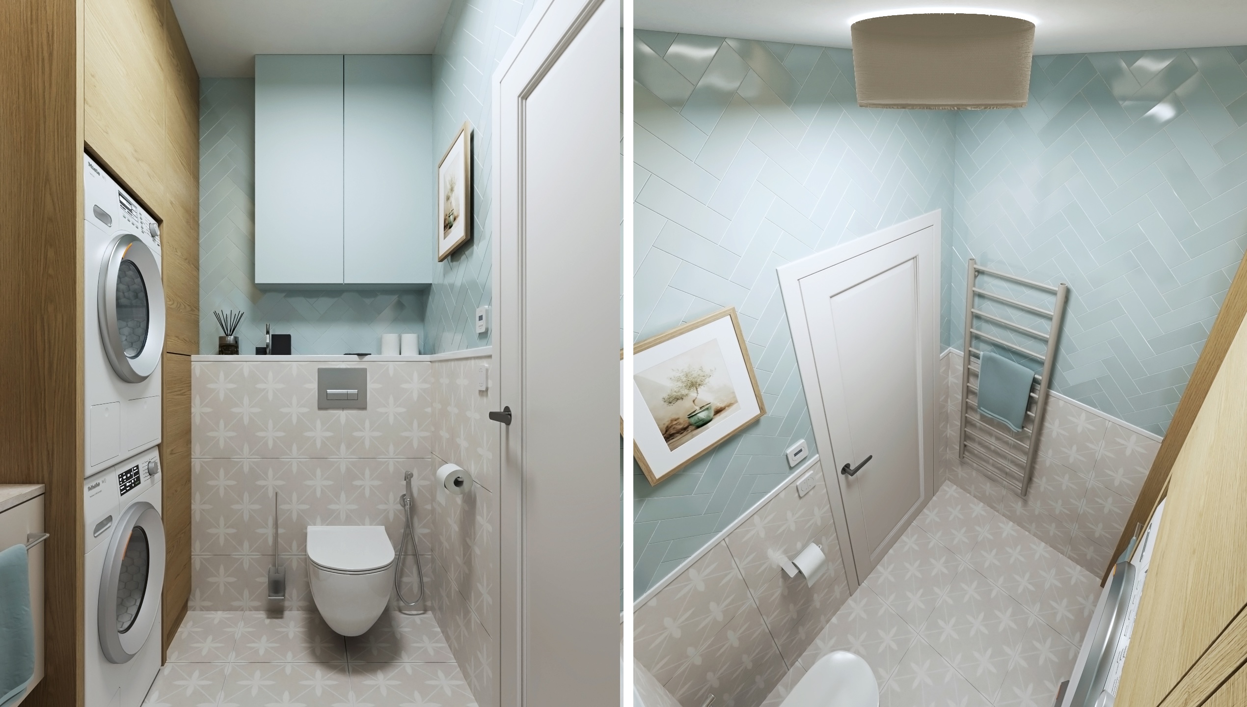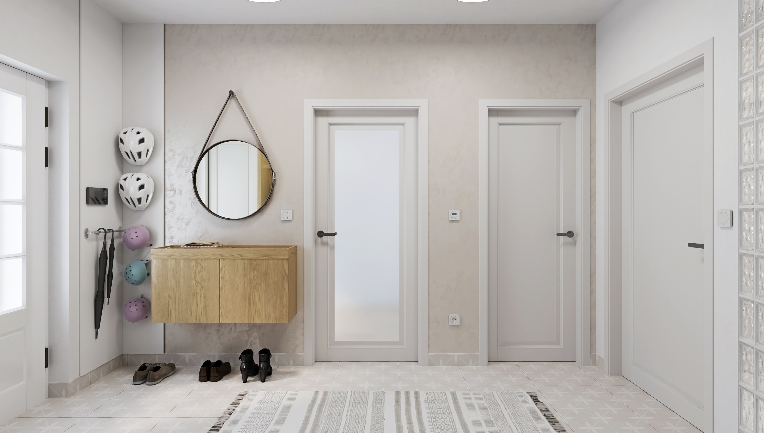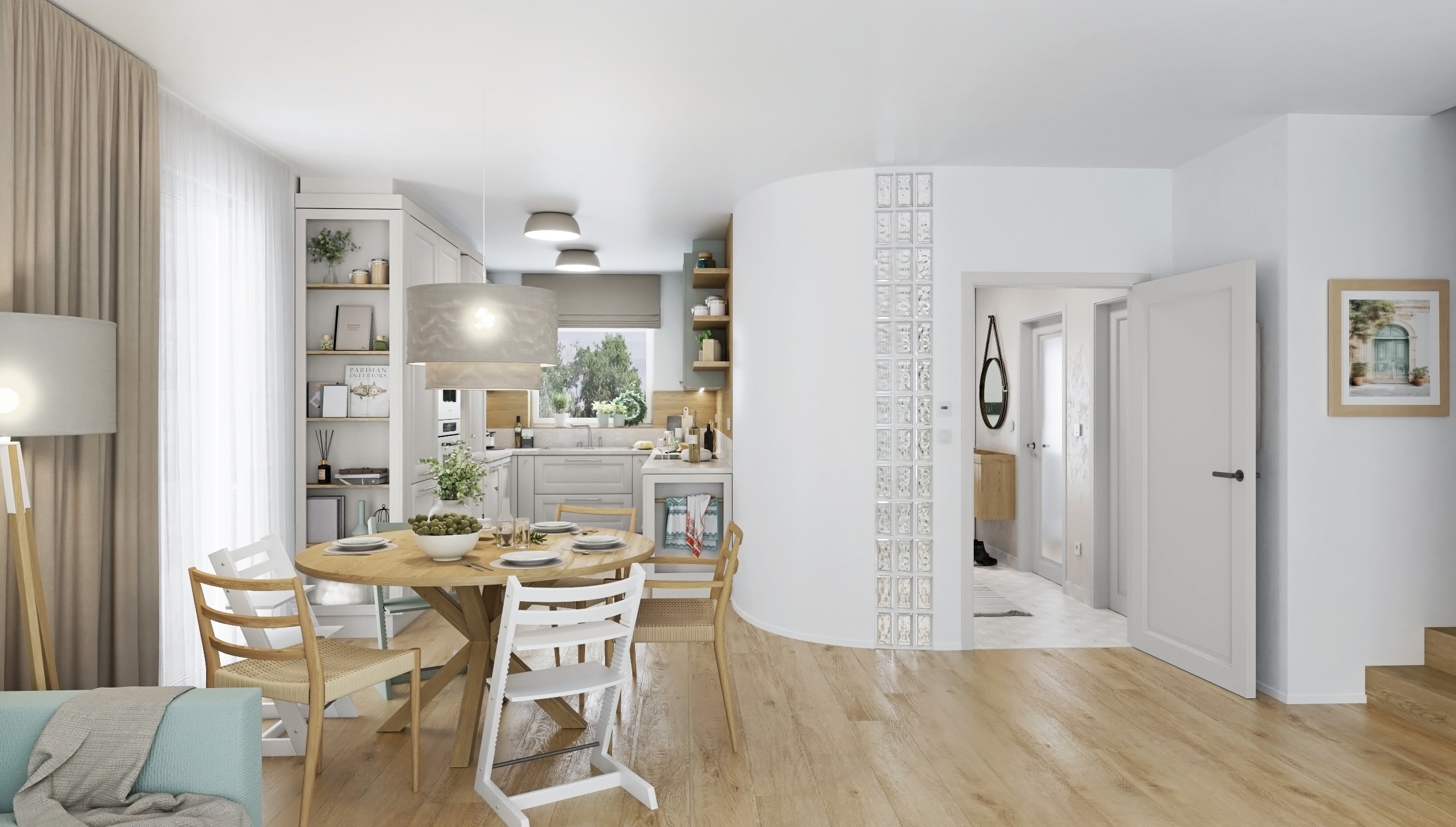 Interiér domu je postaven na kombinaci přírodního dřeva, jemných krémových tónů a pastelově laděných prvků, které vytvářejí útulnou a harmonickou atmosféru.