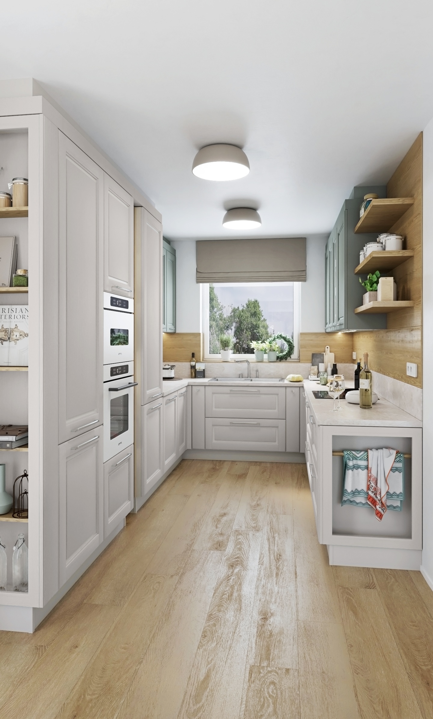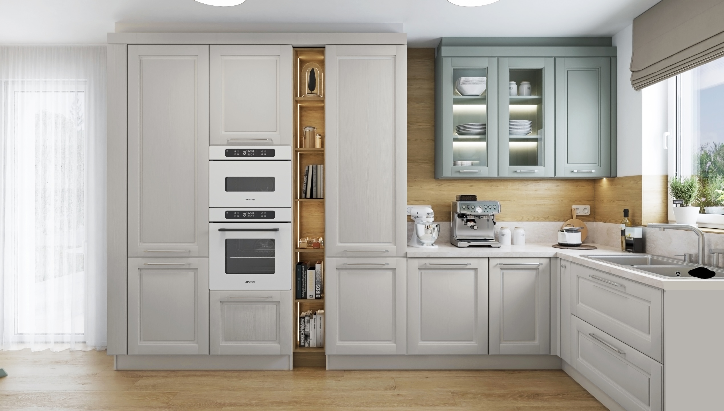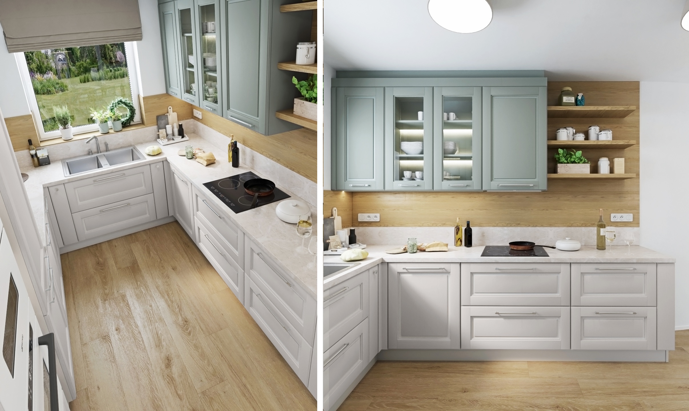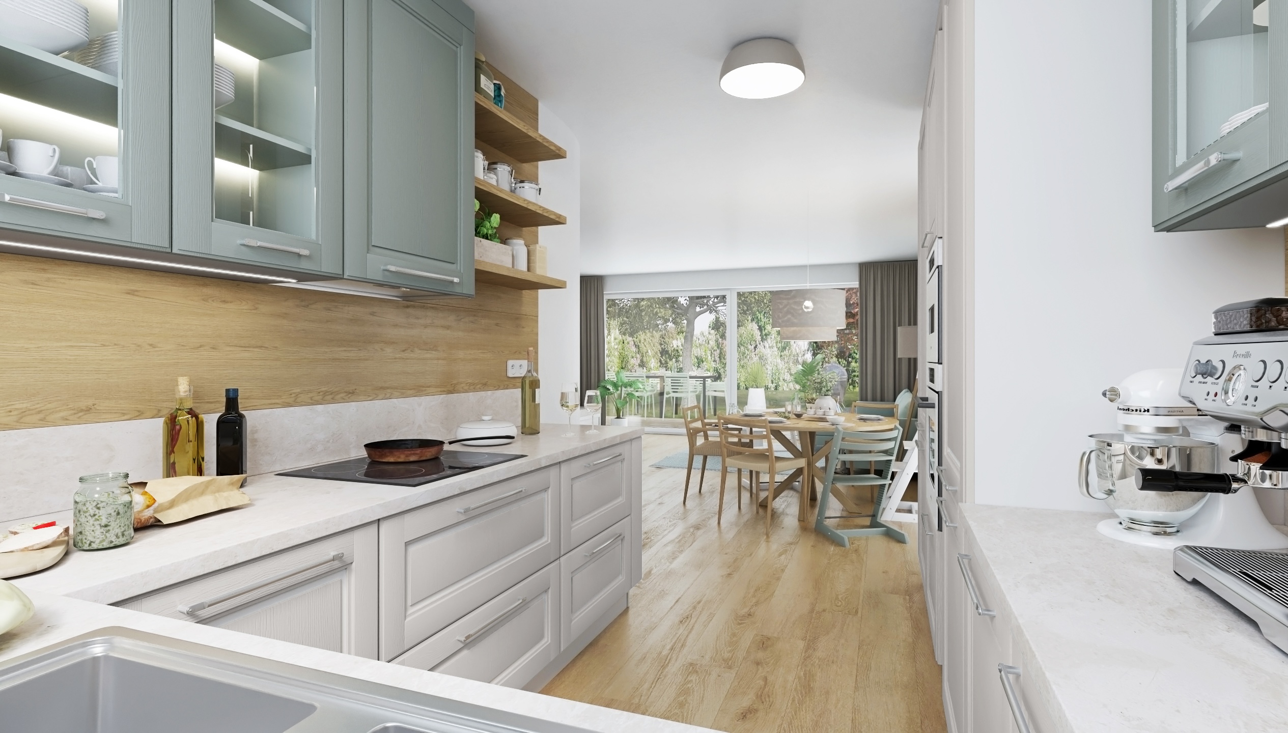 Dřevěné obklady, otevřené police a tradičně tvarovaná dvířka kuchyňských skříněk podtrhují rustikální charakter prostoru. Dispozice domu je navržena s důrazem na praktičnost a pohodlí každodenního života, od prostorné kuchyně propojené s jídelnou až po promyšlené úložné prostory v chodbě. Každý detail podporuje pocit domova, kde se přirozeně setkává rodina i přátelé.