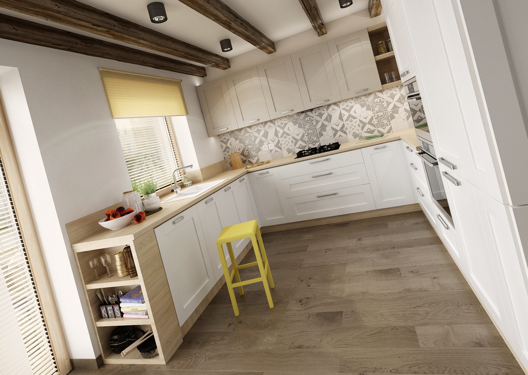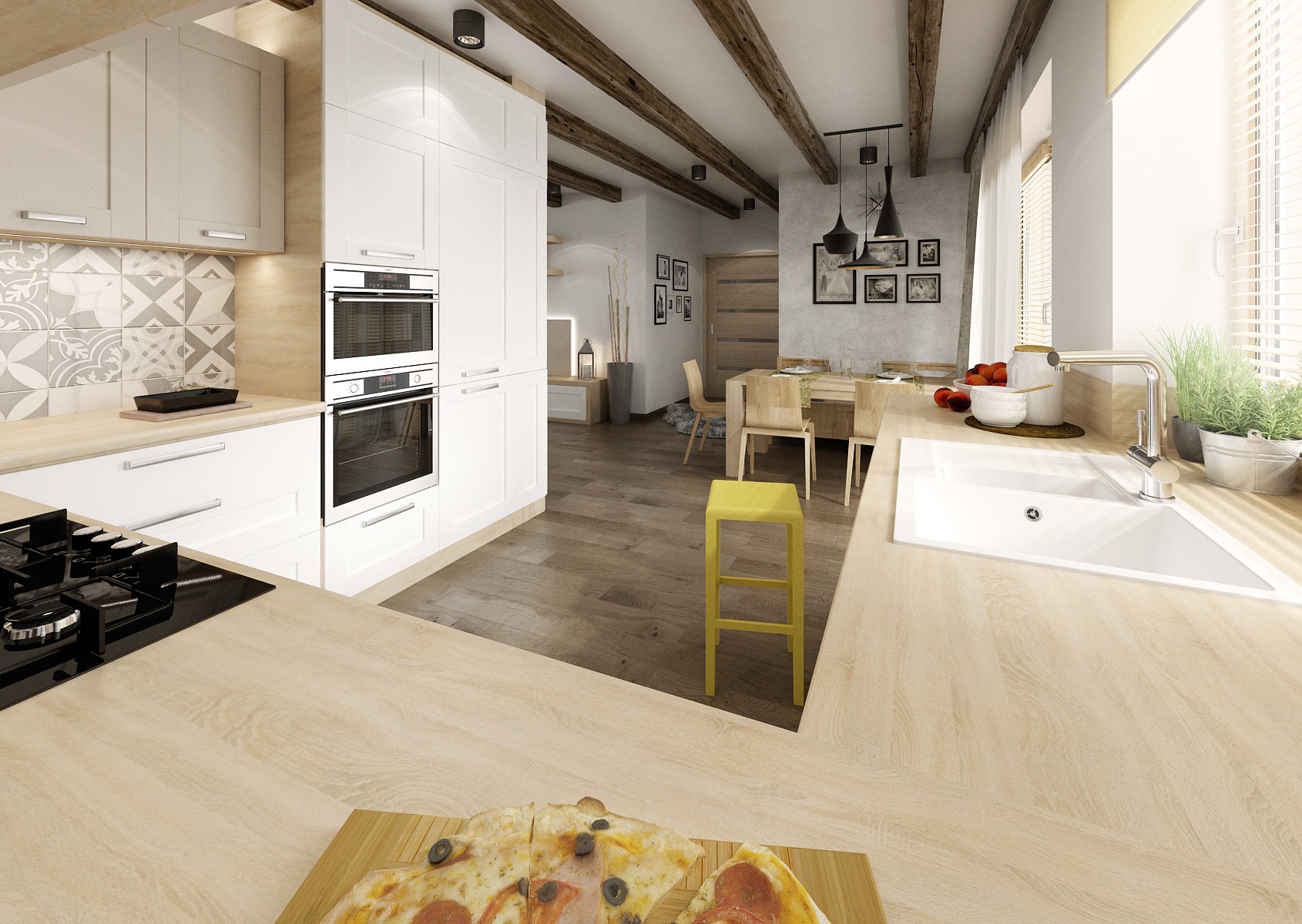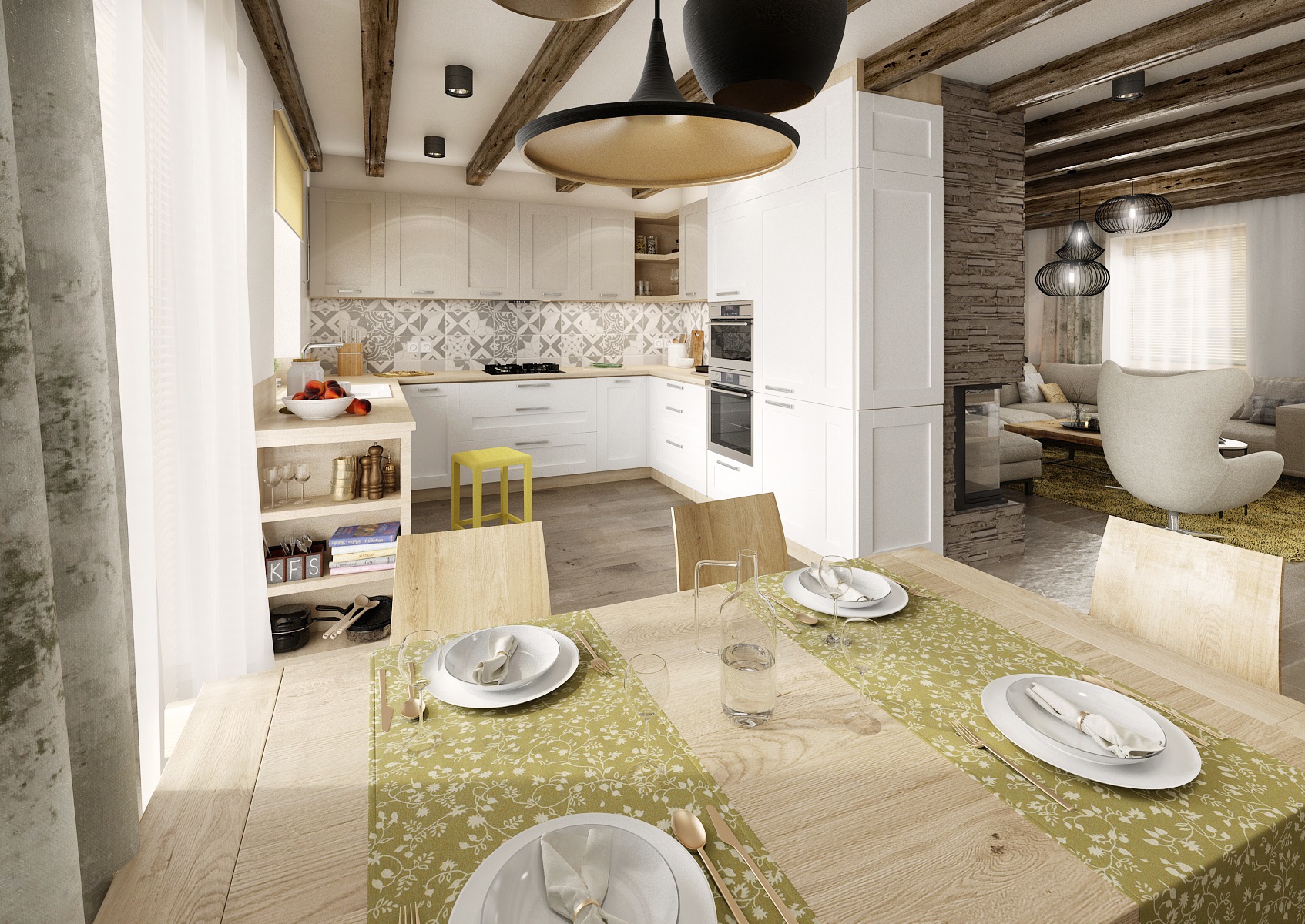 Barevný koncept tohoto interiéru je tmavá podlaha a světlý nábytek. Plovoucí podlaha je v dekoru tabákového dubu se strukturou rustikálního dřeva. Oproti na nábytku použitého dekoru přírodní dubu, v kuchyni kombinovaného s bílou a béžovou matnou fólií. Kazetová dvířka a retro obklady kuchyńské linky, kovová svítidla, obklad krbu À la kámen a přiznané stropní trámy odpovídají zamýšlenému novodobému rustikálnímu stylu.