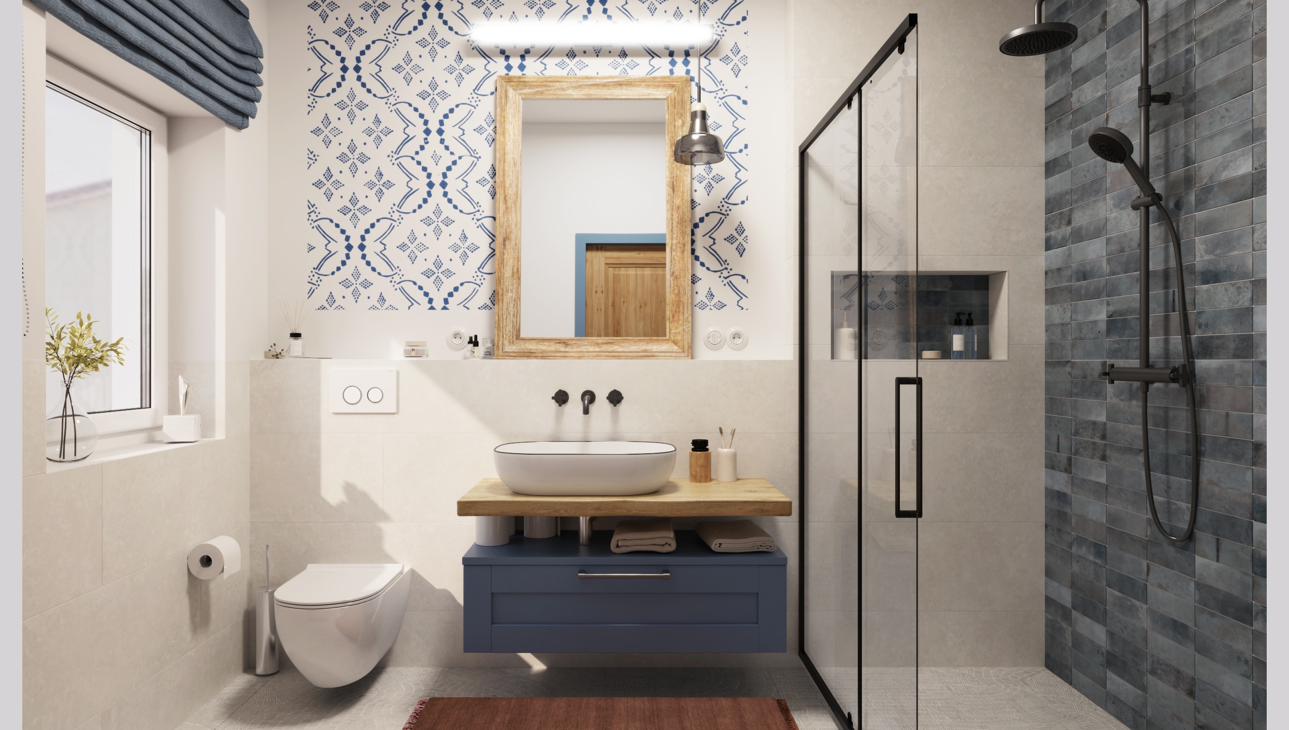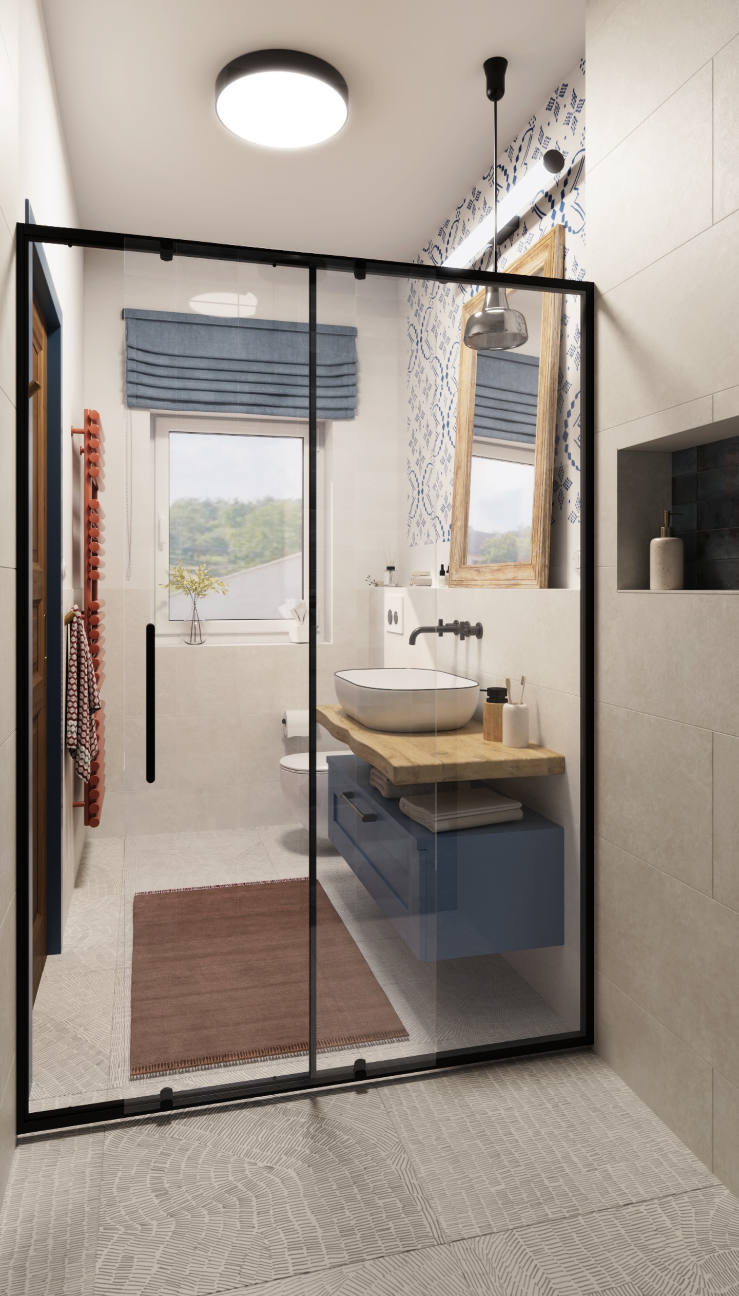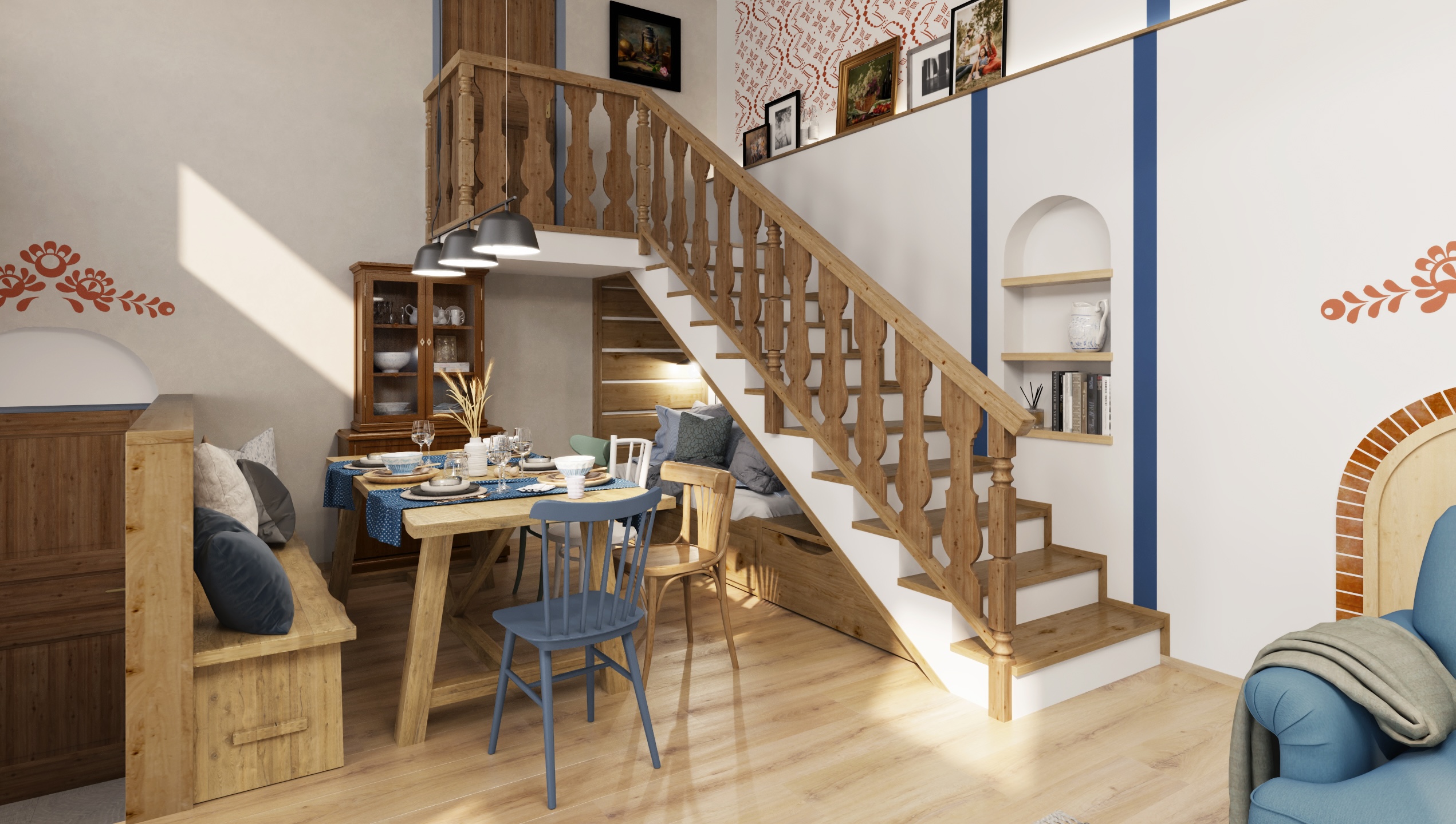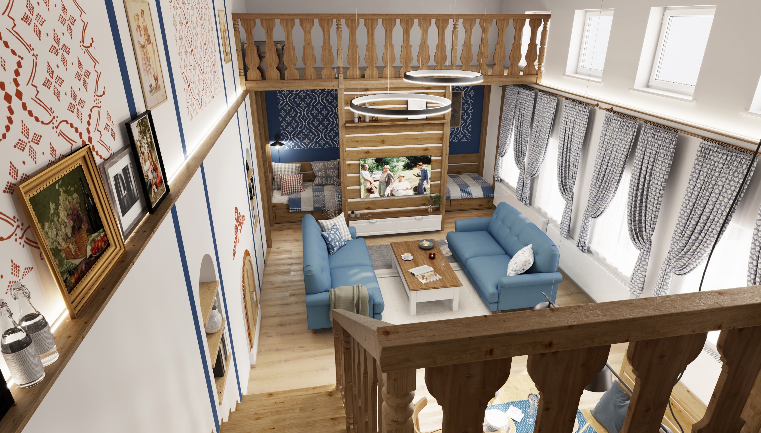 Interiér chalupy na Slovácku propojuje tradiční lidové motivy s moderní výbavou – dominuje zde modrobílá barevnost, dřevěné prvky a vzorované textilie inspirované kroji. Výrazné závěsy, malby na stěnách a rustikální detaily vytvářejí hřejivou atmosféru s důrazem na regionální identitu.
