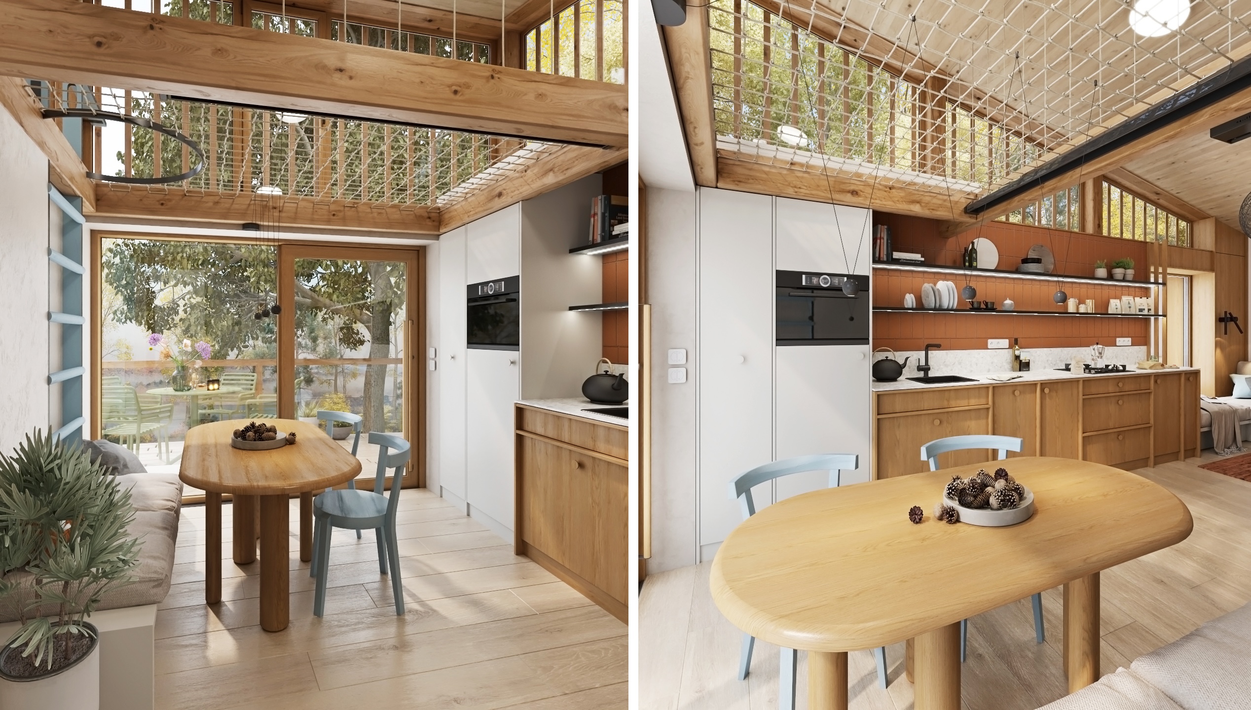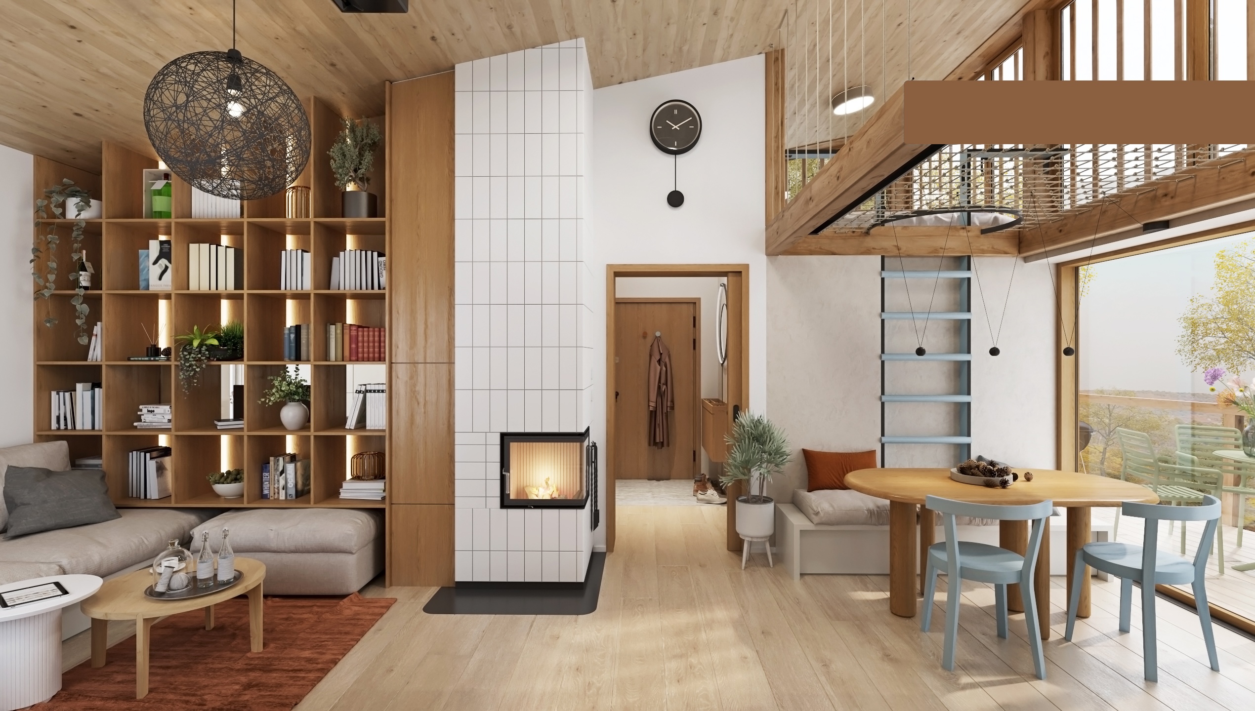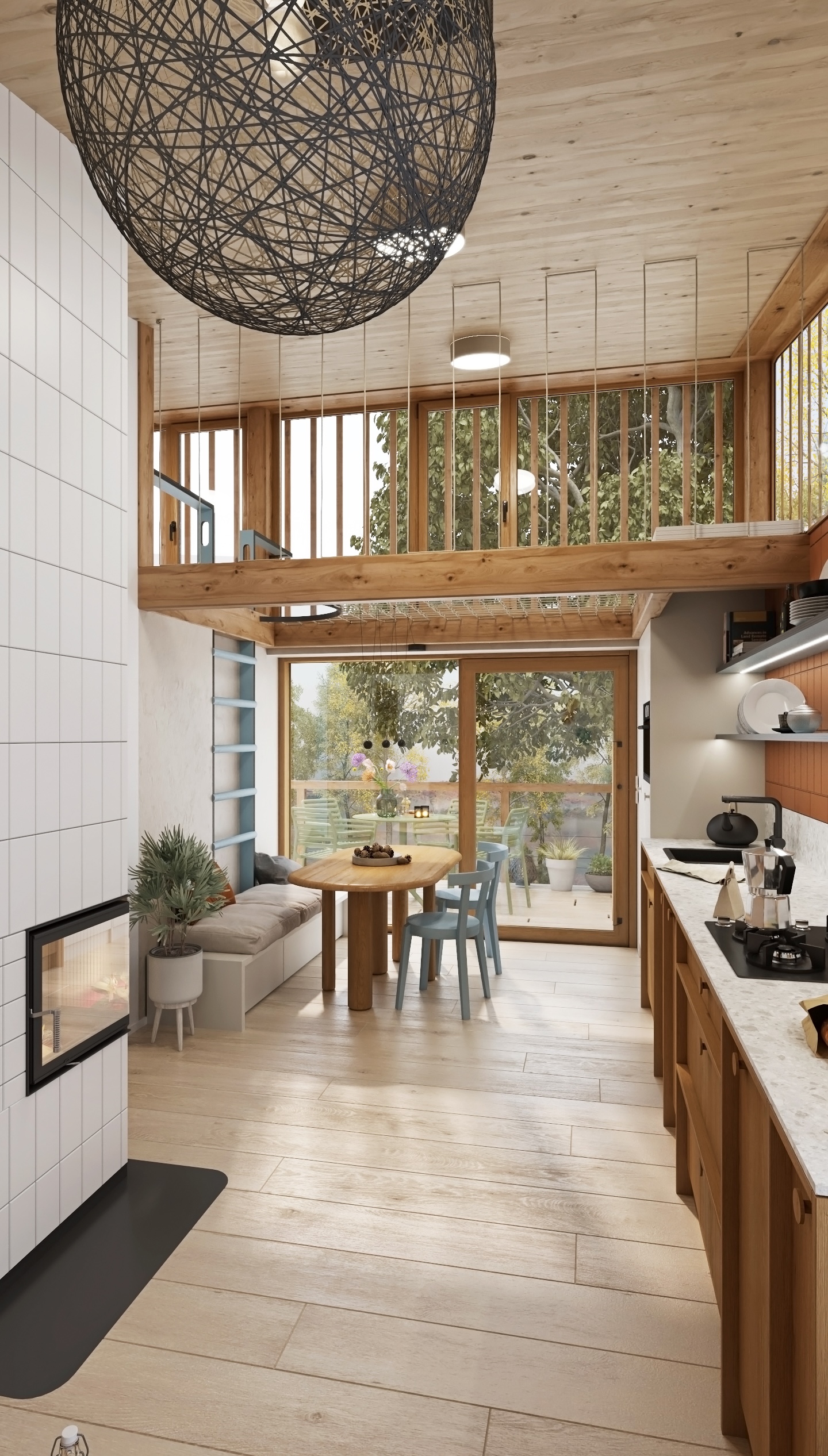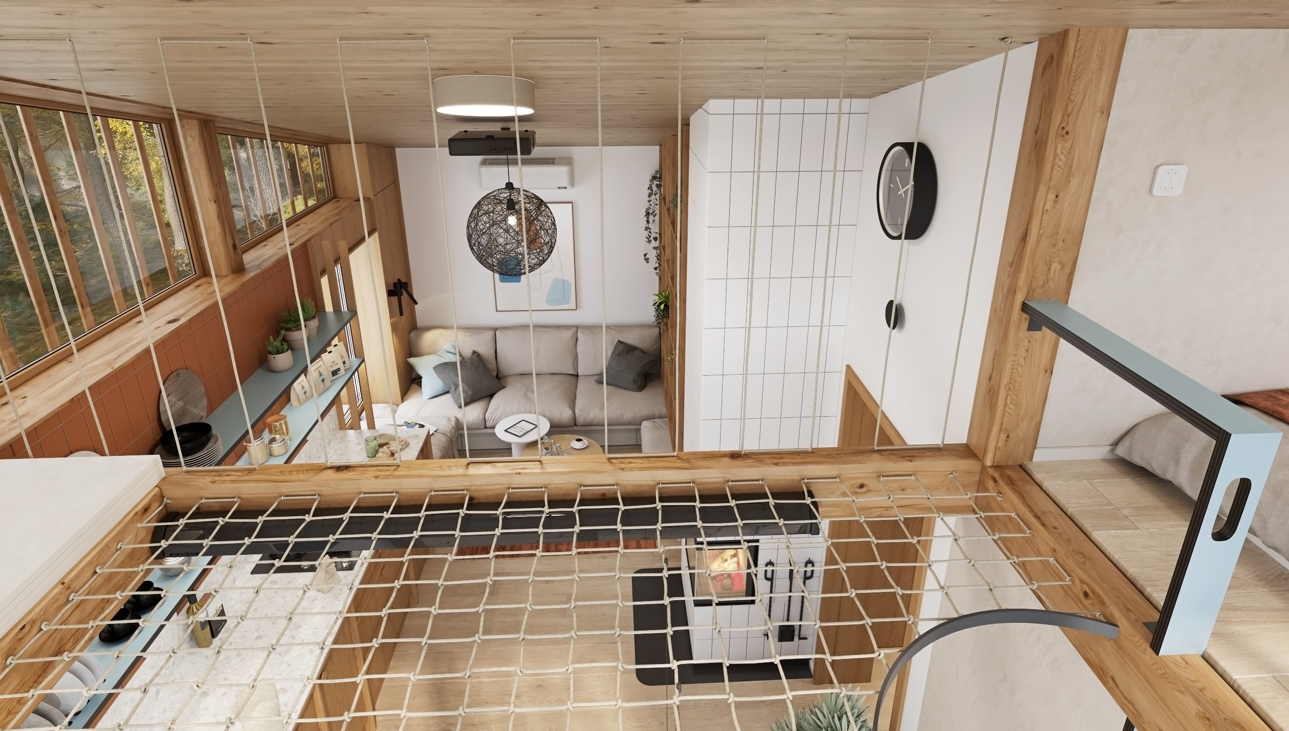 Dispozice je řešena s důrazem na plynulost a funkčnost. Otevřená kuchyňská linka přechází do obývací části s pohodlným gaučem, zatímco krb jemně odděluje jednotlivé zóny a stává se centrálním prvkem prostoru. Nad jídelním koutem se rozprostírá síť, která přináší nejen vizuální hravost, ale i další prostor k relaxaci.