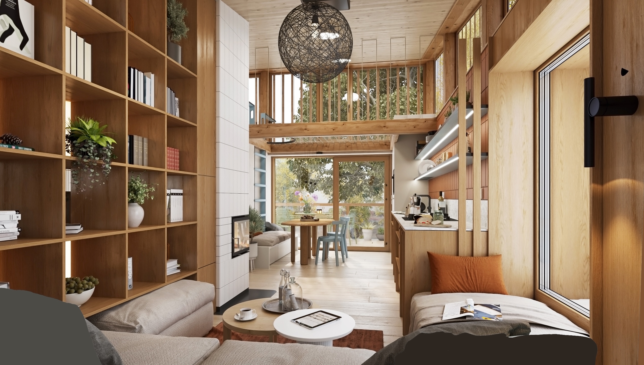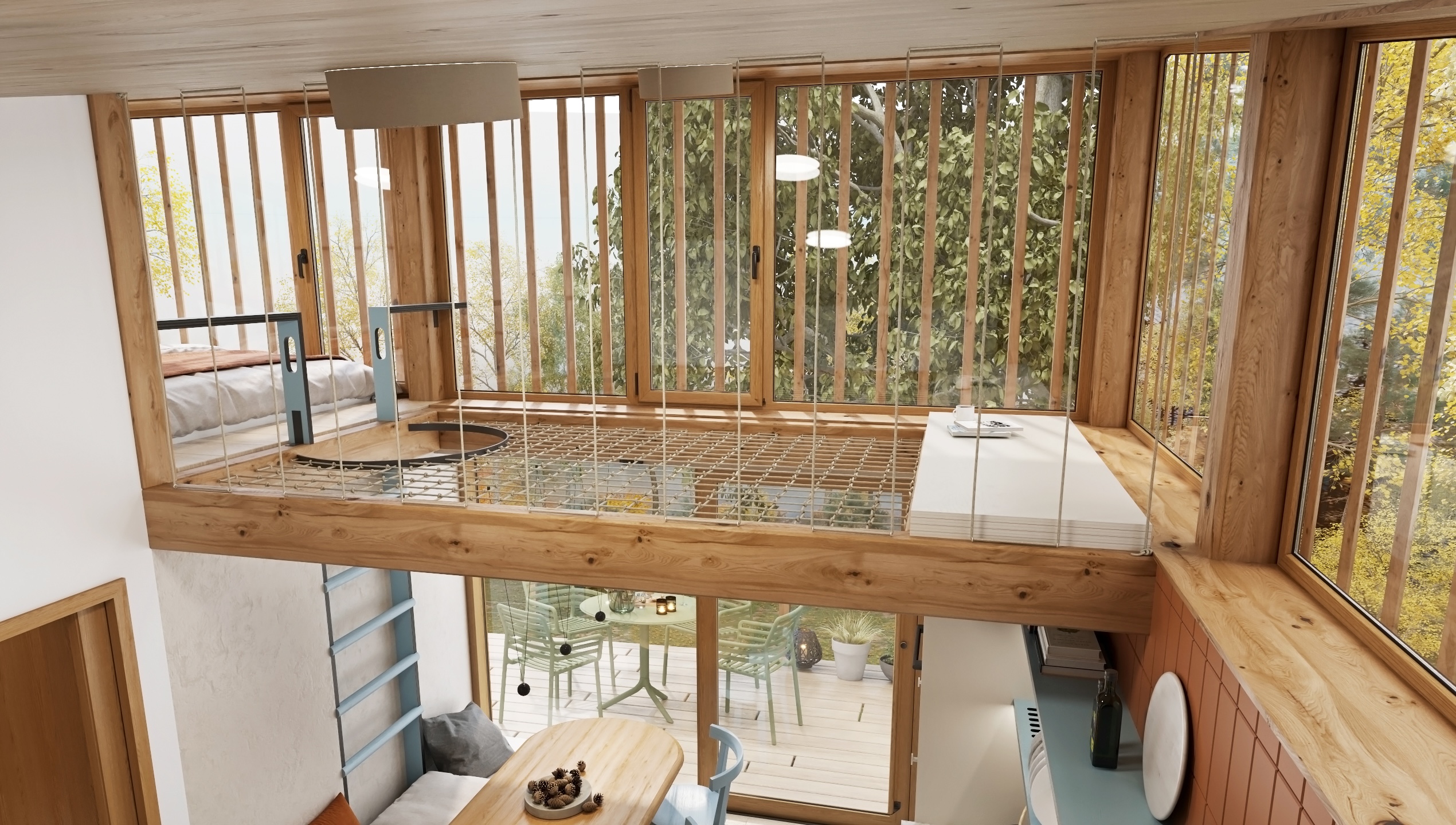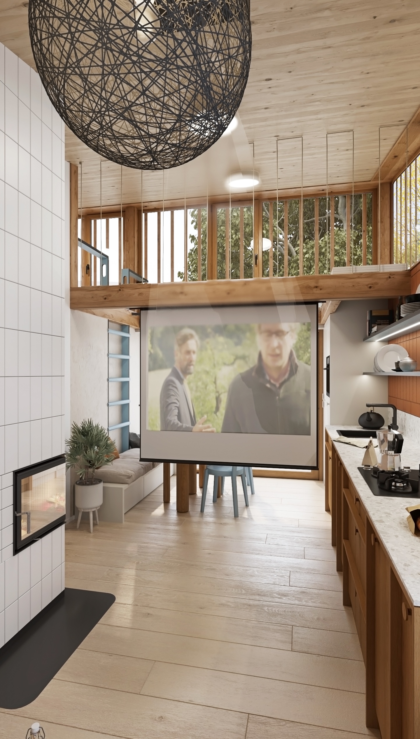 Dispozice je řešena s důrazem na plynulost a funkčnost. Otevřená kuchyňská linka přechází do obývací části s pohodlným gaučem, zatímco krb jemně odděluje jednotlivé zóny a stává se centrálním prvkem prostoru. Nad jídelním koutem se rozprostírá síť, která přináší nejen vizuální hravost, ale i další prostor k relaxaci.