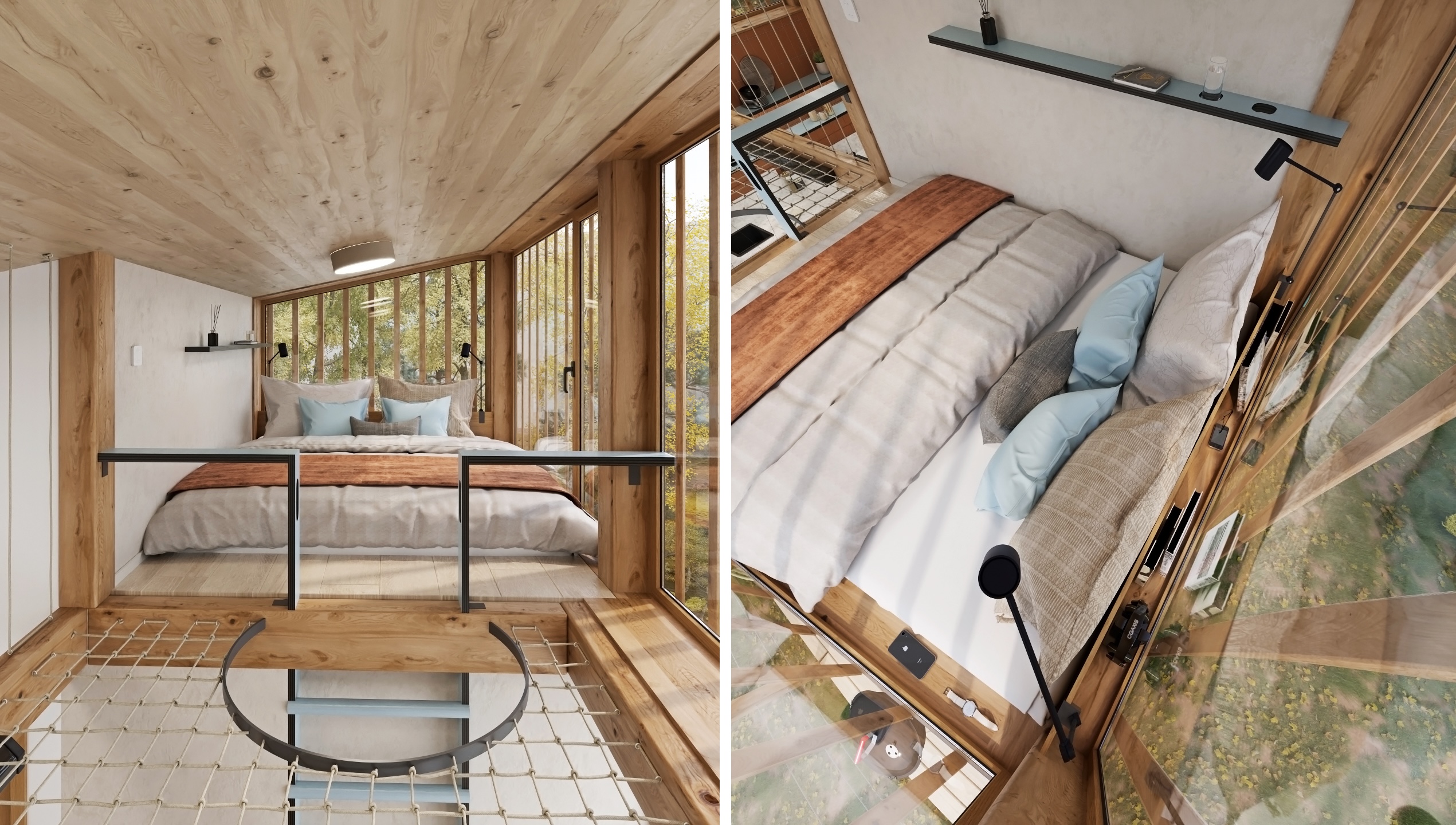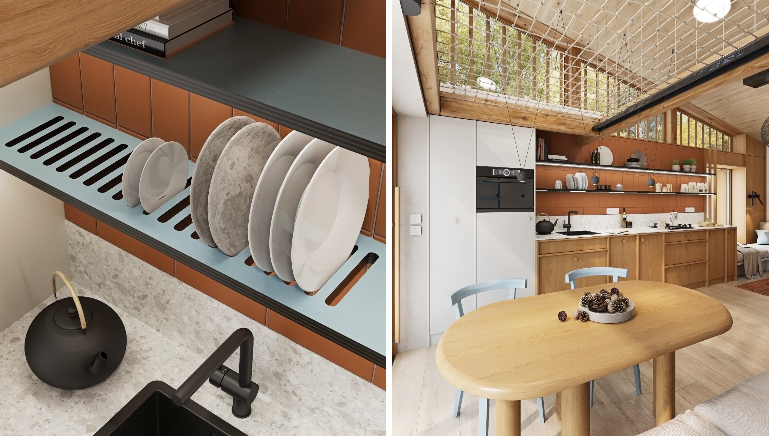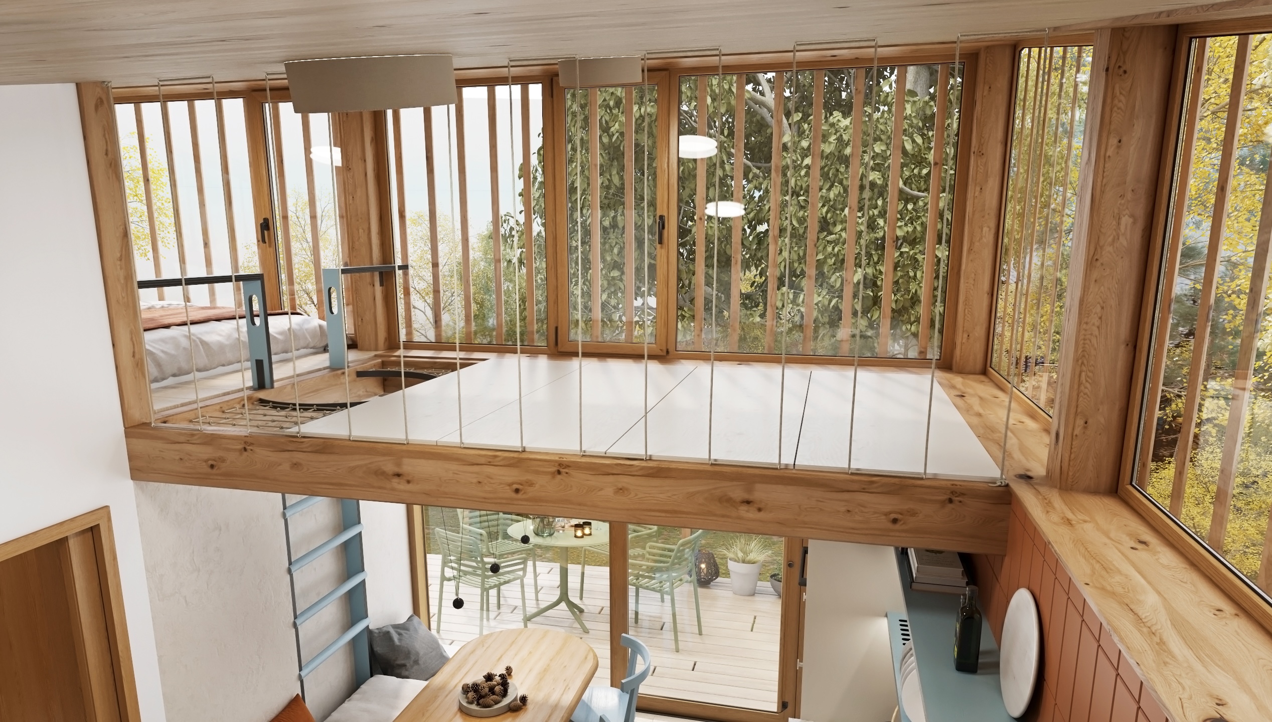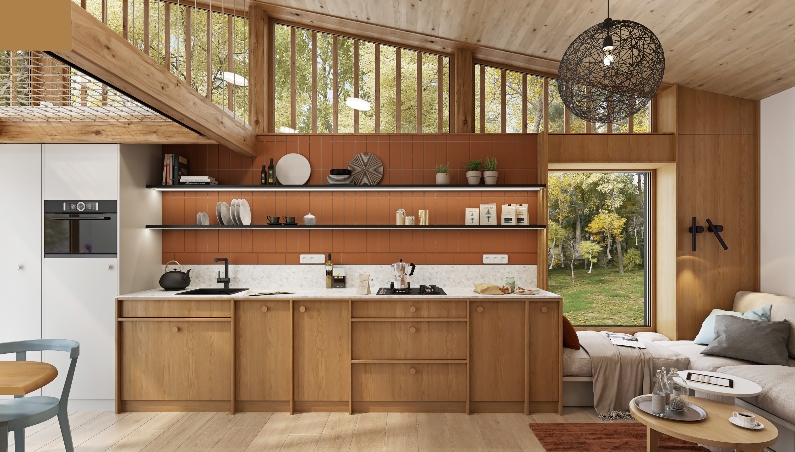 Dispozice je řešena s důrazem na plynulost a funkčnost. Otevřená kuchyňská linka přechází do obývací části s pohodlným gaučem, zatímco krb jemně odděluje jednotlivé zóny a stává se centrálním prvkem prostoru. Nad jídelním koutem se rozprostírá síť, která přináší nejen vizuální hravost, ale i další prostor k relaxaci.
