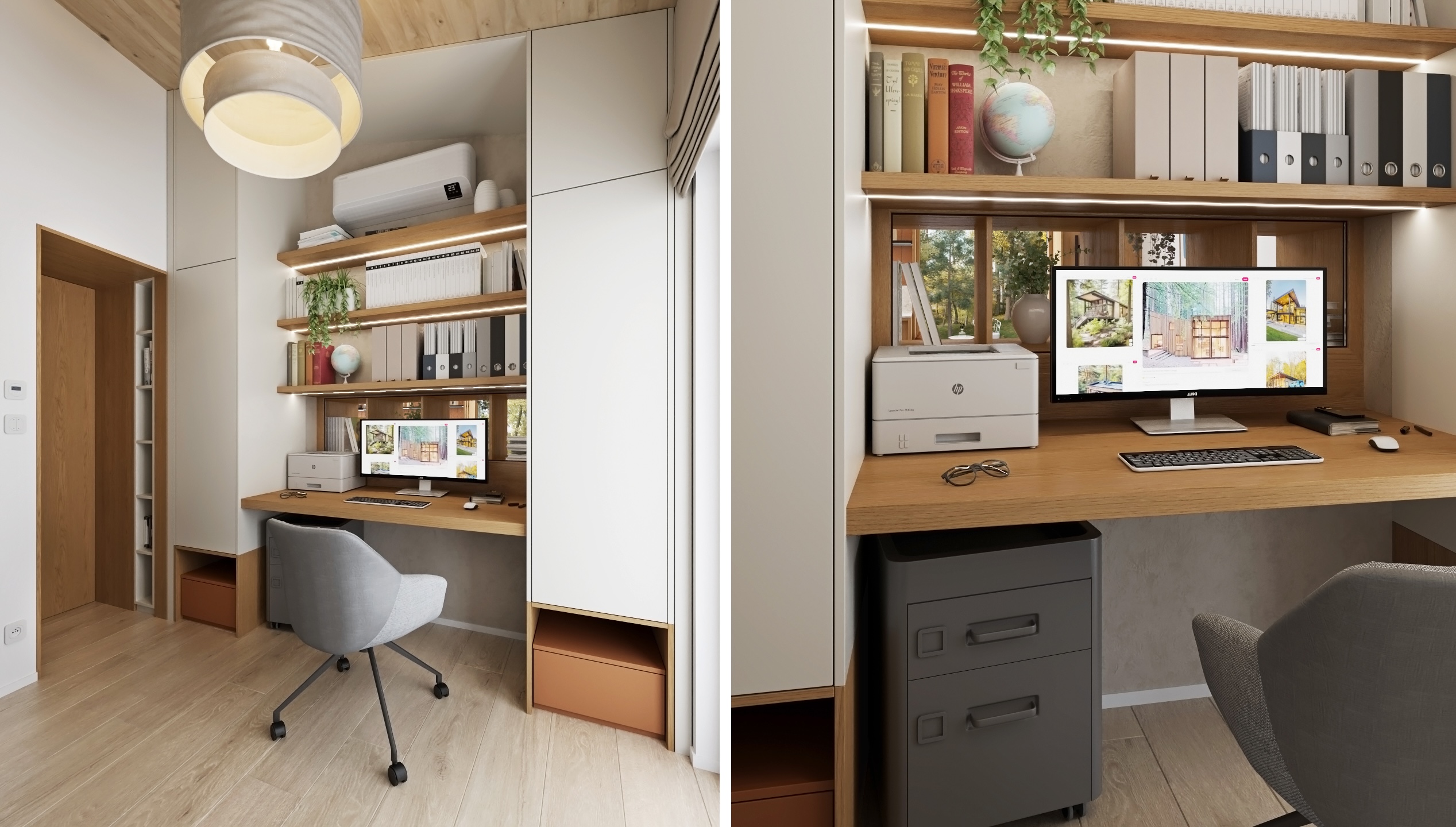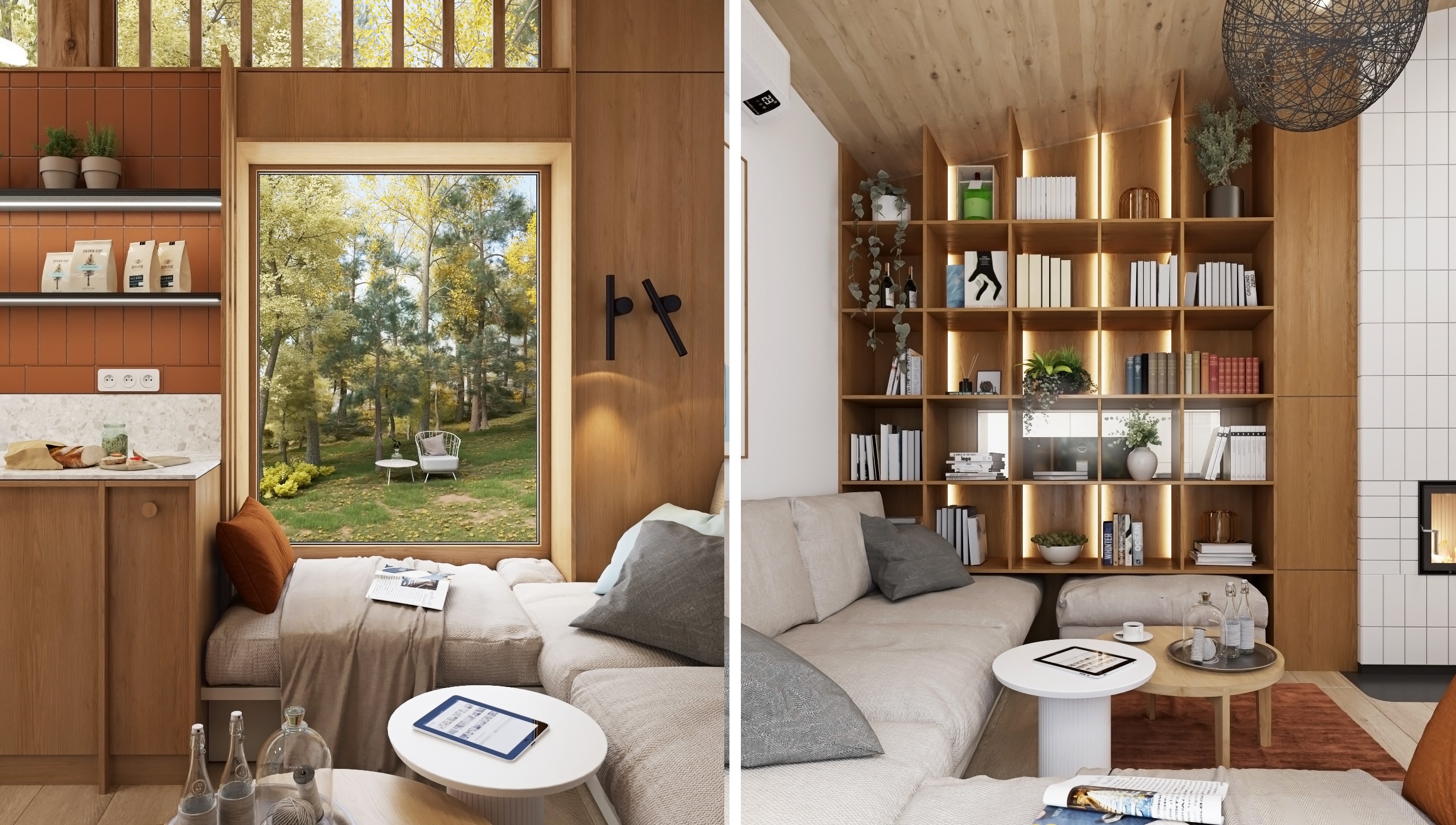 Celek dotvářejí jemné, ale výrazné detaily – otevřená knihovna plná knih a rostlin, grafické obrazy, decentní textilie v zemitých tónech a důmyslné osvětlení. Výsledkem je interiér, který působí útulně, domácky, a přitom moderně a vzdušně.