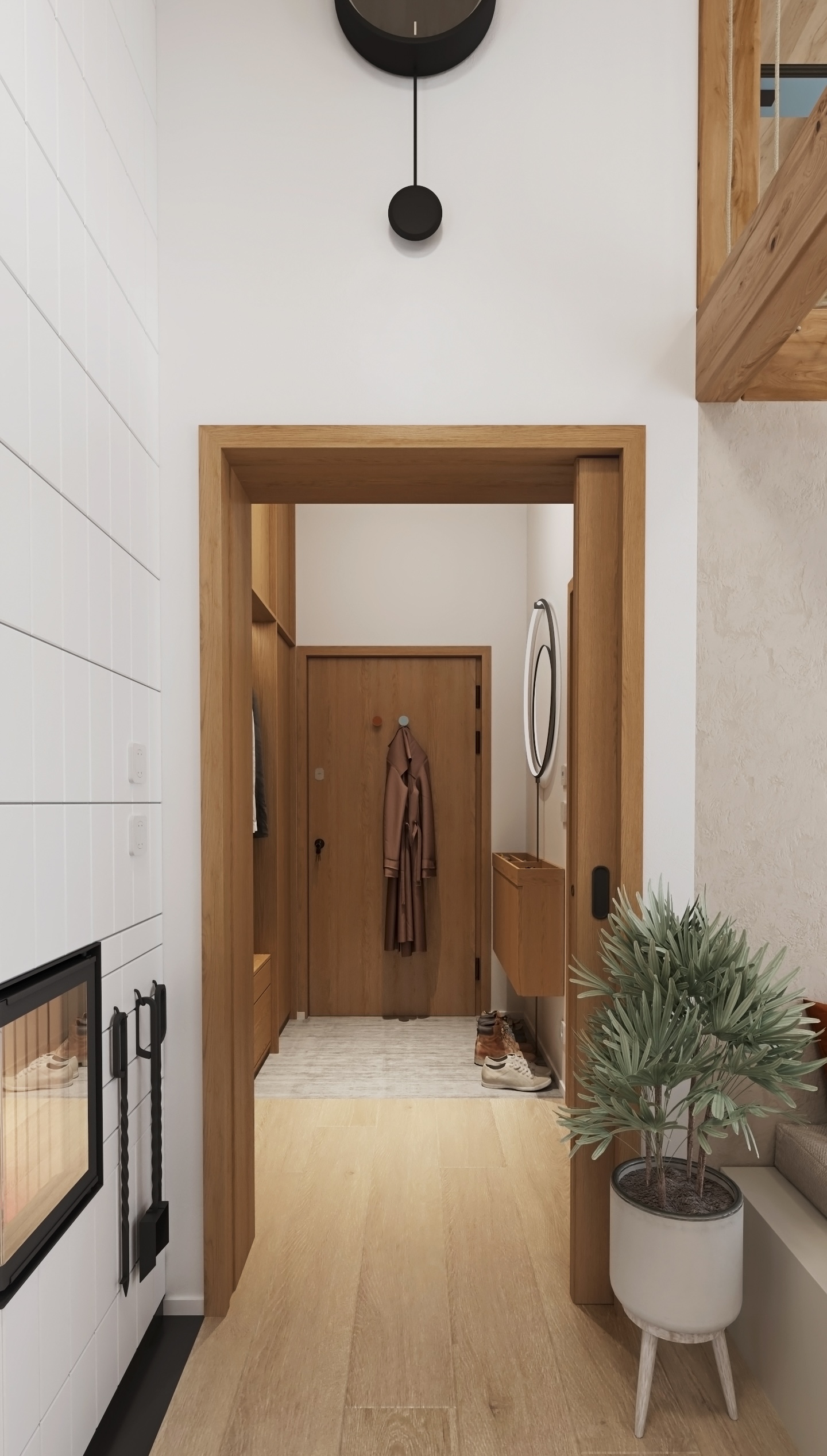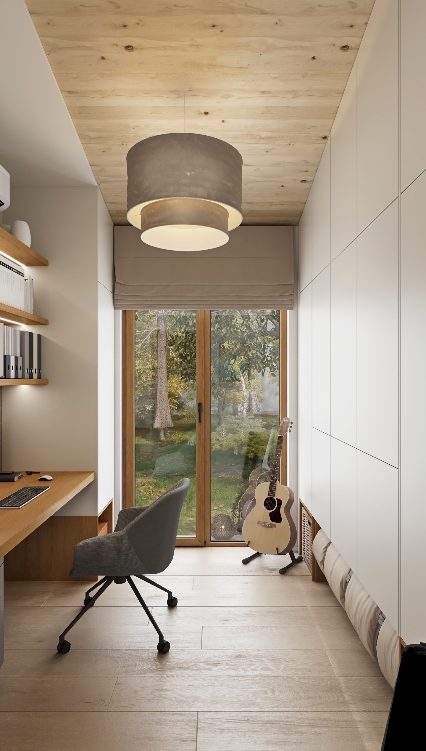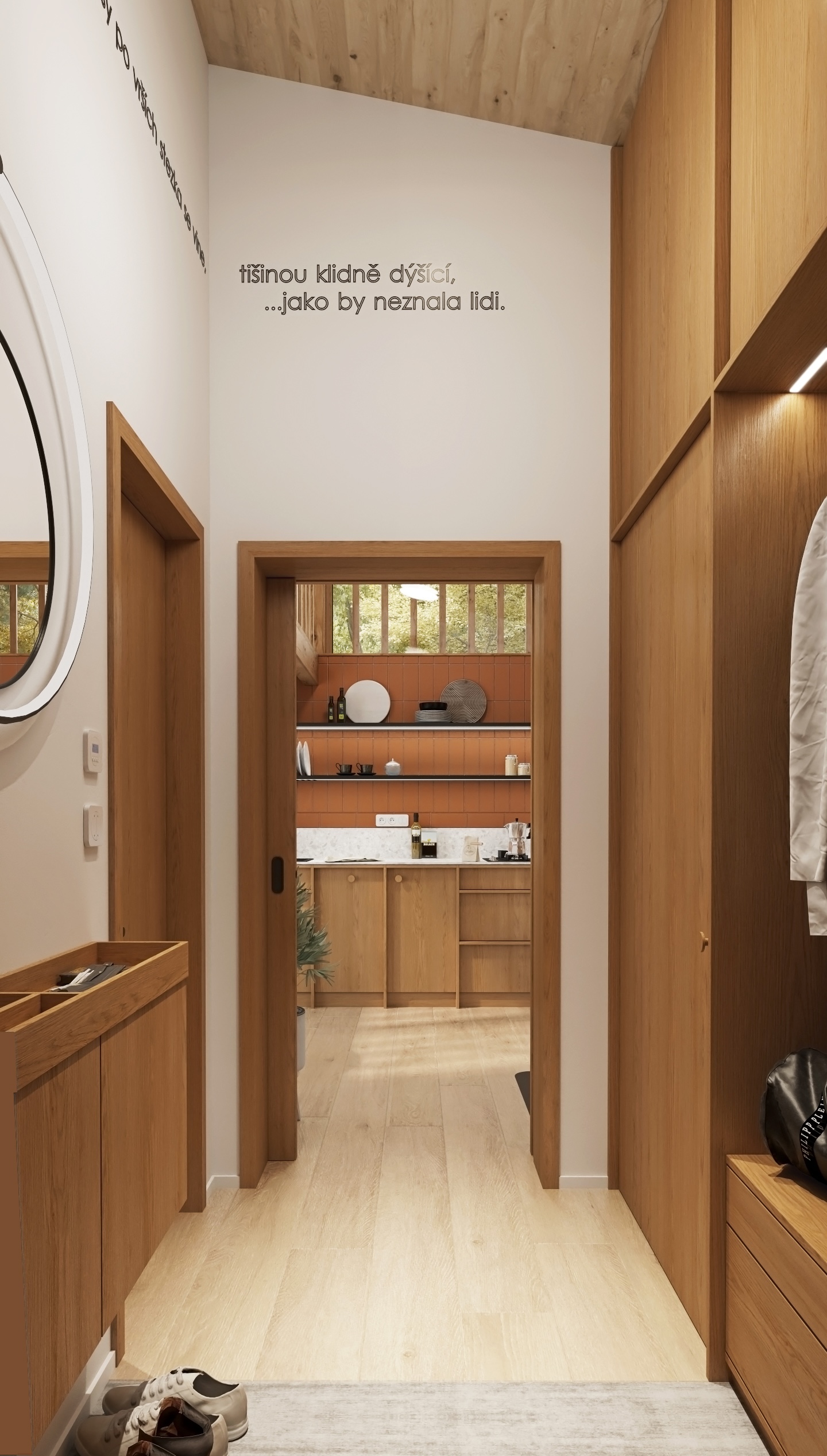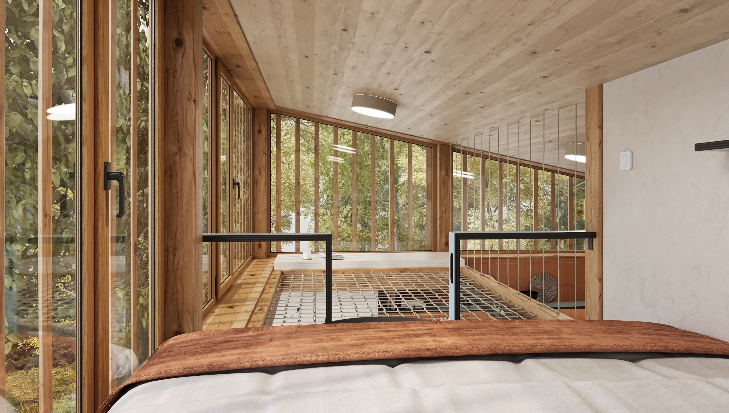 Díky velkým proskleným plochám proudí dovnitř dostatek denního světla a otevírají se z ní výhledy do zeleně, které působí uklidňujícím dojmem. Dominantním materiálem je světlé dřevo, které prostupuje celým prostorem – od podlahy až po strop – a dodává interiéru přirozenou hřejivost a vizuální čistotu.