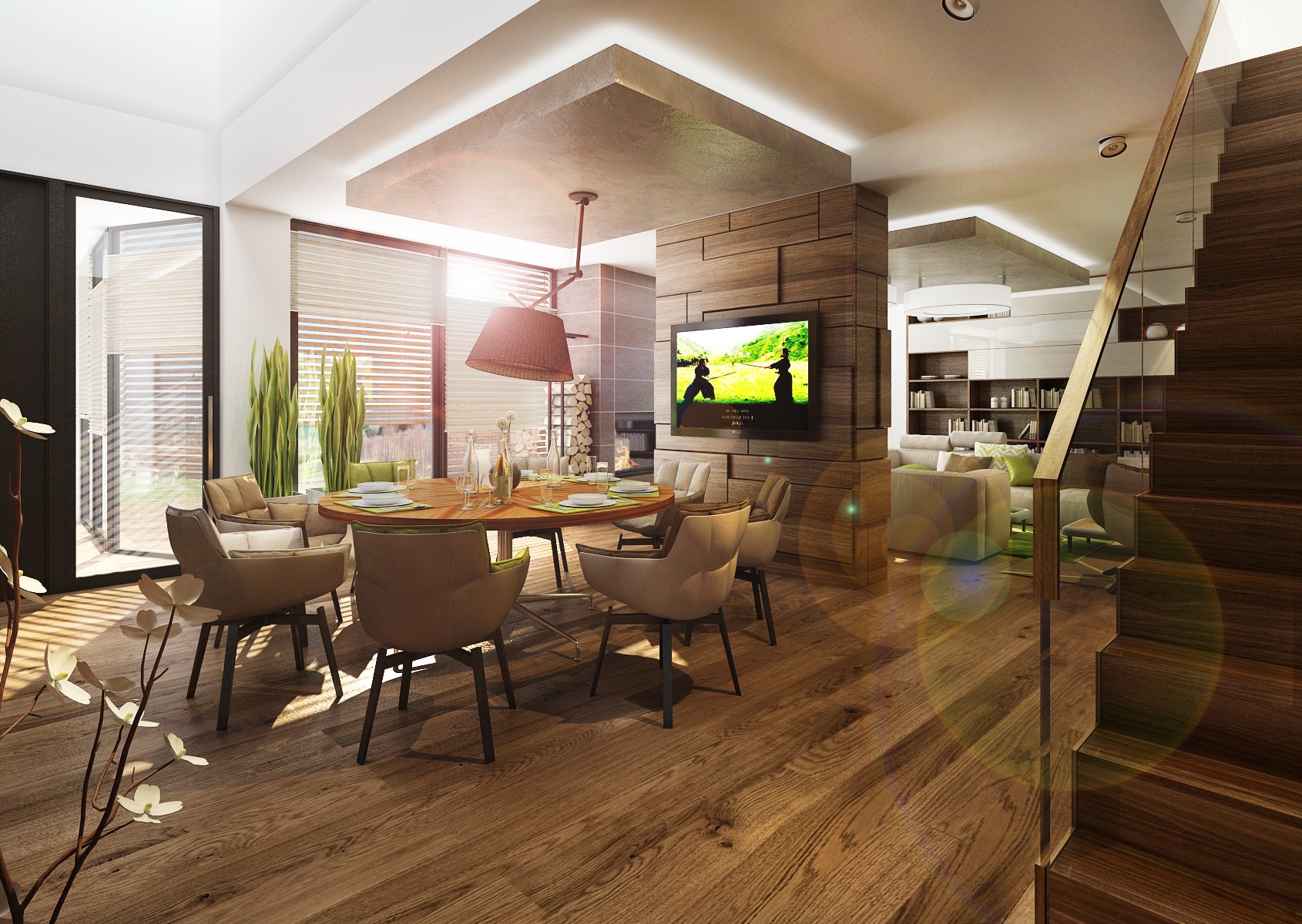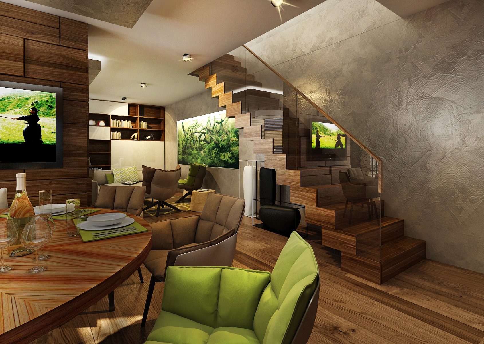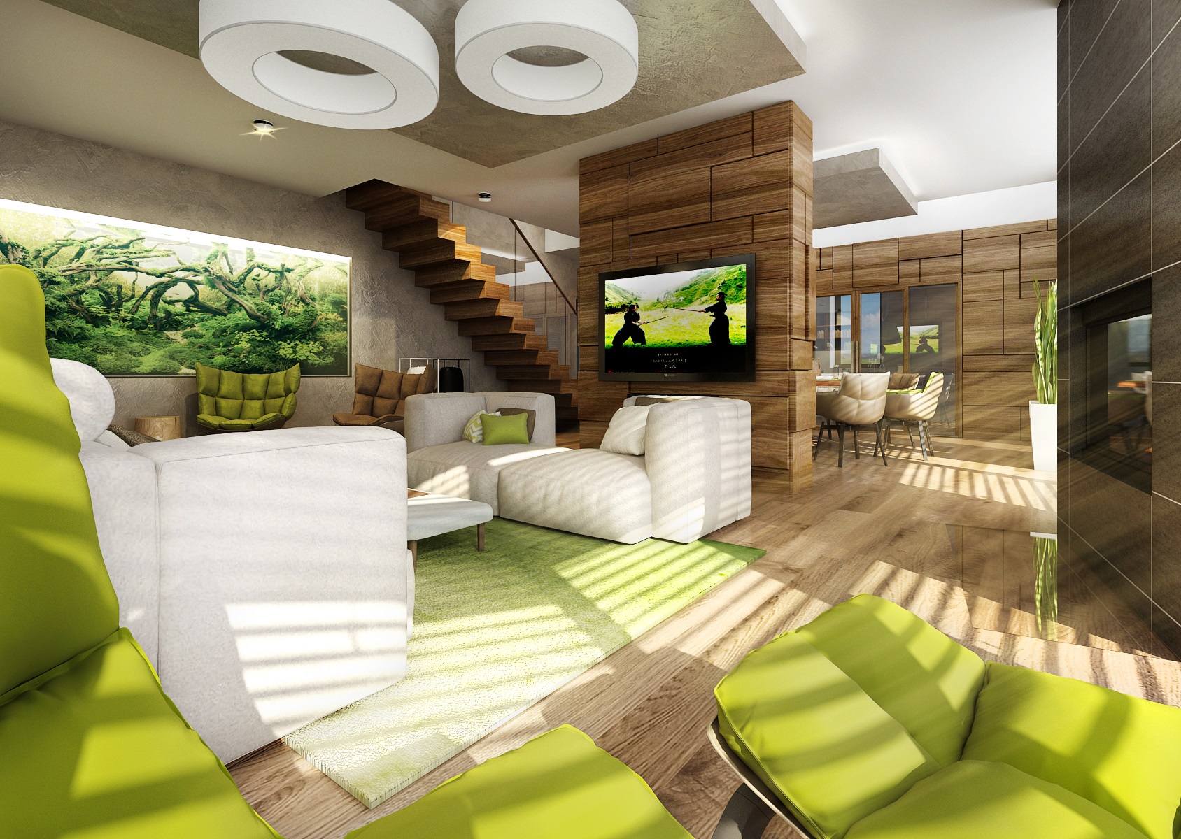 Po delší době tu máme opět na scéně dřevodekor ořechu a zelenou barvu jako doplňkovou na textilu, čalounění atd. Vilou prochází dýha ořechu jak na nábytku i obkladech. Ústřední bod obývacího prostoru je obří akvárium a knihovna.