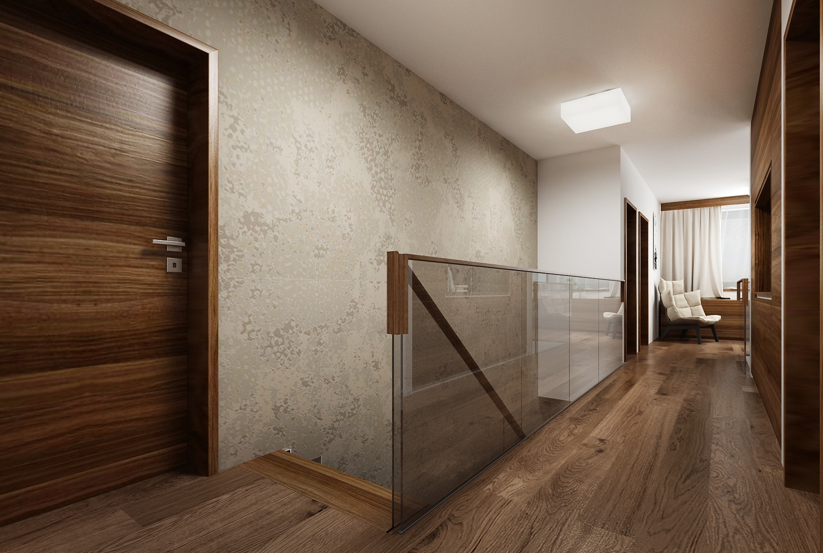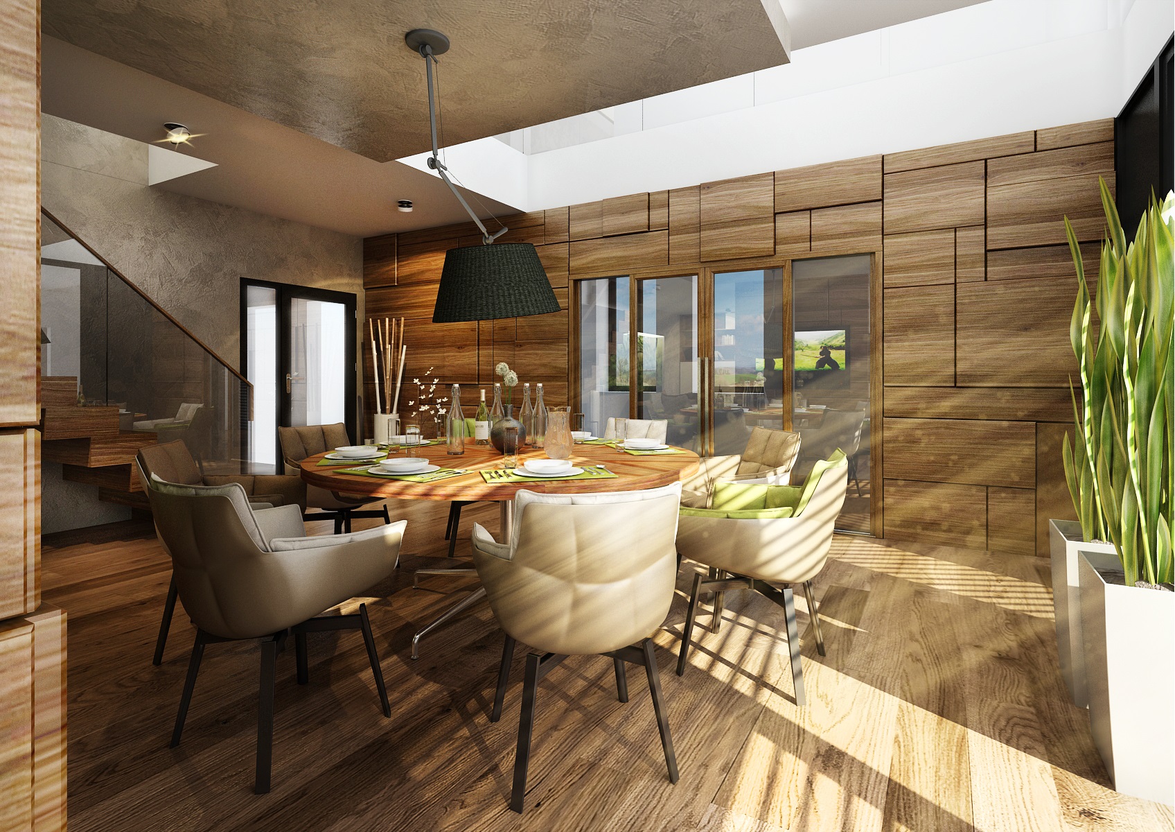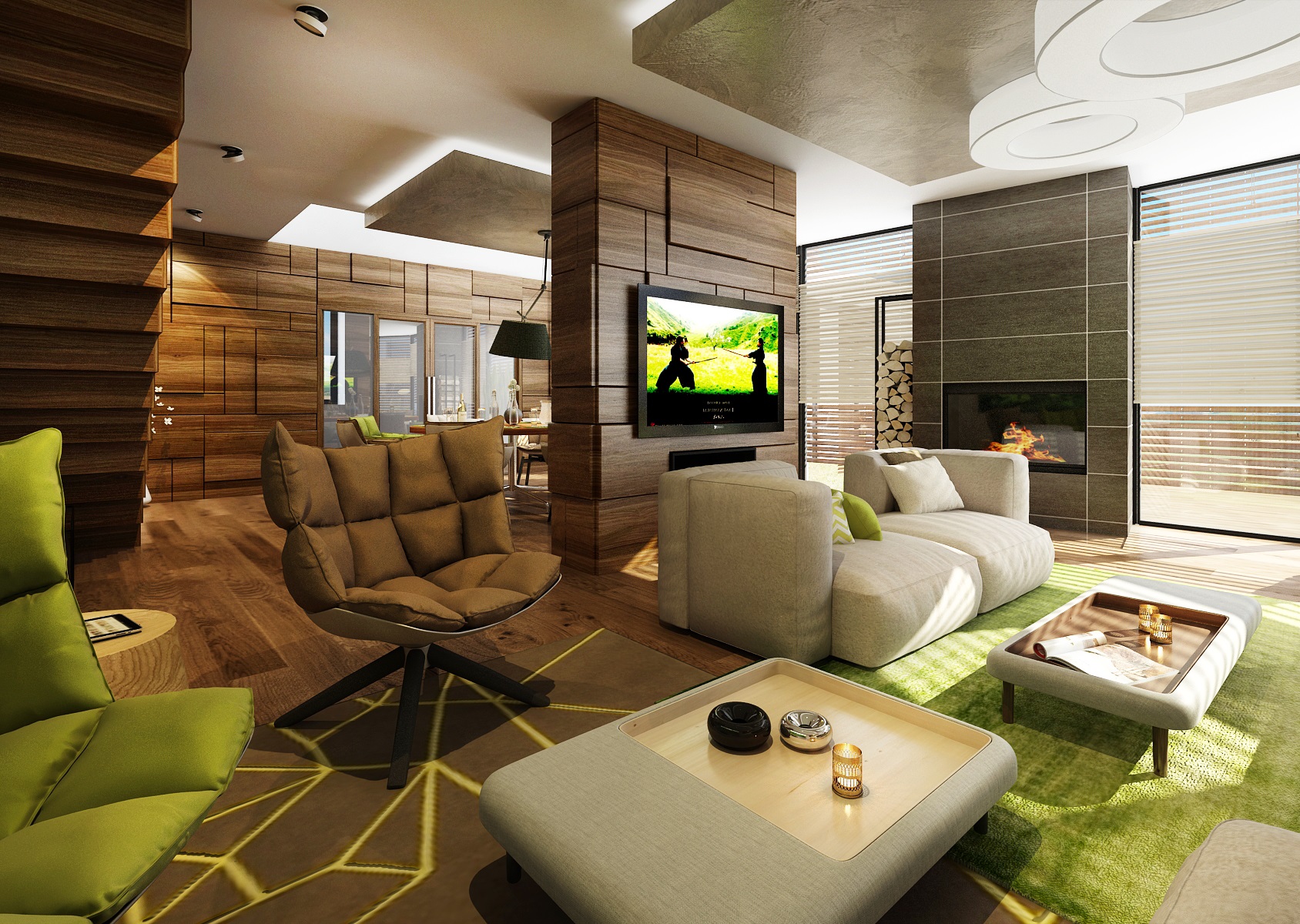 Po delší době tu máme opět na scéně dřevodekor ořechu a zelenou barvu jako doplňkovou na textilu, čalounění atd. Vilou prochází dýha ořechu jak na nábytku i obkladech. Ústřední bod obývacího prostoru je obří akvárium a knihovna.