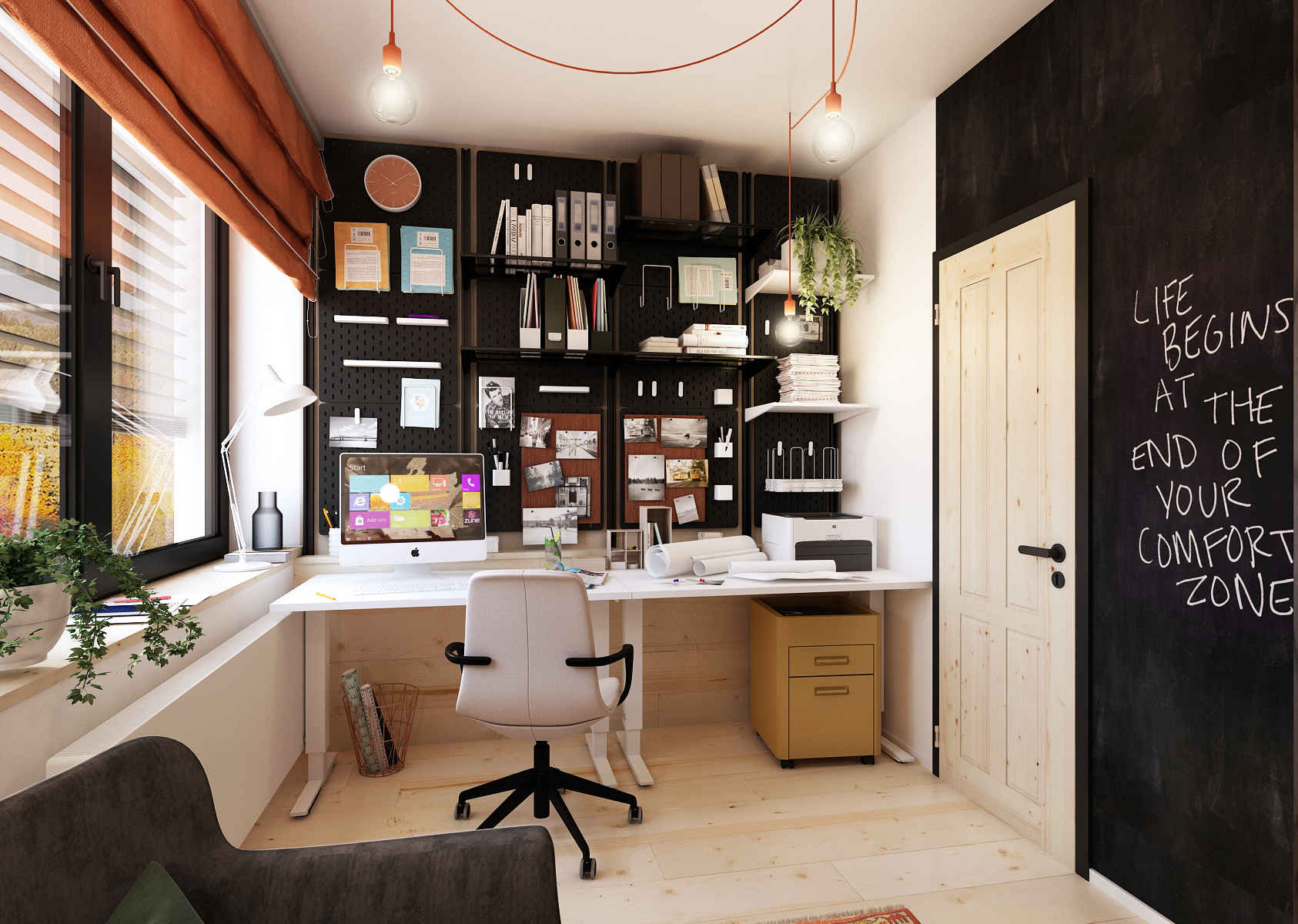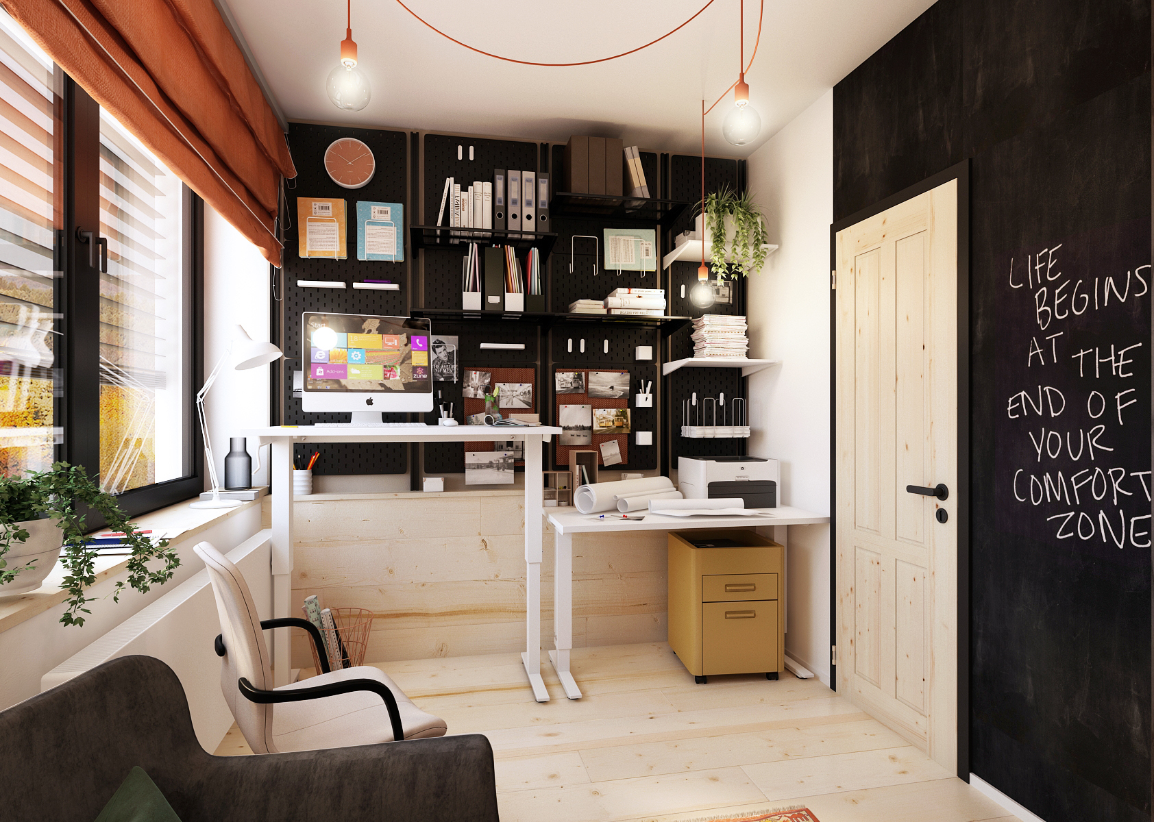 Kancelář je vybavena rektifikačními stoly, lze je tedy výškově přizpůsobit dle potřeby. Borové dřevo tvoří zároveň i odkládací prostor za stoly, na který navazují černé perforační panely s různými závěsnými doplňky – police, stojánky na tužky, stojánky na sešity nebo různé připínací klipy.