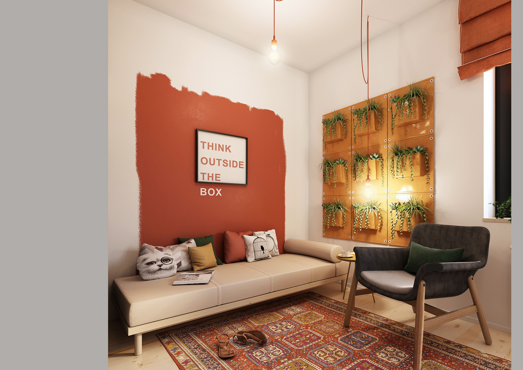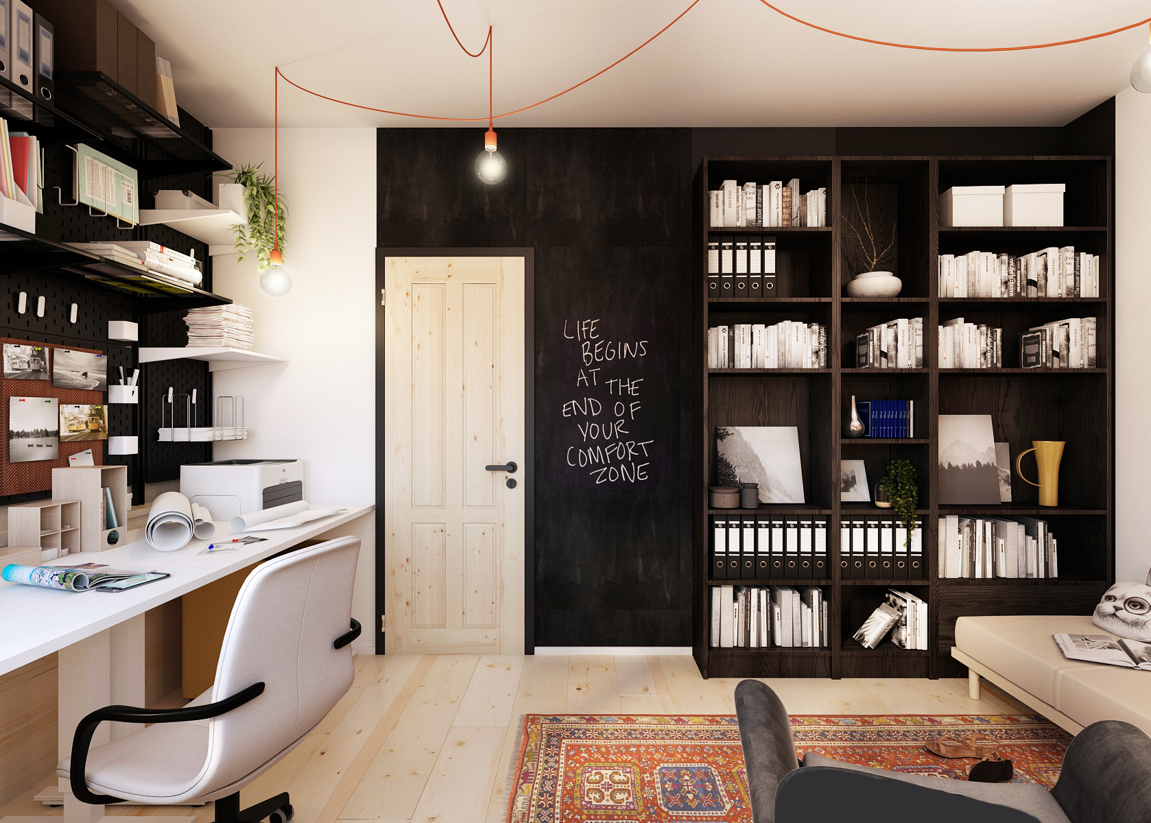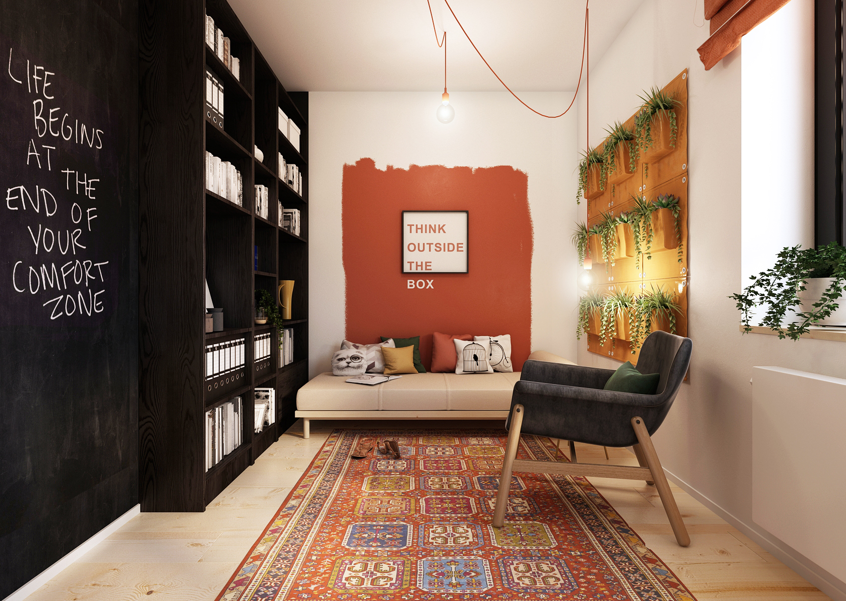 Černá malba na stěně se táhne do odpočinkové části pracovny s knihovnou, kde nechybí jak pohovka, tak ani křesílko. Panely se závěsnými truhlíky na stěně dodávají prostoru živost. Prostor je doplněn o klasický perský koberec na podlaze.