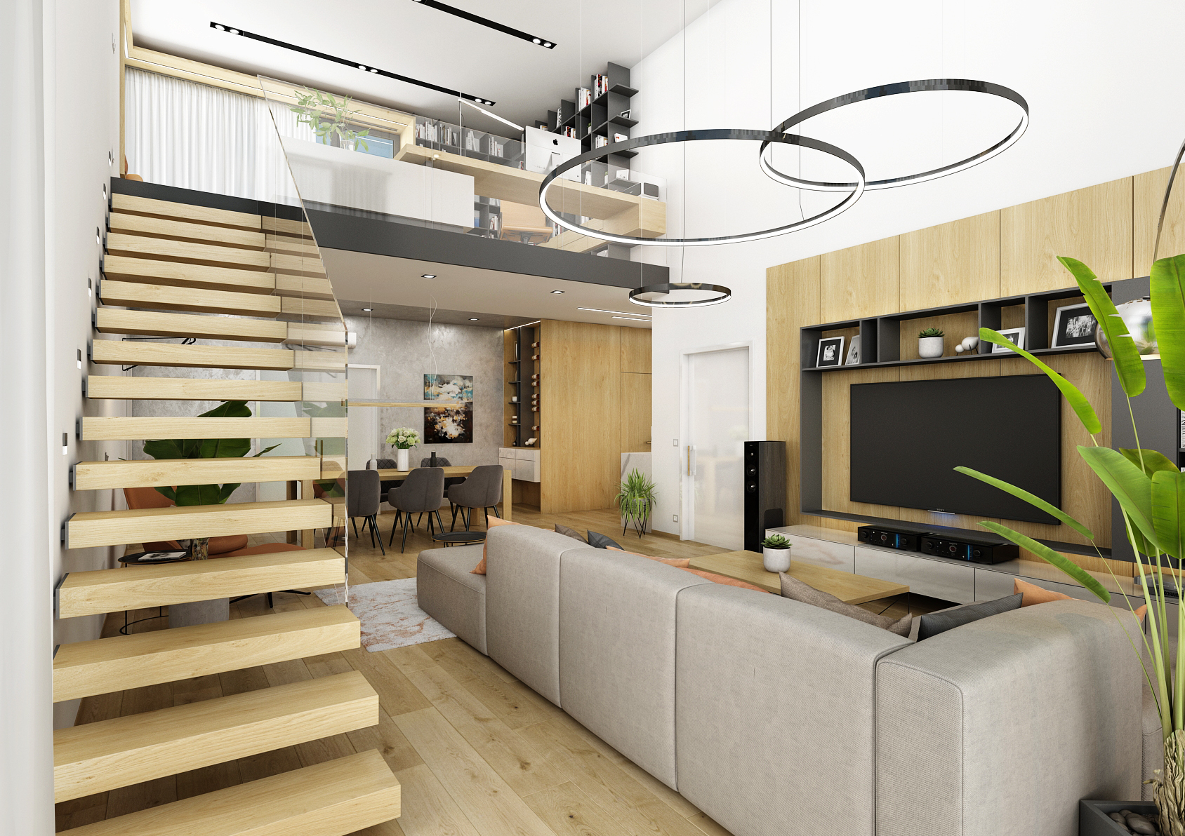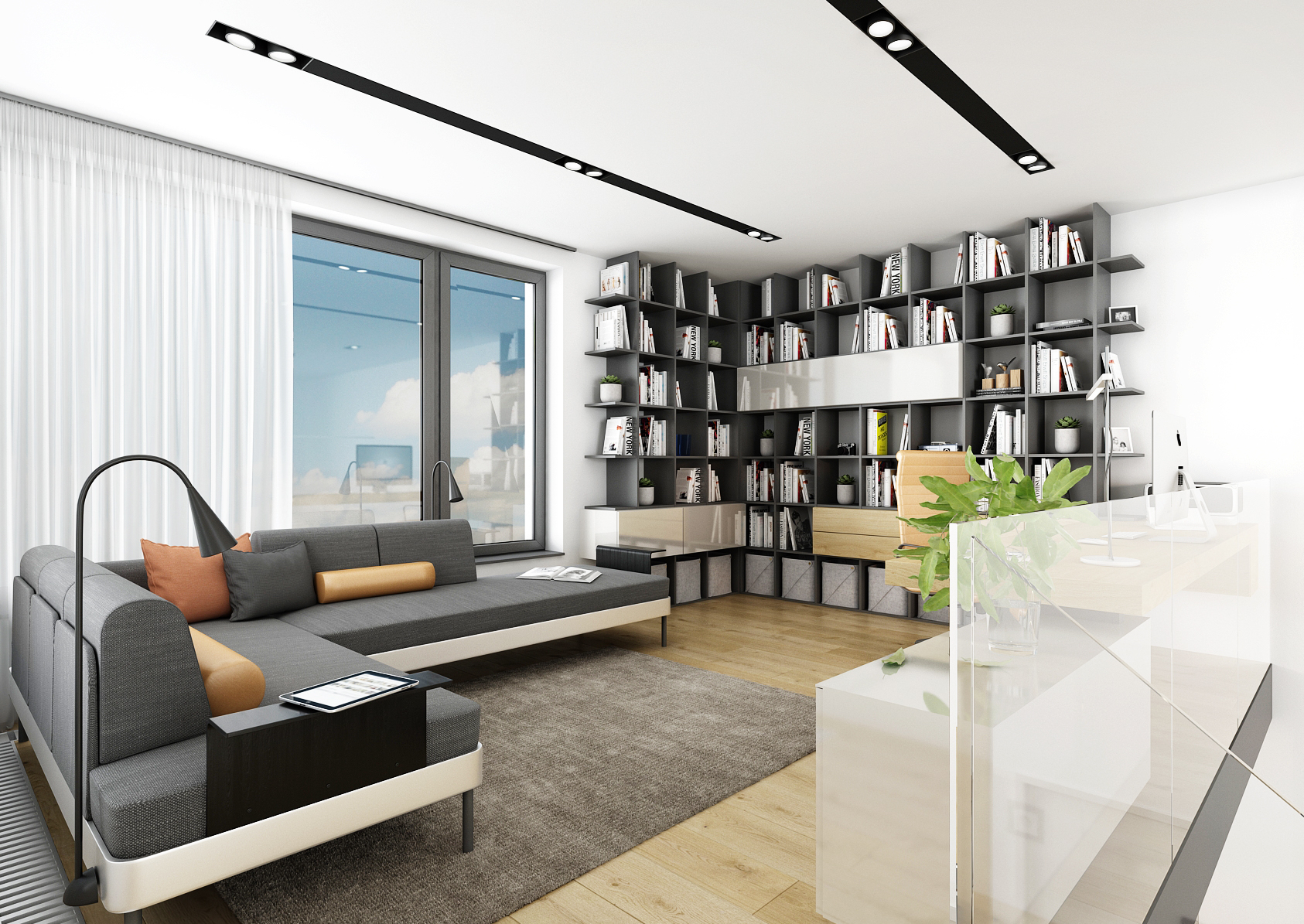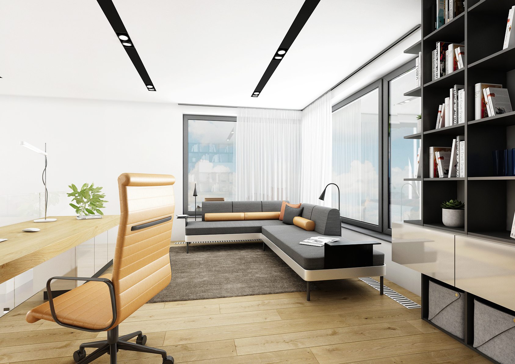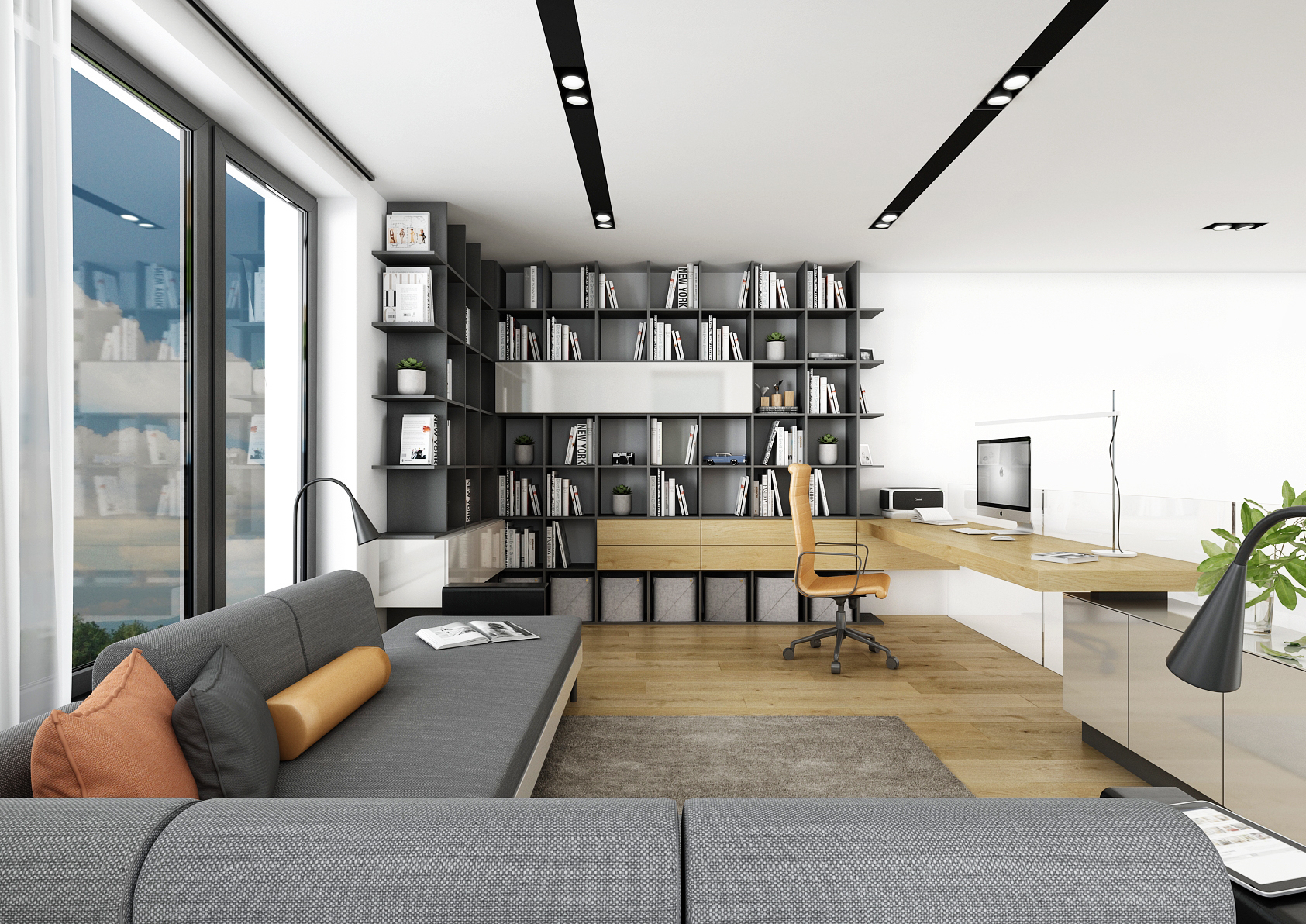 Domácí pracovny nemusí být pouze zavřené v místnosti, tuto konkrétní pracovnu jsme umístili do mezonetového patra, které není obehnáno zdmi.