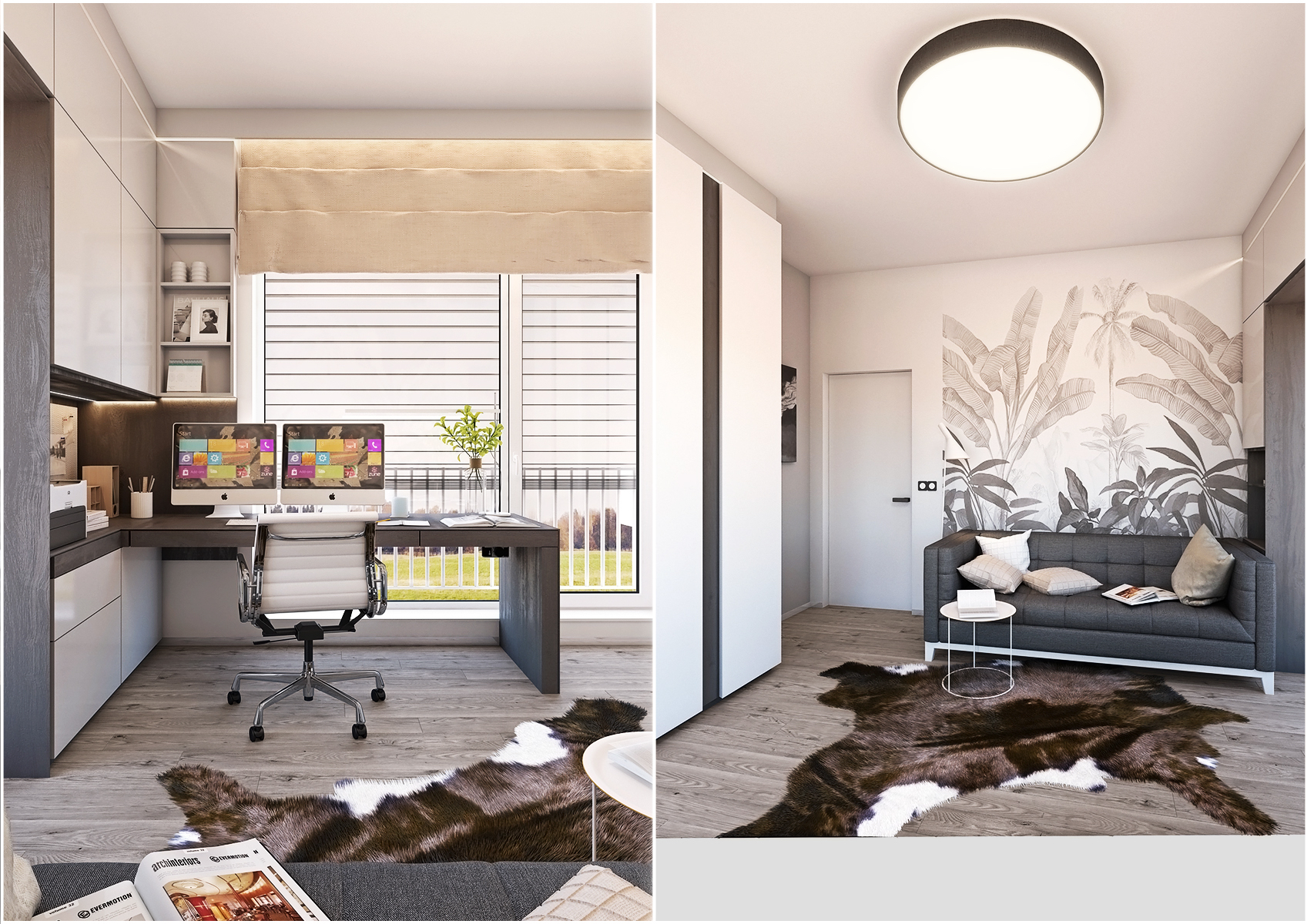 Prostorný pracovní stůl je umístěn takticky u okna, které poskytuje k práci dostatek denního světla. Pracovní plocha je součástí skříňového systému, který obsahuje i odkládací část ve výši pracovní desky na tiskárnu, lze místo také využít jako nástěnku.