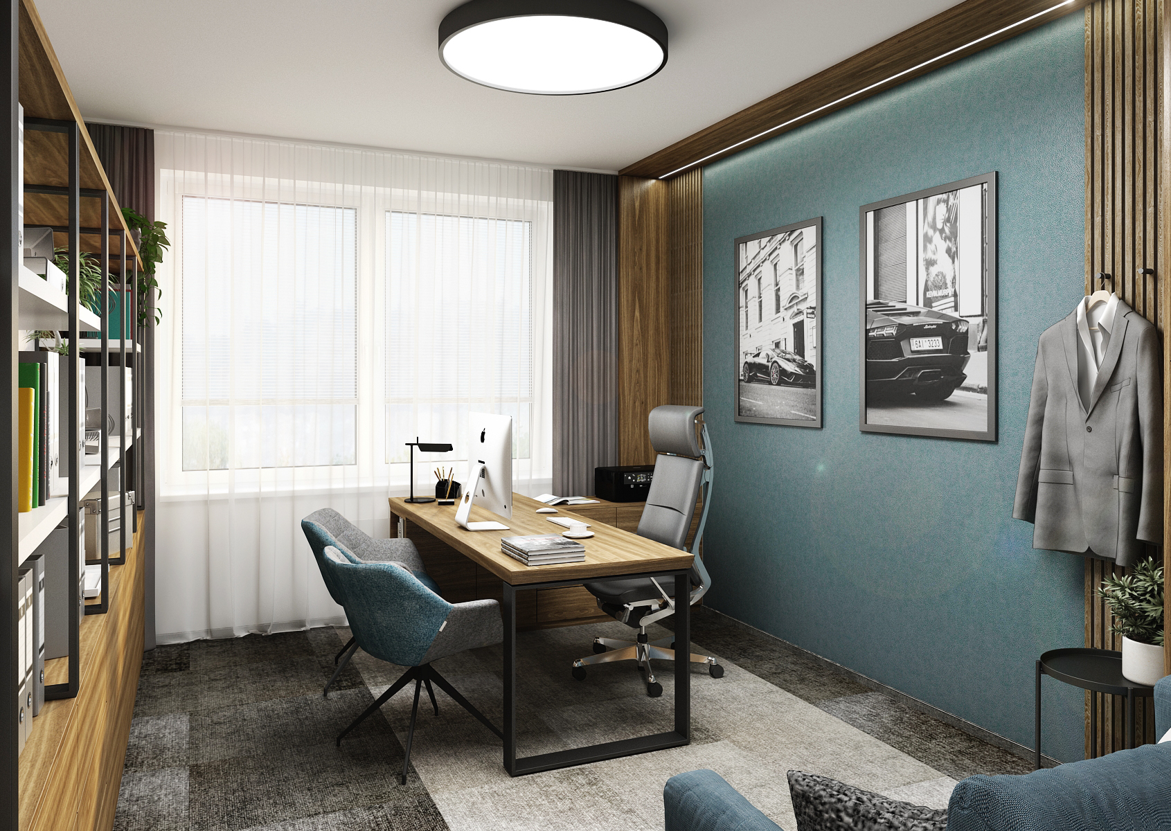 V žádné pracovně nesmí chybět pracovní stůl, ten je i se dvěma křesílky pro klienty umístěn u petrolejové stěny s podsvíceným panelem dávající tak důraz samotné barvě a dekoracím na zdi. Se zvolenou tmavou barvou kontrastuje světlá část koberce, na které je umístěna i pohovka u vestavěné skříně a háčků na oděvy.