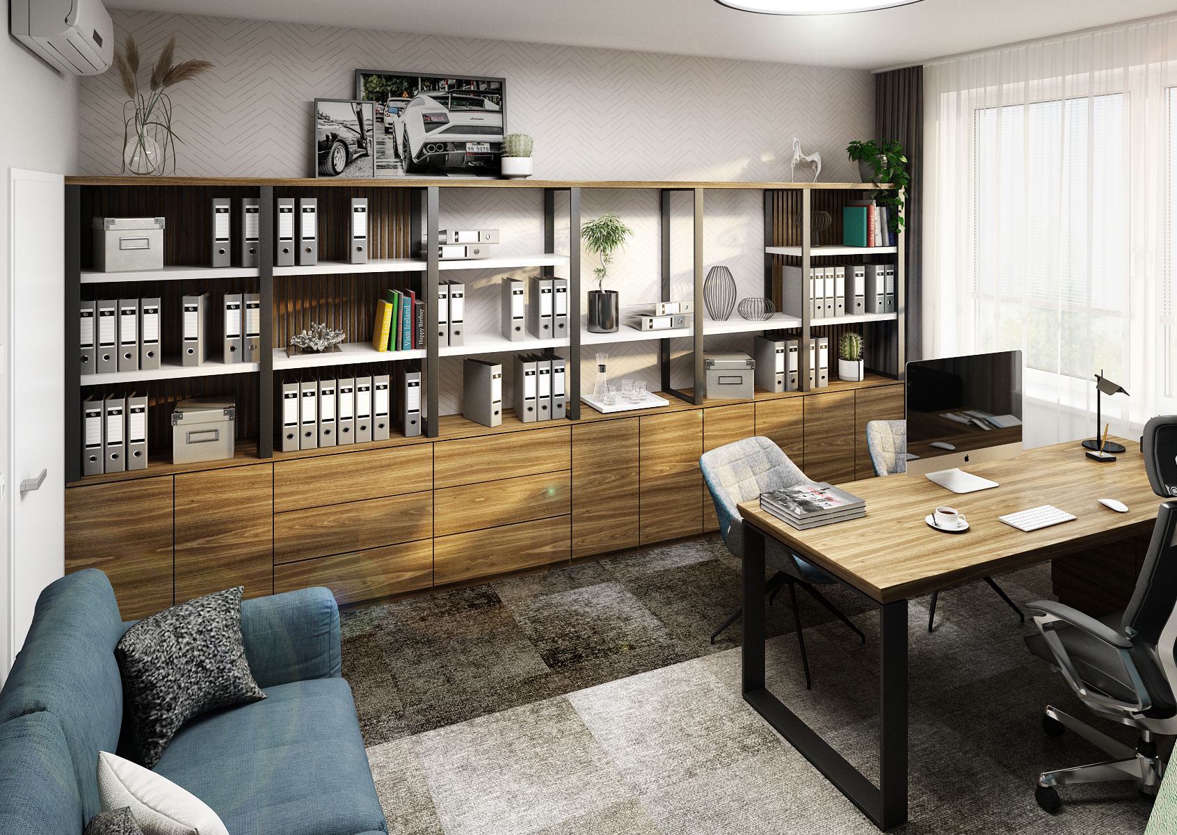 Útulná pracovna obdélníková pracovna je navržena v příjemném nádechu petrolejové barvy, kterou zpestřuje výrazný dřevodekor.
