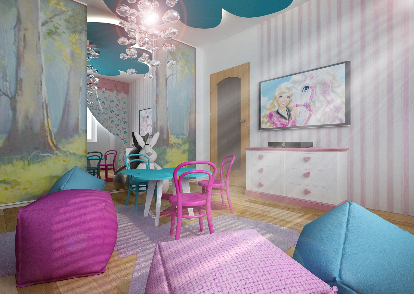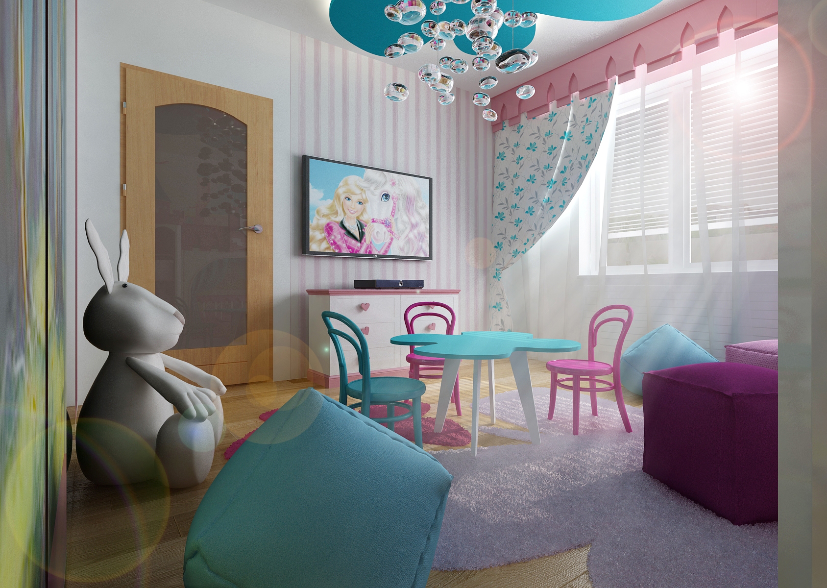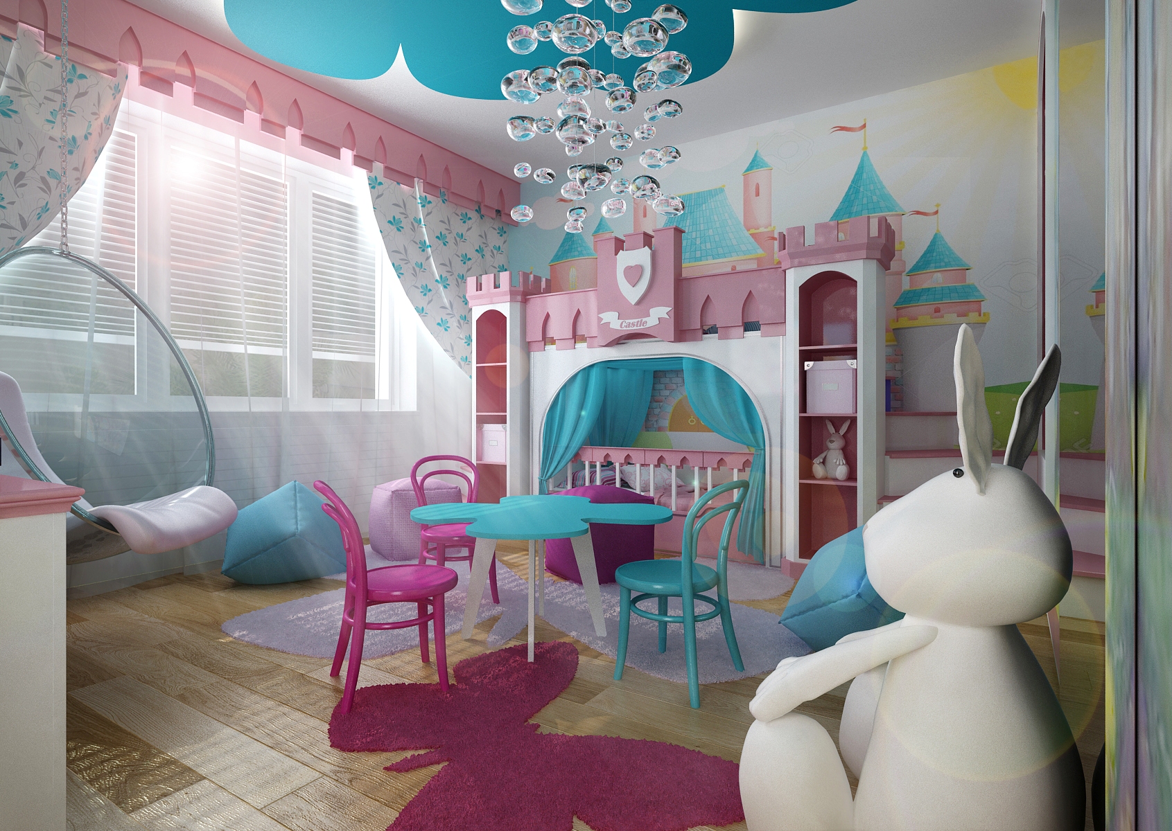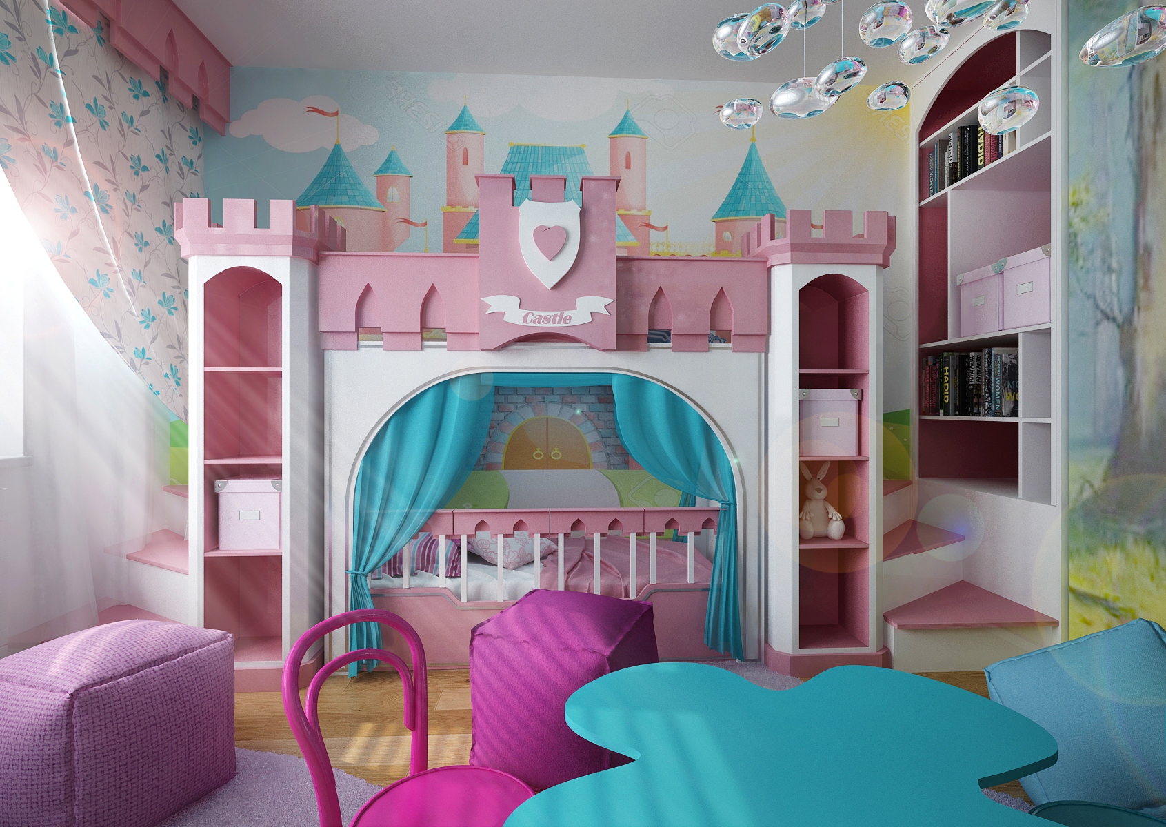 Princeznovský pokojíček je určitě snem každé malé holčičky. V tomhle je postýlka s nebesy, kde má konstrukce podobu hradu i s pochůzným patrem- hradbami. Bezpečnostní zábranu tvoří otvírací vrátka. Kulisa hradu je vyrobena z MDF desek stříkaných růžovým a bílým lakem. Velkoformátová tapeta dotváří zbytek hradu a nechybí i pohádkové záclonky. Holčičí růžovou doplňuje moderní tyrkysová barva. Z typovek můžeme vyzdvihnout dětské židle č. 14 od TONu, transparentní houpačka Bubble Chair a moderní křišťálový lustr.