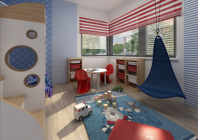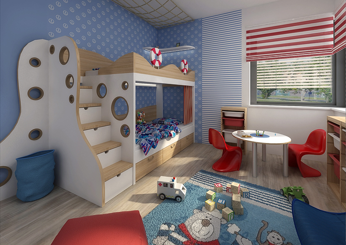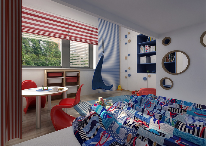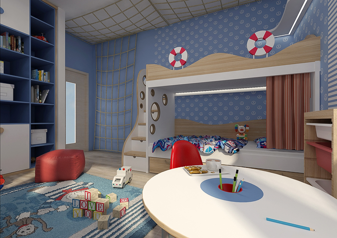 Dětský pokojíček pro malého námořníka. Patrová postel ala námořní loď: v podpalubí kajuta na spaní a nahoře paluba odkud může kapitán plánovat další dobrodružství. Pokoj je laděný do námořnických barev – červená, modrá a bílé. V místnosti se vyskytují pruhované tapety a závěsy a zajímavým prvkem e provazová síť na stěně a stropu táhnoucí se od vchodu až k posteli.
