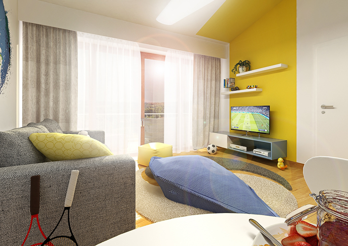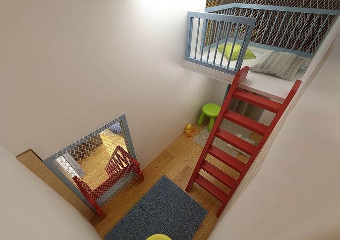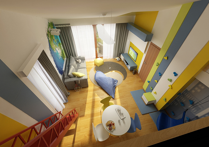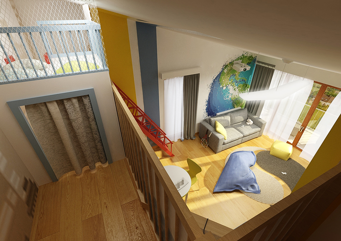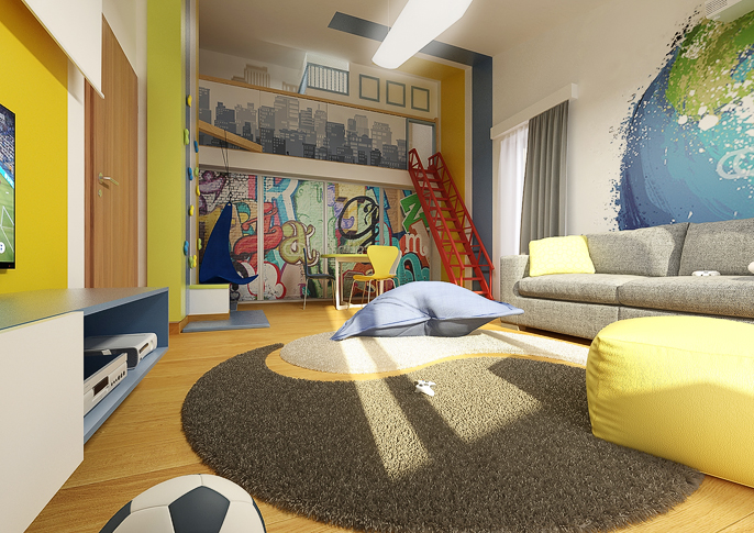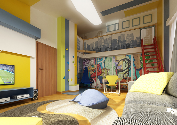 Na stěnách a dveřích skříní jsou originální tapety s motivy zeměkoule a grafity. Zábradlí balkonku je zase stylově zakryto panely s grafikou mrakodrapů, z nichž vychází dětský domeček, do kterého je přístup po červeném ala požárním žebříku. Samozřejmě nechybí TV, lezecká stěna, houpačka,...