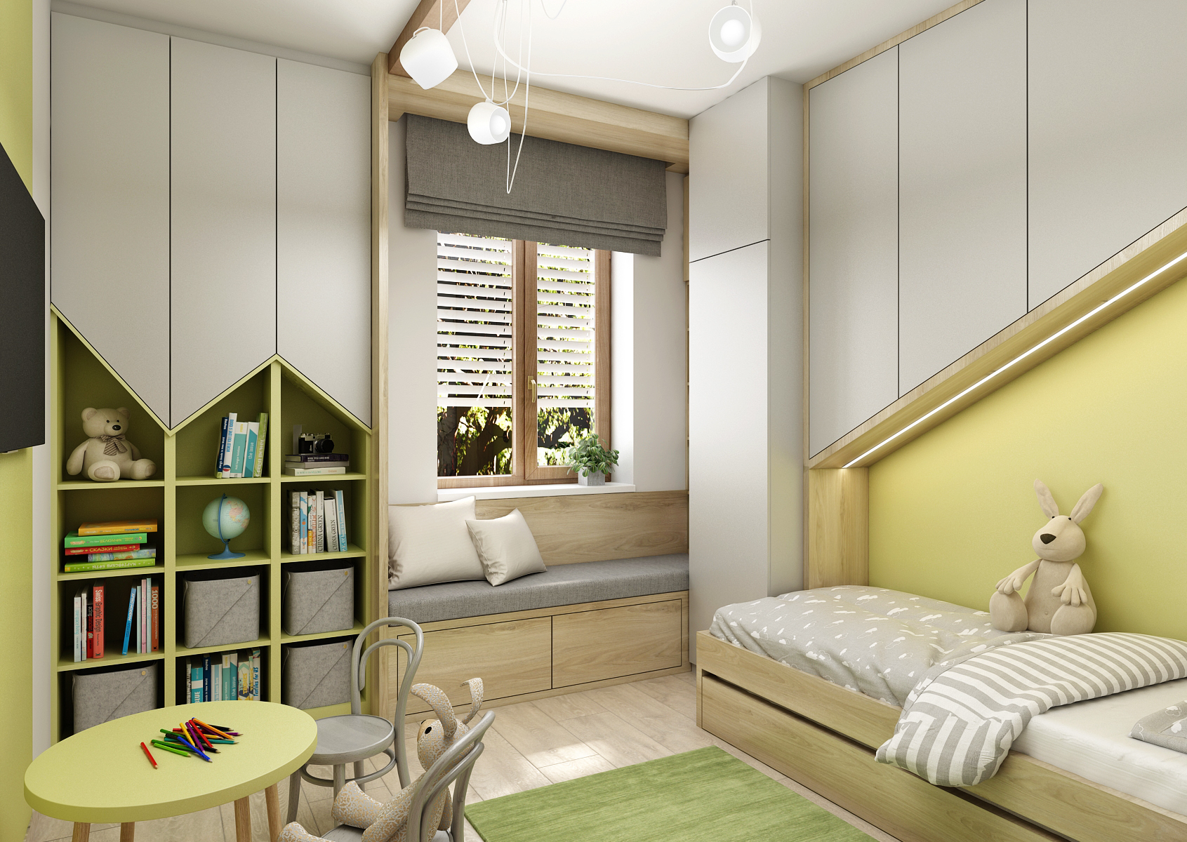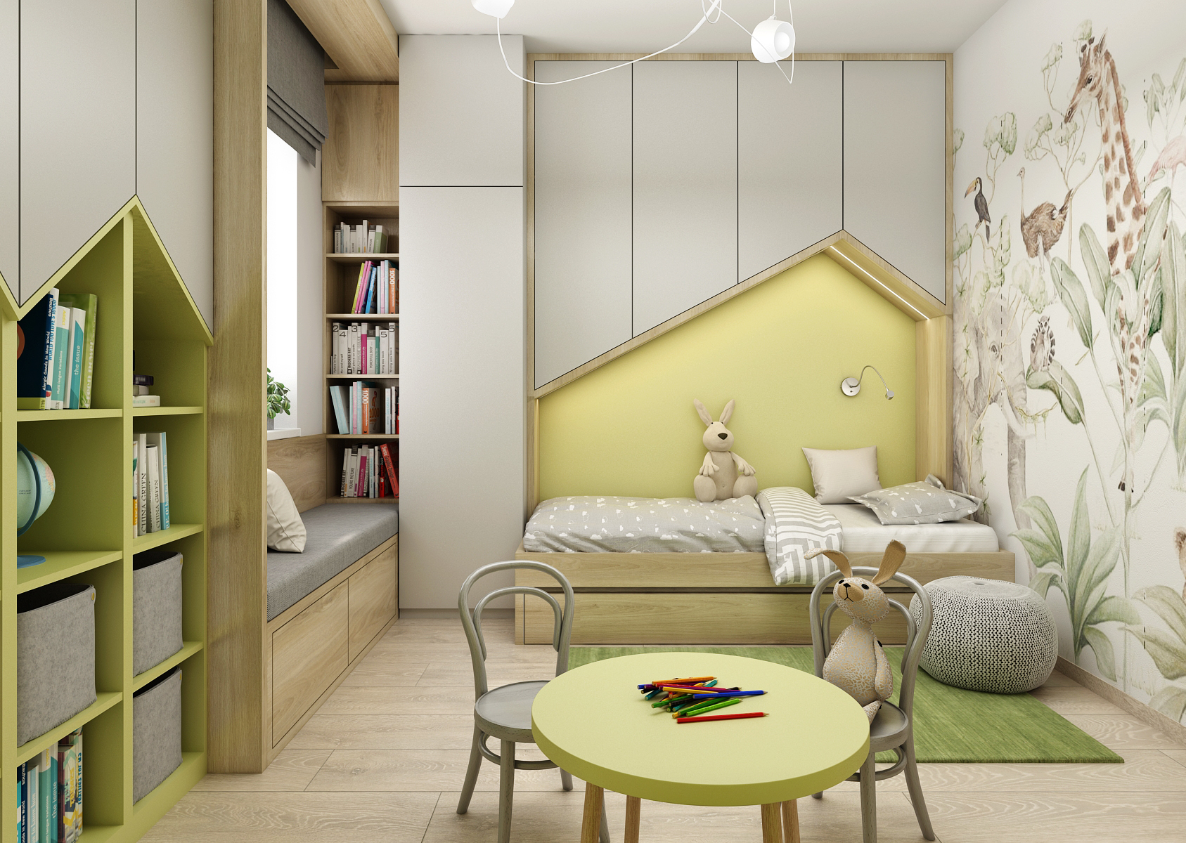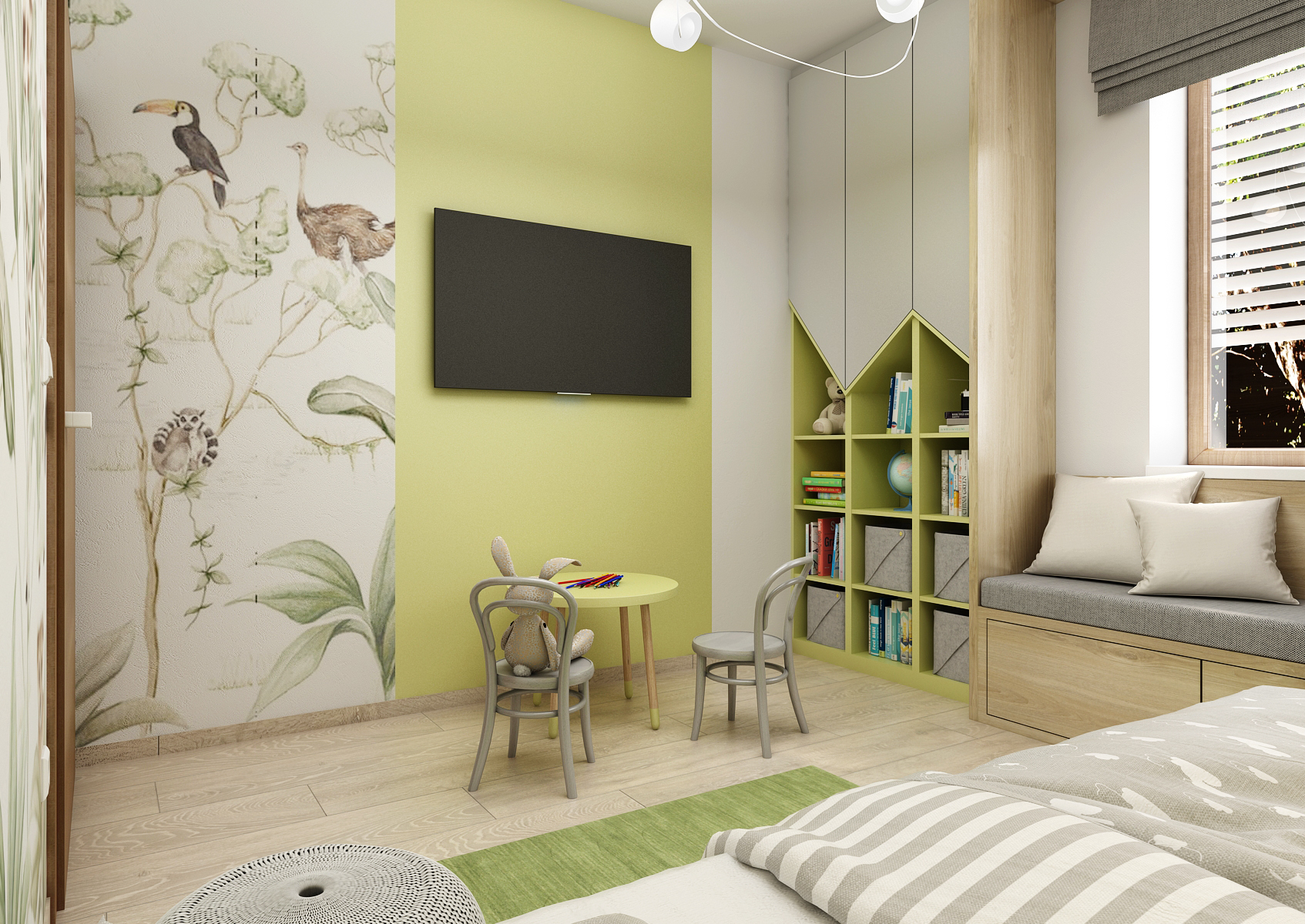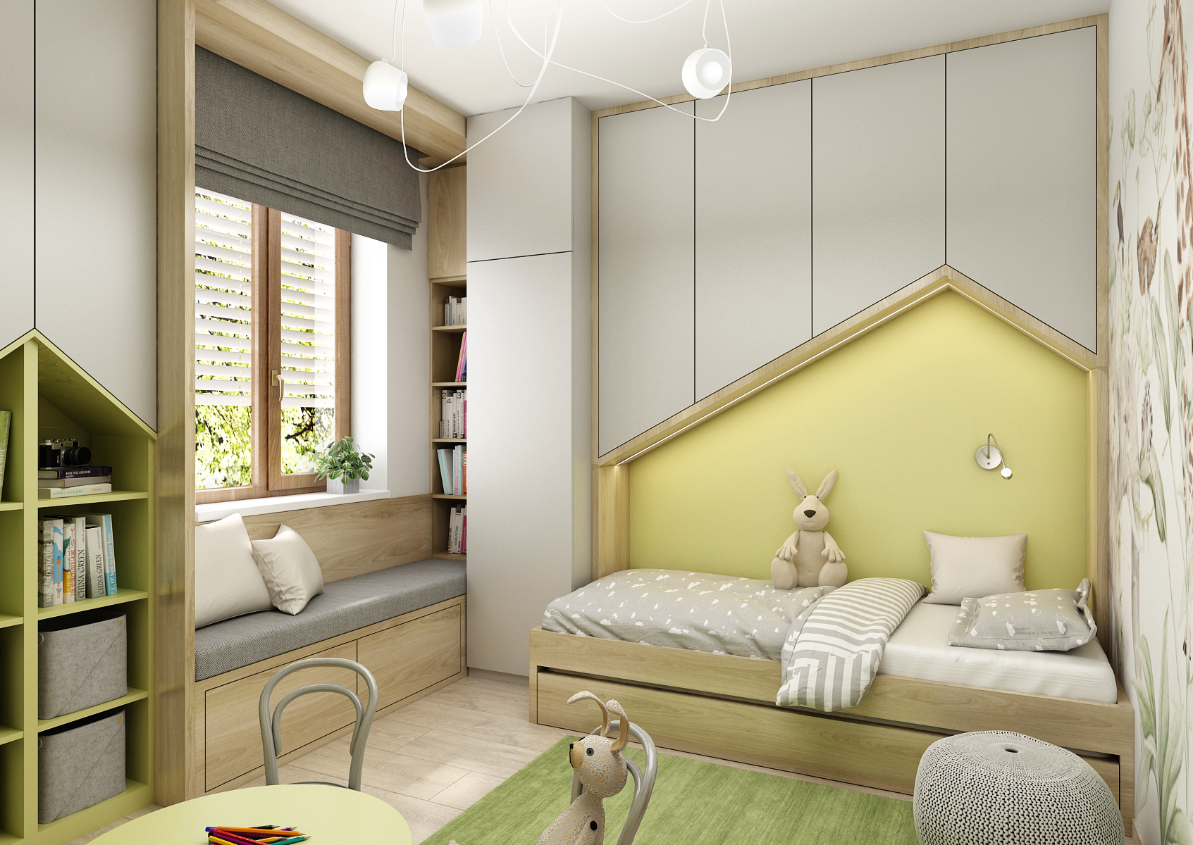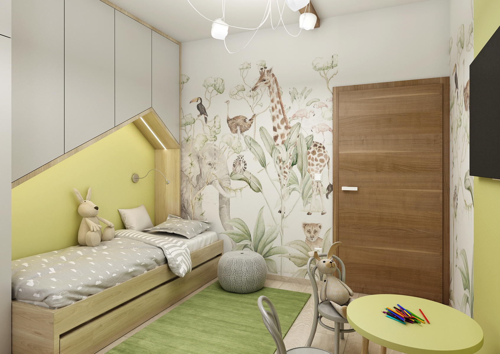 Prostor je zpestřen tapetou s motivy zvířat. Zajímavým prvkem v pokojíku je lůžko, které je zasazeno do výklenku vestavěné skříně ve tvaru domečku. Nad pomyslnou stříškou, která lůžko osvětluje díky LED pásku, se nachází hned několik úložných prostorů za dvířky.