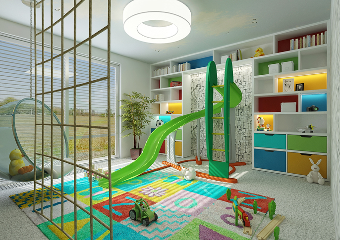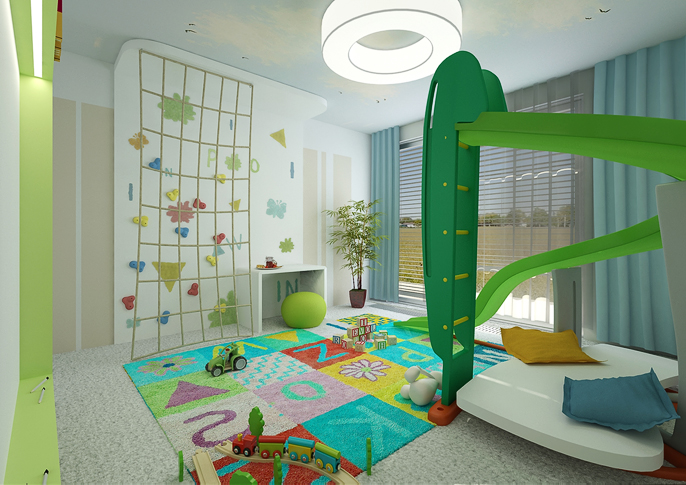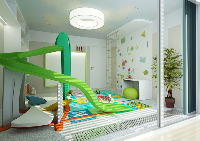 Herna pro dvě děti obsahuje mnohé zábavné prvky a i při rozmanité barevnosti je vzdušná, což umocňuje malba na stropě s motivem nebe a letících ptáků. Vedlejší místnost dětského pokoje je tmavší a klidnější, ale stále vzletná díky užitým organickým tvarům.